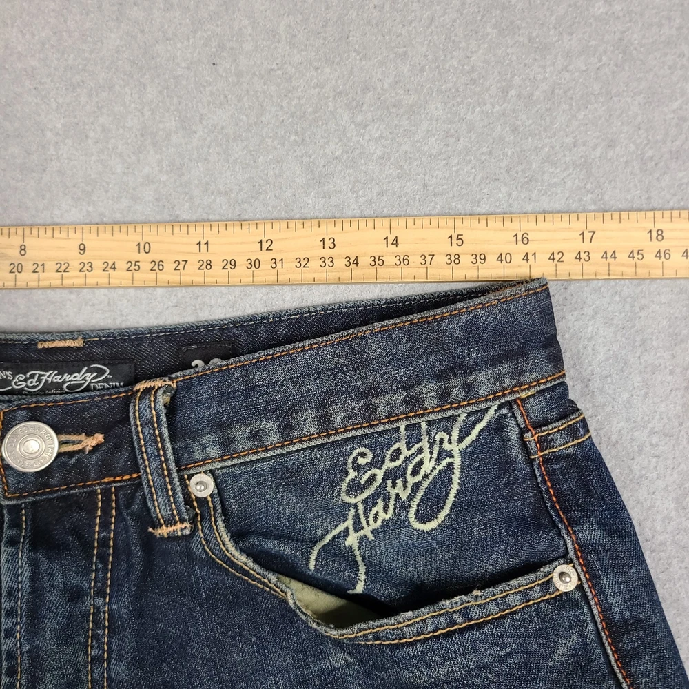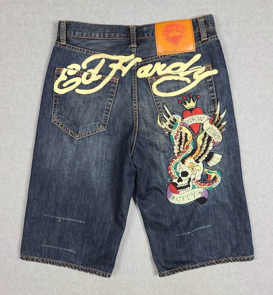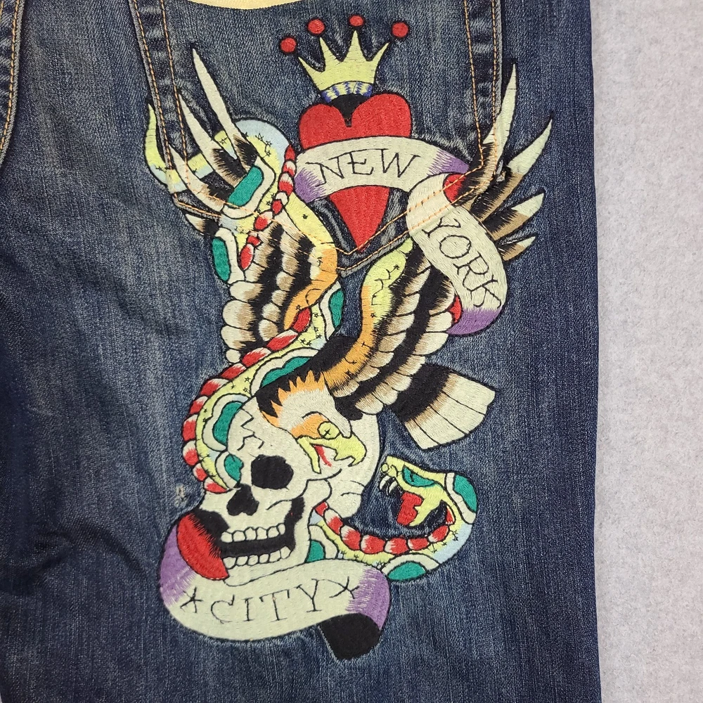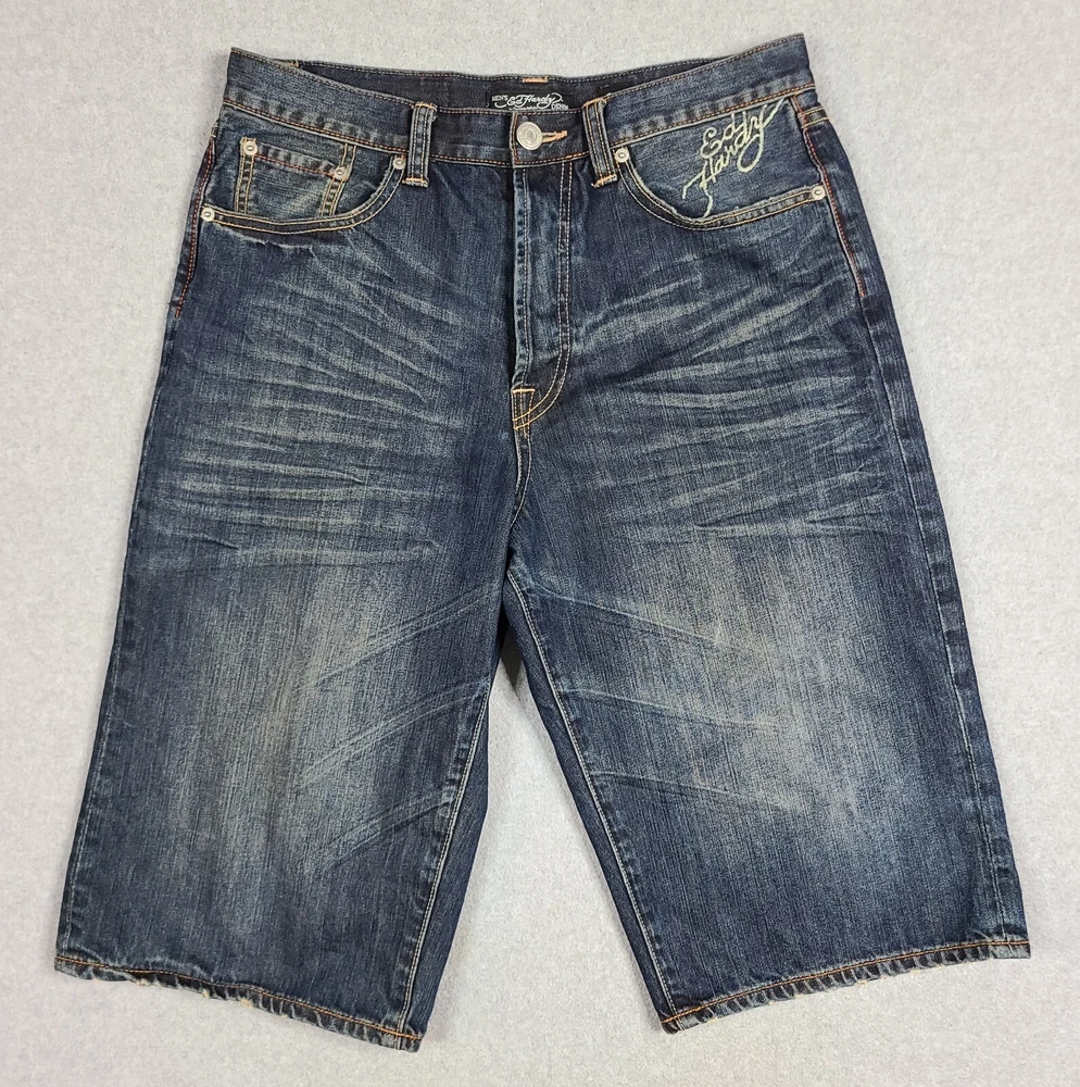 Some small holes in the back. Please see ALL pictures before purchasing. Get ready to embrace the vintage vibe with these Ed Hardy Y2K New York City embroidered jean shorts. The solid blue color and distressed denim fabric make them perfect for travel, casual wear, or workwear. These Bermuda-style shorts come with a flat front and a button closure, making them easy to wear and comfortable. The relaxed fit and 5-pocket design of these shorts make them perfect for carrying your essentials while on the go. The embroidered logo adds a unique touch to these shorts, making them stand out from the rest. These shorts are machine washable and easy to care for, making them a practical addition to your wardrobe.