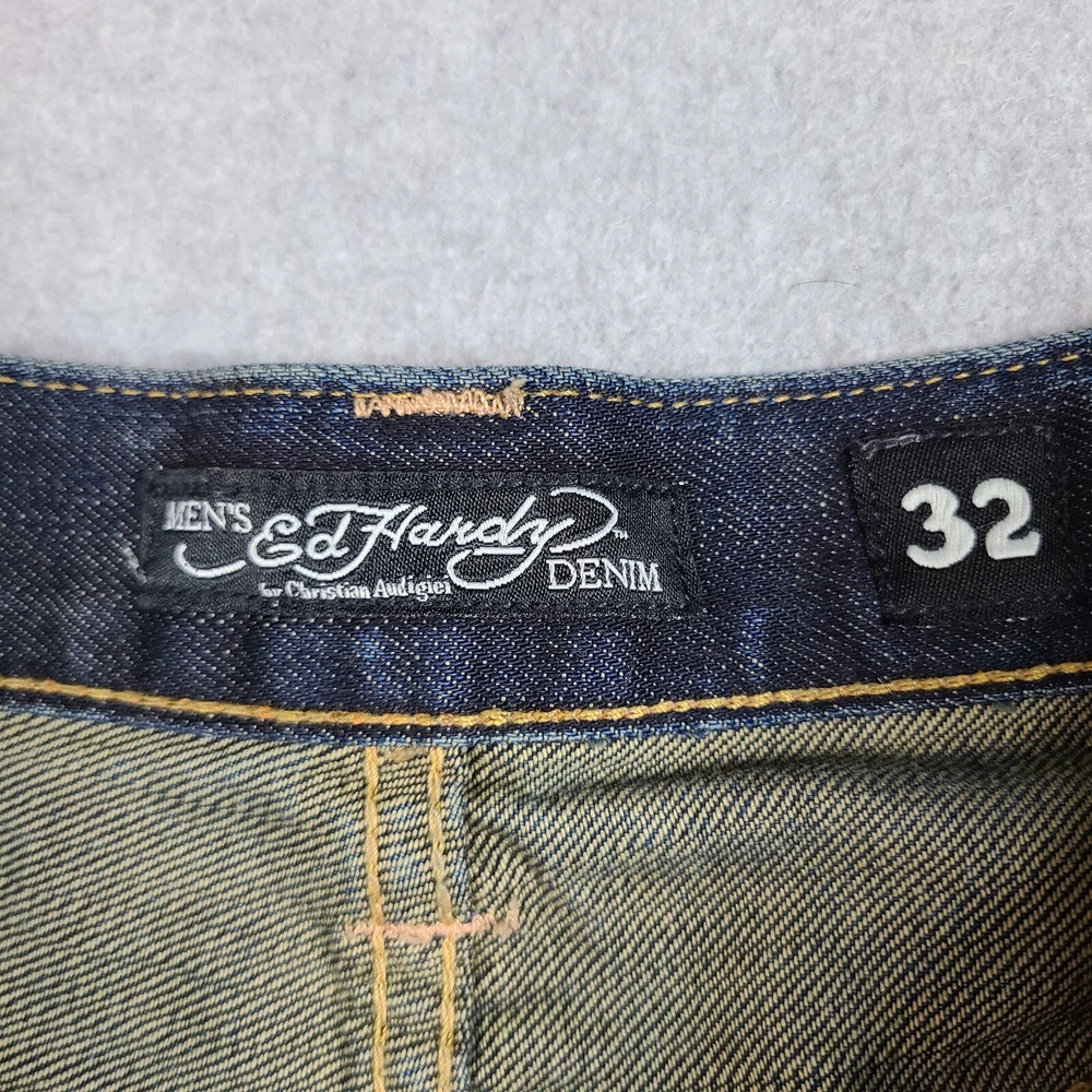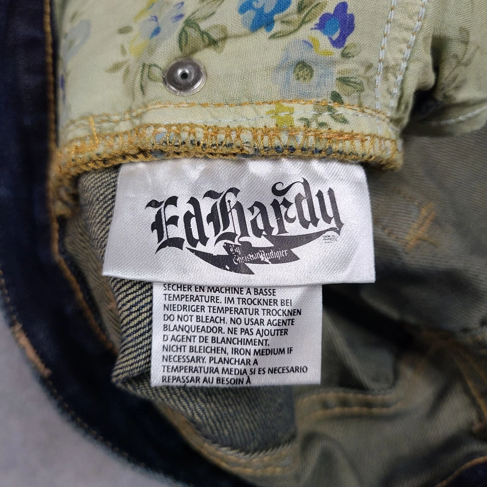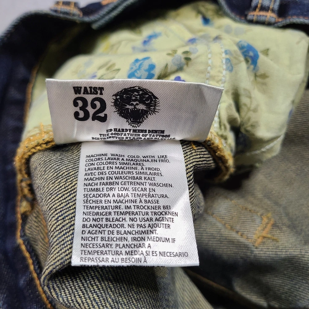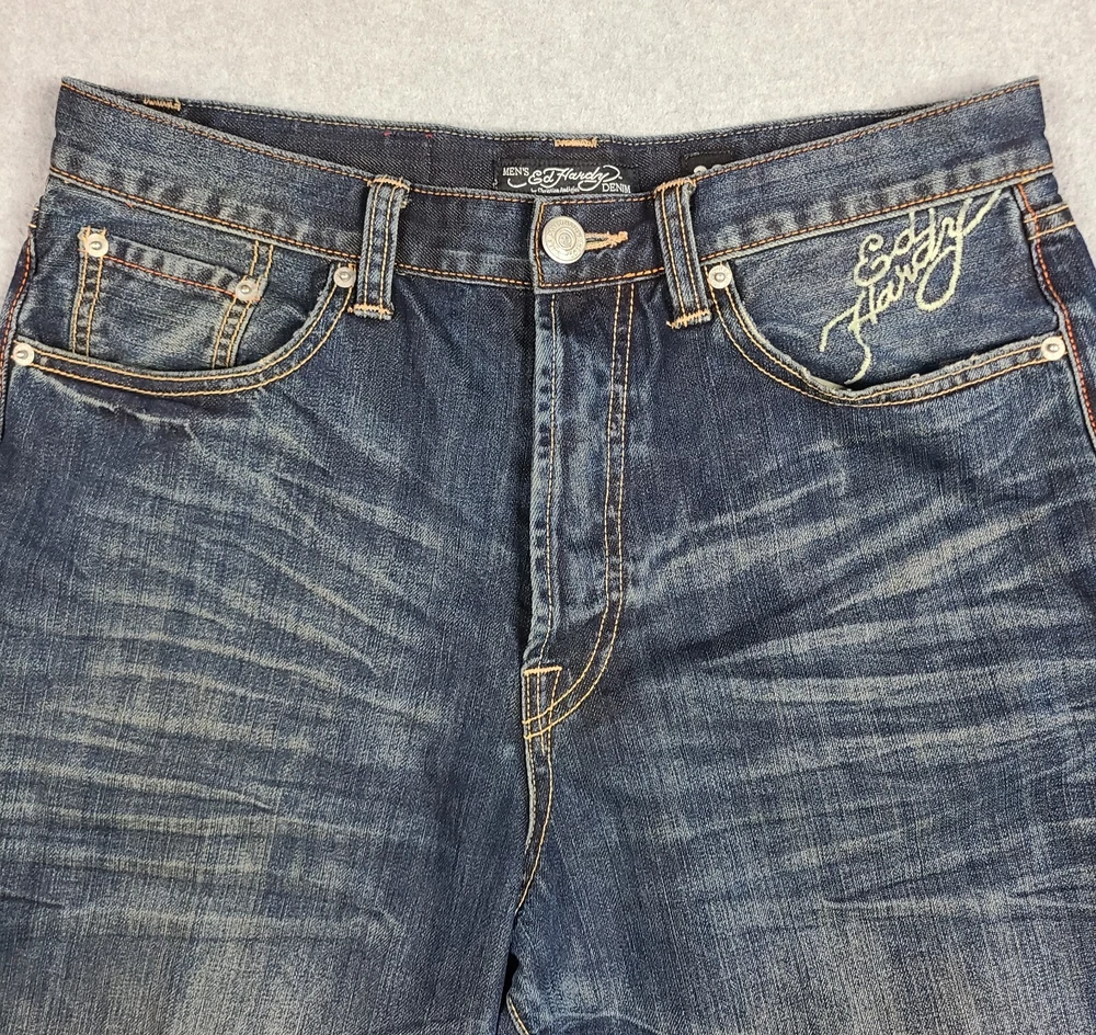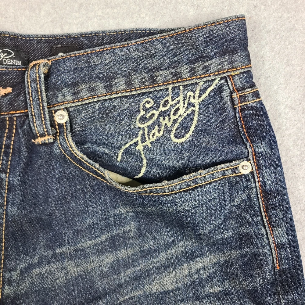 Some small holes in the back. Please see ALL pictures before purchasing. Get ready to embrace the vintage vibe with these Ed Hardy Y2K New York City embroidered jean shorts. The solid blue color and distressed denim fabric make them perfect for travel, casual wear, or workwear. These Bermuda-style shorts come with a flat front and a button closure, making them easy to wear and comfortable. The relaxed fit and 5-pocket design of these shorts make them perfect for carrying your essentials while on the go. The embroidered logo adds a unique touch to these shorts, making them stand out from the rest. These shorts are machine washable and easy to care for, making them a practical addition to your wardrobe.