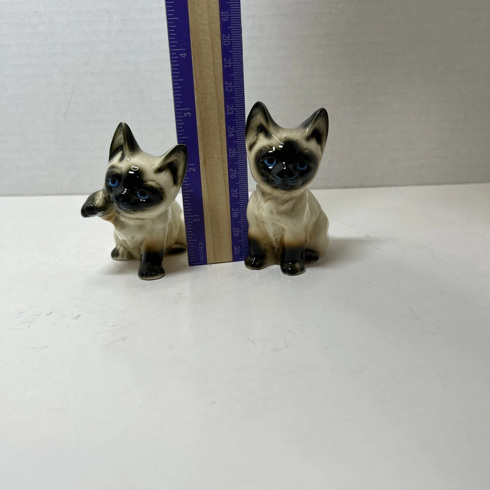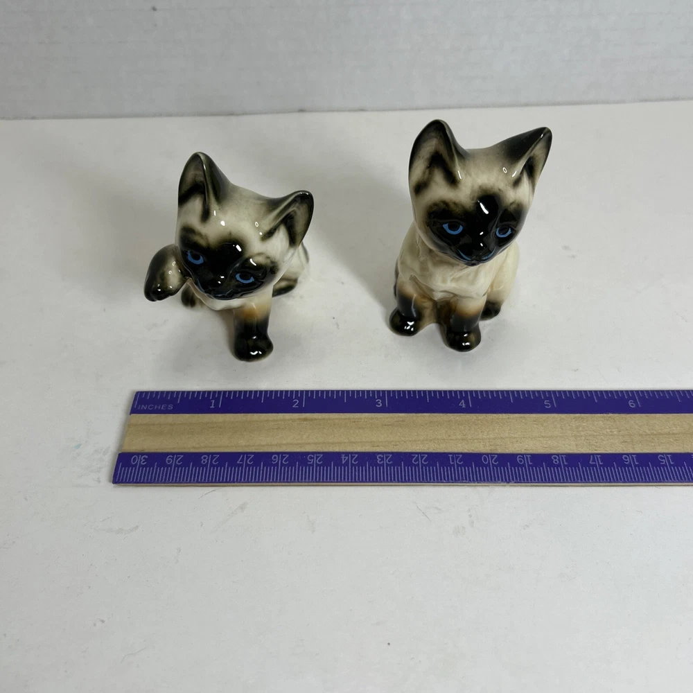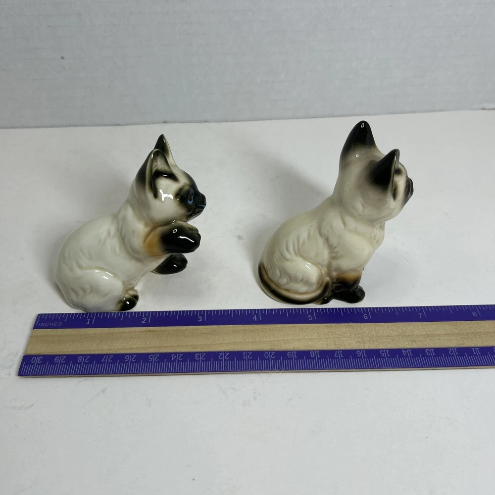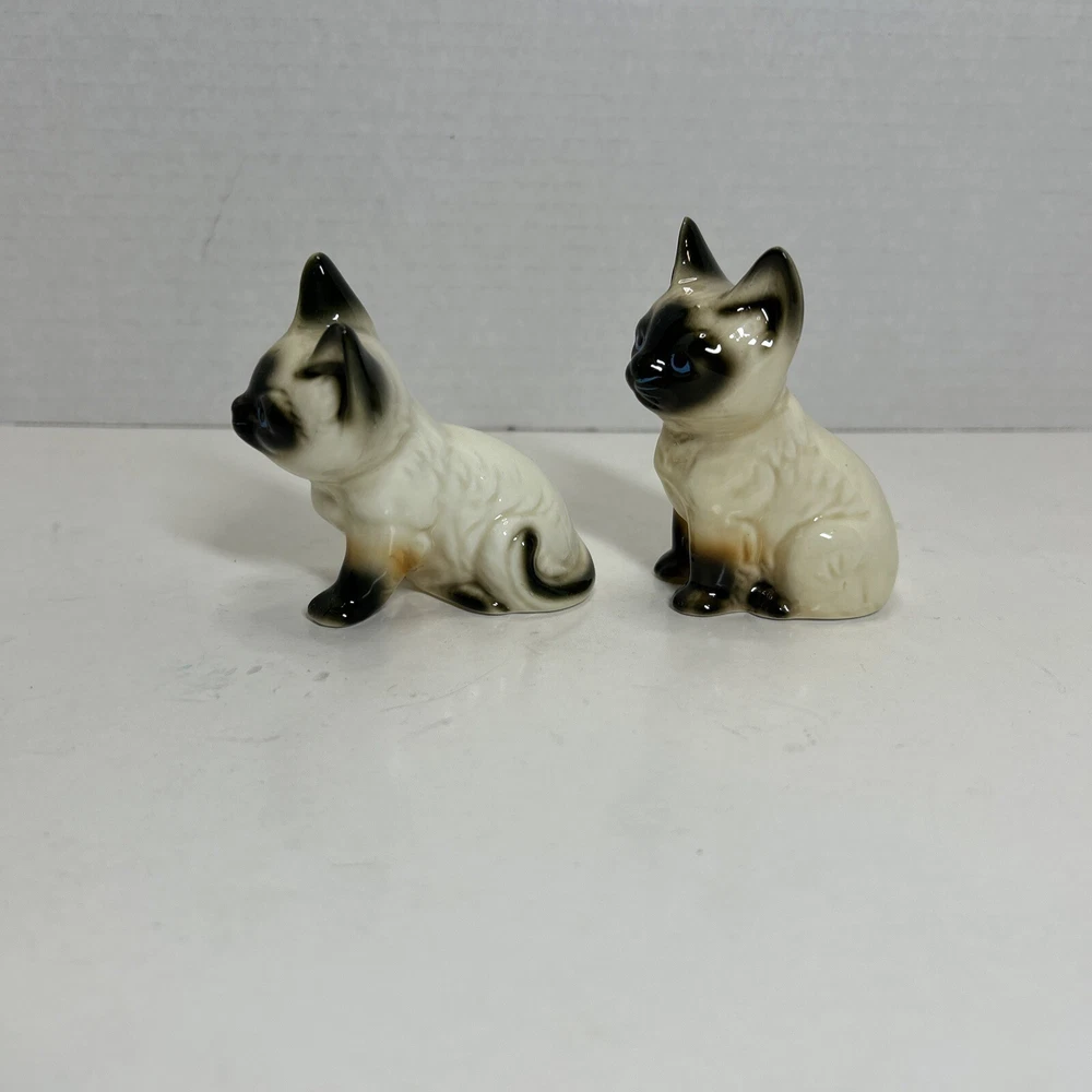 Set of 2 Enesco Siamese blue eyes kittens cats bone chine porcelain. Glossy finish cold painted eyes and blue whiskers Each is about 3 inches tall and about 2 inches in length and about 2 inches wide No chips and no cracks