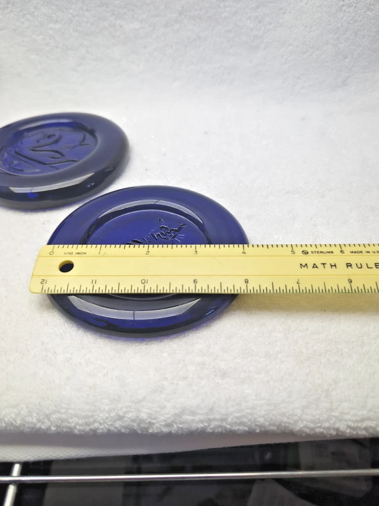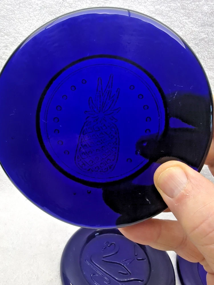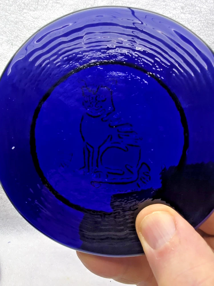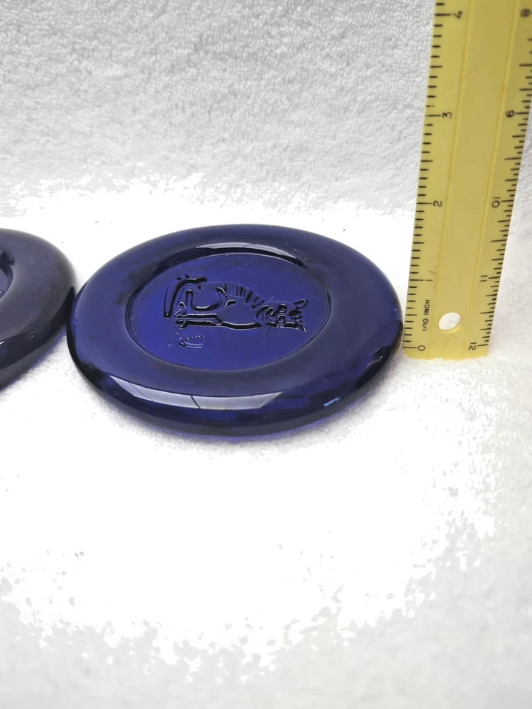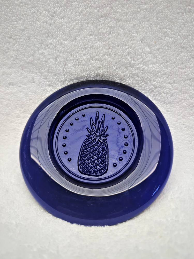 These vintage Erik Hoglund Kosta Boda glass ashtray/ paperweight features a unique cobalt blue color and a round shape with a diameter of 4 inches. Handmade in Sweden during the 1960s, this art glass piece is a part of the animal product line by Kosta Boda, known for its Mid-Century Modern style. These ashtray/ paperweights are decorated with four different designs, showcasing the craftsmanship and originality of Swedish glassmaking tradition. Cat/Swan/Pineapple/Eagle Head.