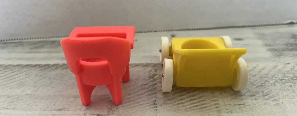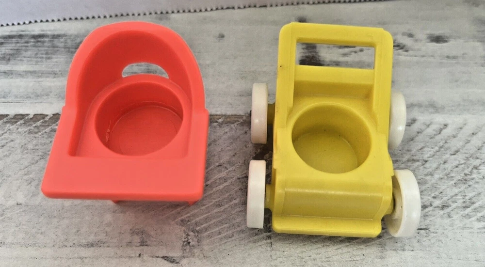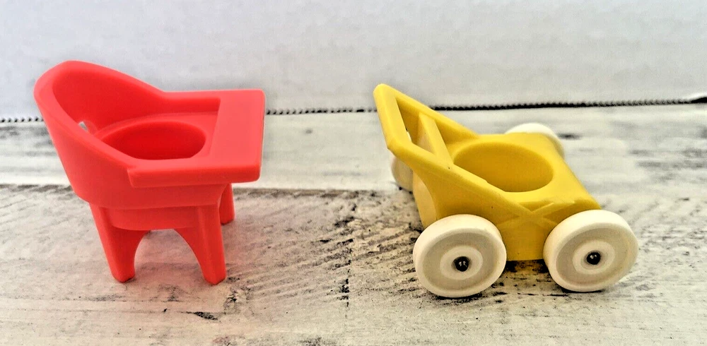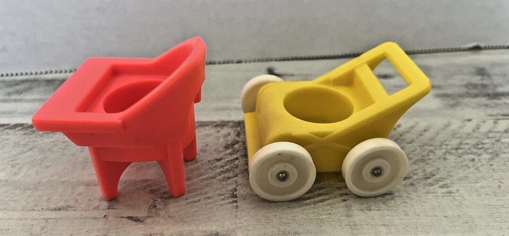 Vtg Fisher Price Little People Red Baby High Chair and Yellow Stroller