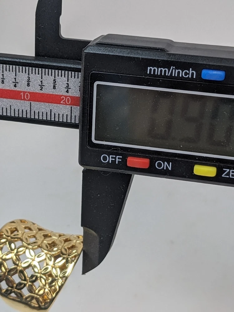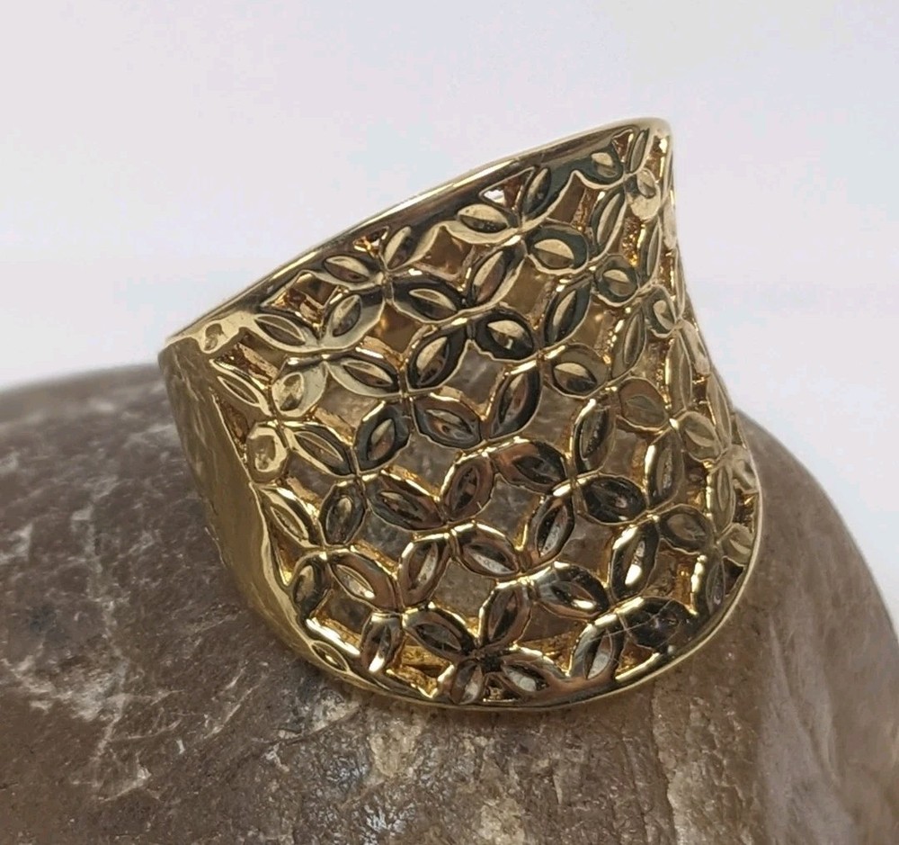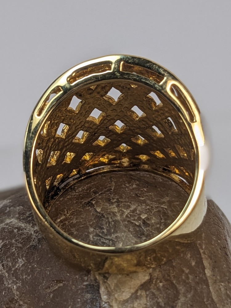 Vintage gold vermeil 925 woven concave cigar band ring featuring an intricate floral design. This bold statement piece has a wide, sculpted face and rich golden finish, offering substantial presence and a luxe, vintage look. Openwork lattice of small, petal‑shaped elements arranged to resemble stylized flowers across the front panel. Highly polished surfaces catch the light, while the recessed areas create contrast and emphasize the woven floral pattern. The design evokes a mix of modern and vintage aesthetics, making it versatile for both casual and dressy wear. Crafted in sterling silver with a gold vermeil finish, combining durability with a warm golden appearance. Interior of the band is stamped “CANADA” and “925,” indicating Canadian origin and sterling silver content. Solid construction with a smoothly finished inner shank for comfortable wear despite the ring’s bold width. Ring size 10, ideal as a substantial everyday band or statement piece on the index, middle, or ring finger depending on hand size. Weight is approximately 9.58 grams, giving the ring a noticeable, quality feel without being overly heavy. Wide concave front offers generous finger coverage and a flattering wraparound effect. Good used condition with light surface wear consistent with gentle vintage use. Gold vermeil retains attractive shine, and the floral lattice pattern remains crisp and well‑defined. No major damage noted, making it suitable for continued wear or addition to a vintage jewelry collection.