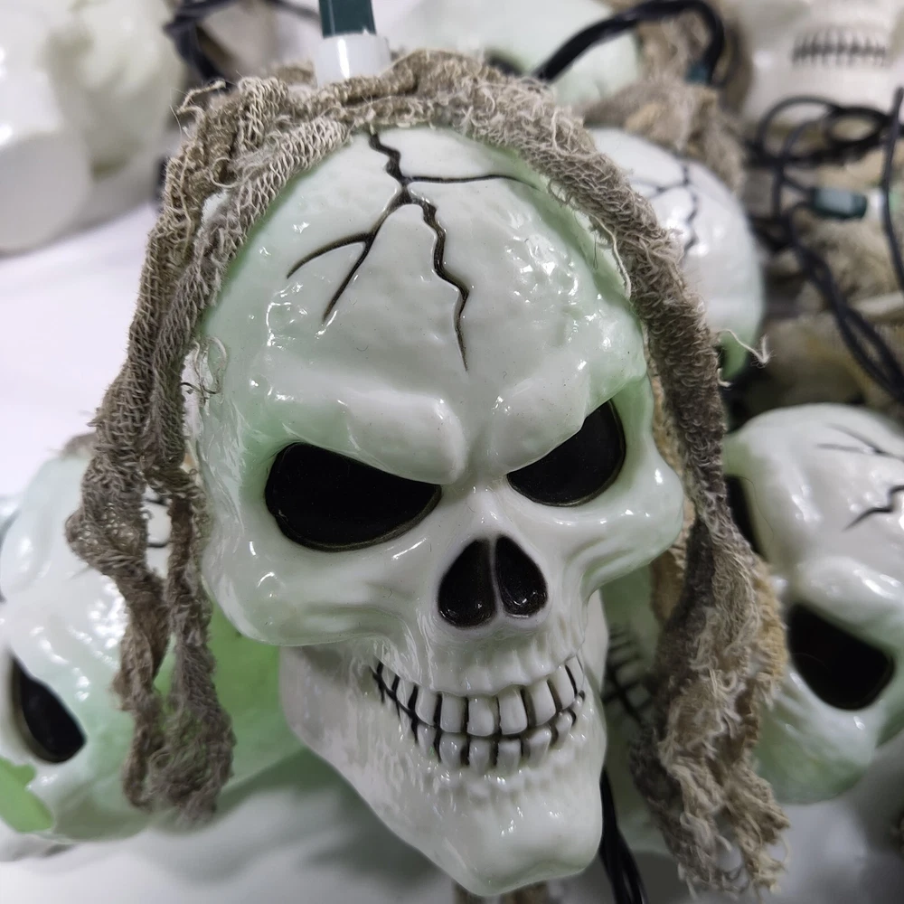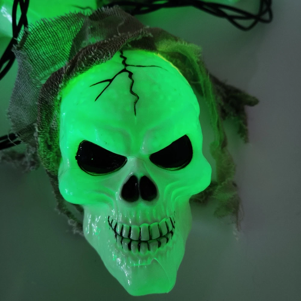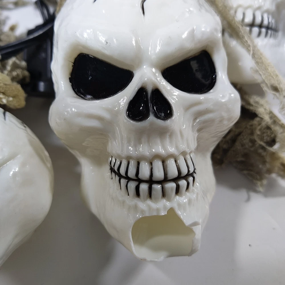- Halloween string lights w' 9 blow mold white skulls - each embellished w' spooky gauze material - green lights, green cord - each skull is 4.5" tall - light string is 160" long CONDITION: All lights in working condition. NOTE: one skull is missing & 2 have damage. Pls. see provided pics. SHIPPING : Tracked and insured shipping. US orders ship via USPS
