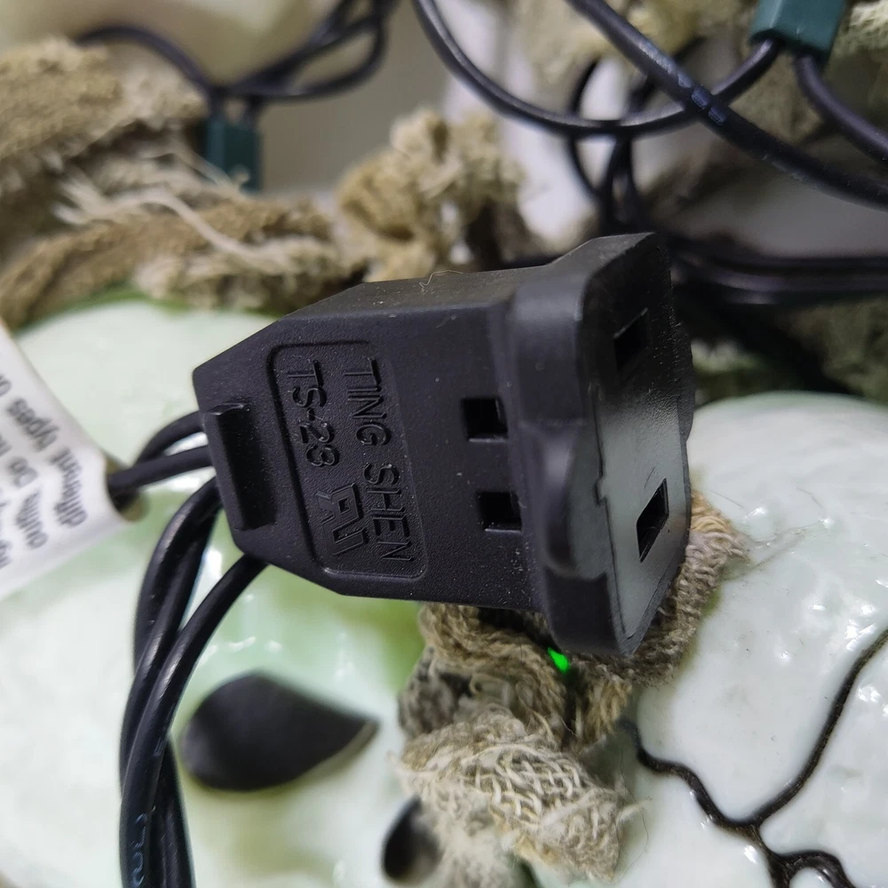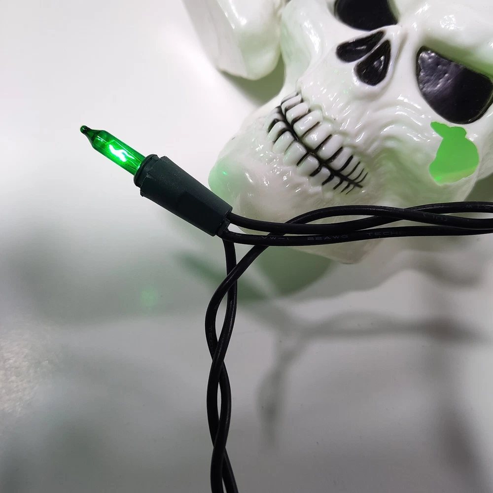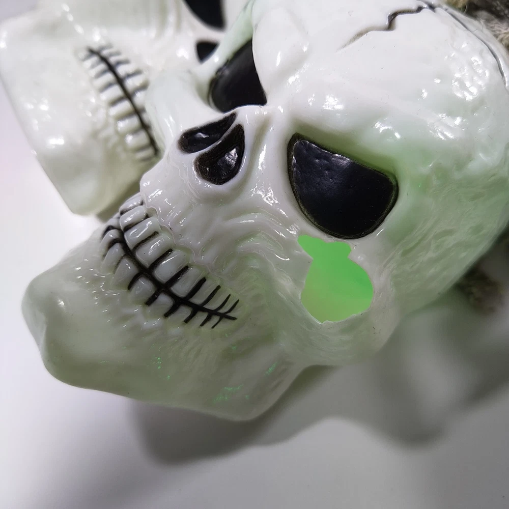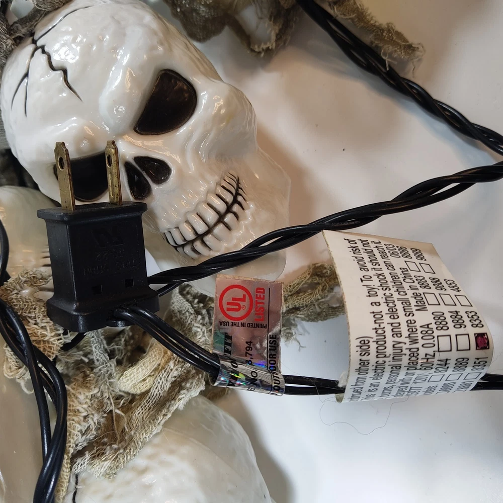 - Halloween string lights w' 9 blow mold white skulls - each embellished w' spooky gauze material - green lights, green cord - each skull is 4.5" tall - light string is 160" long CONDITION: All lights in working condition. NOTE: one skull is missing & 2 have damage. Pls. see provided pics. SHIPPING : Tracked and insured shipping. US orders ship via USPS