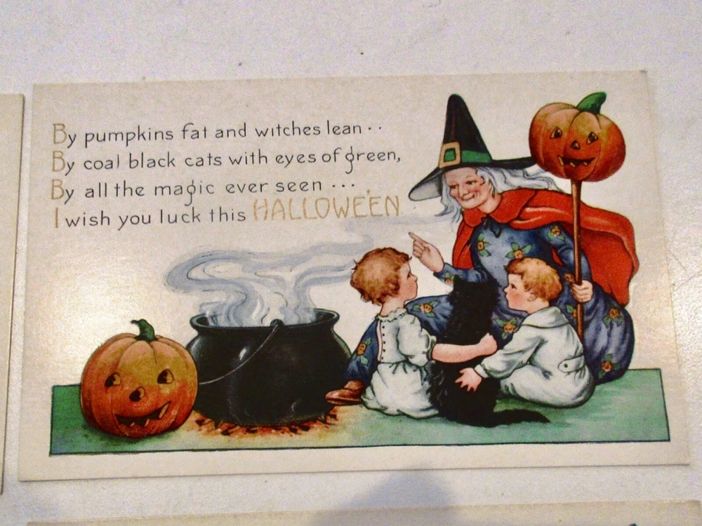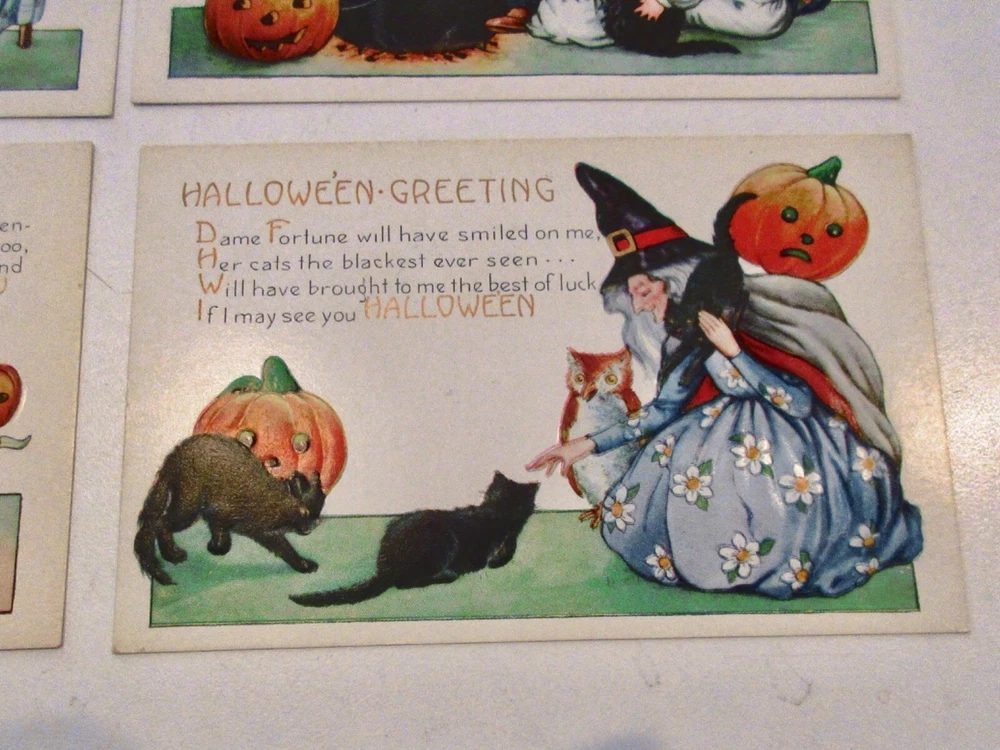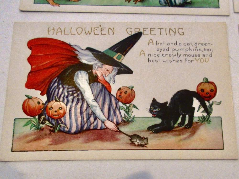 I will be selling vintage postcards from a Halloween postcard collection-no repros. Listings will be done on Tuesdays around 5:45 P.M. Sold by AUCTION only; free shipping. Check photos for condition (embossed cards made shadows on the backs of cards).
