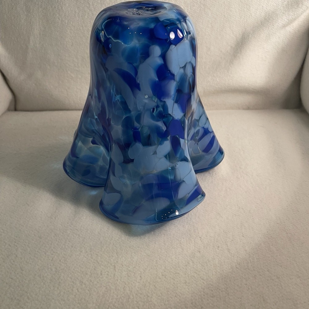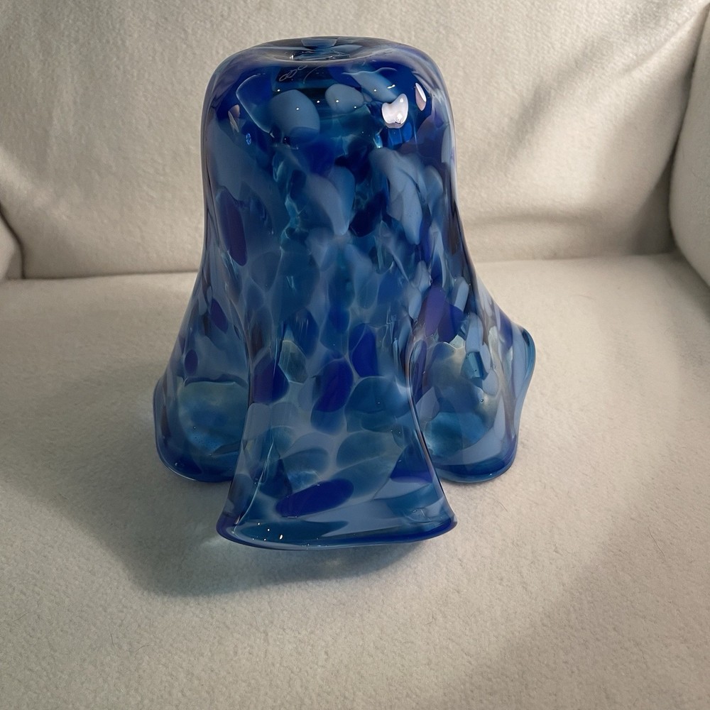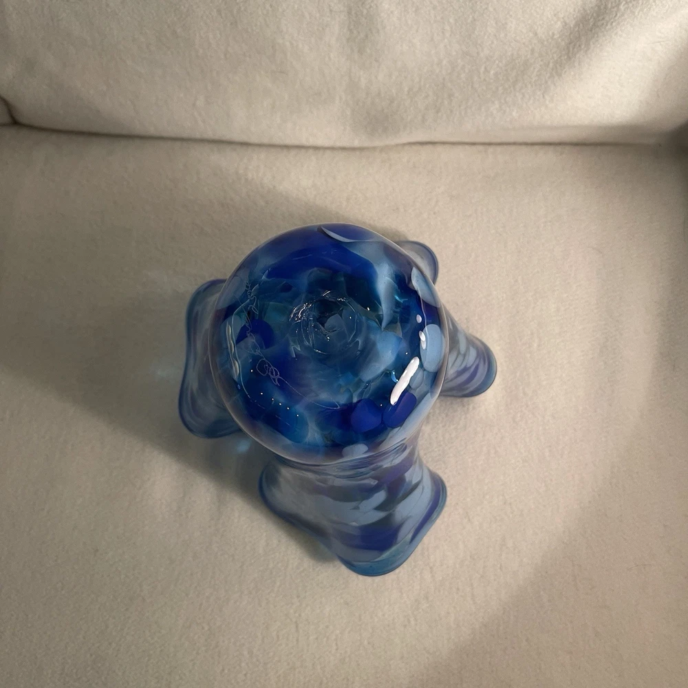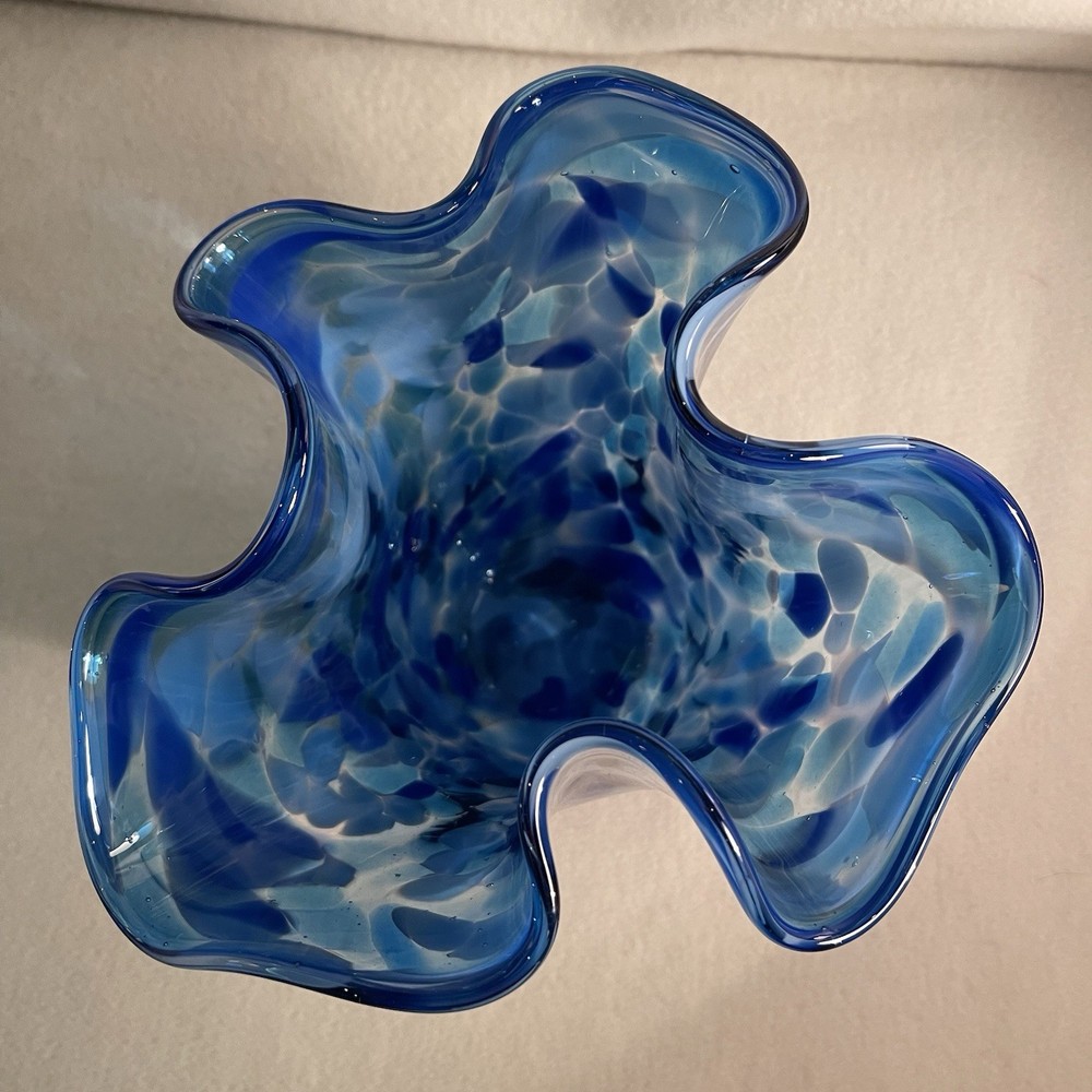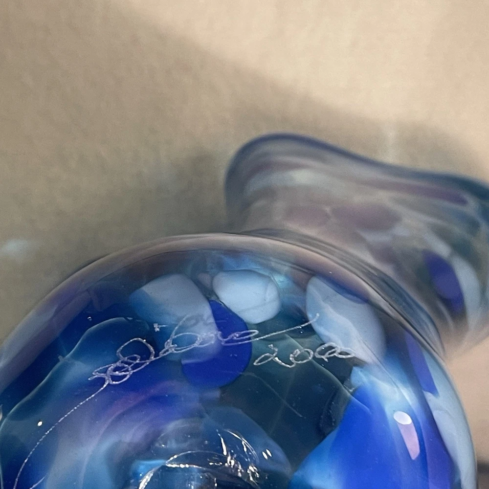 This vintage hand-blown art glass vase features a ruffled design in shades of blue and white, making it a unique and decorative piece for any space. Signed by the brand ArtGlass, this contemporary style vase is hand-molded and hand-blown, showcasing the artisan's skill and attention to detail. With a height of 7.25 inches and a weight of 2.4 lbs, this original piece from the 2000s is a stunning addition to any art glass collection. Made in the United States, this vase exudes a sense of artistry and elegance with its intricate design and beautiful colors. Excellent mint condition. This piece is from my personal collection and I have been the only owner. It has been in a curio cabinet and I have never used it. It is signed by the artist and dated 2000. I can’t read the signature so I don’t know who the artist is who made it.