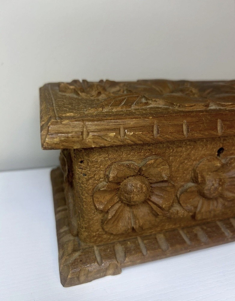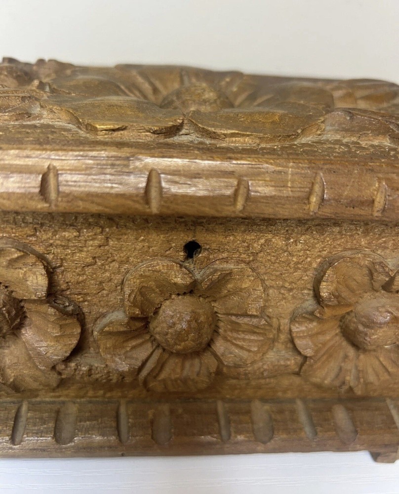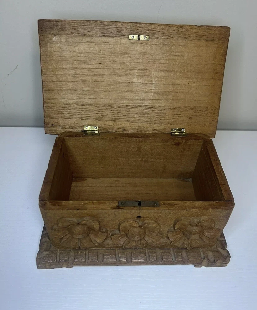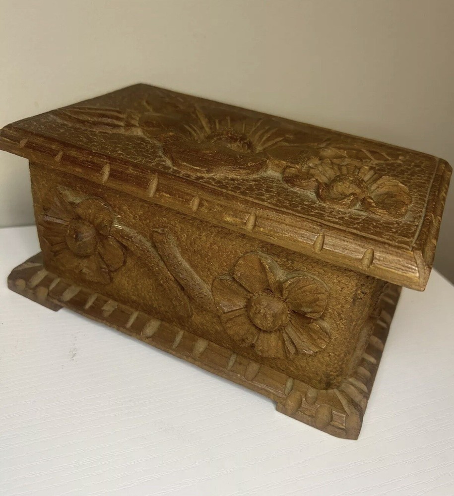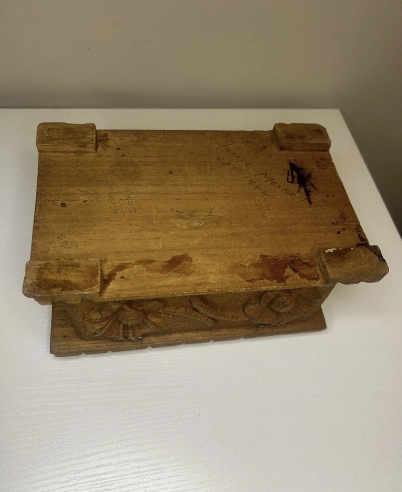 Vtg Hand Carved Wood Jewelry Box Keepsake Chest Hinged Hidden Key Mexico Open
