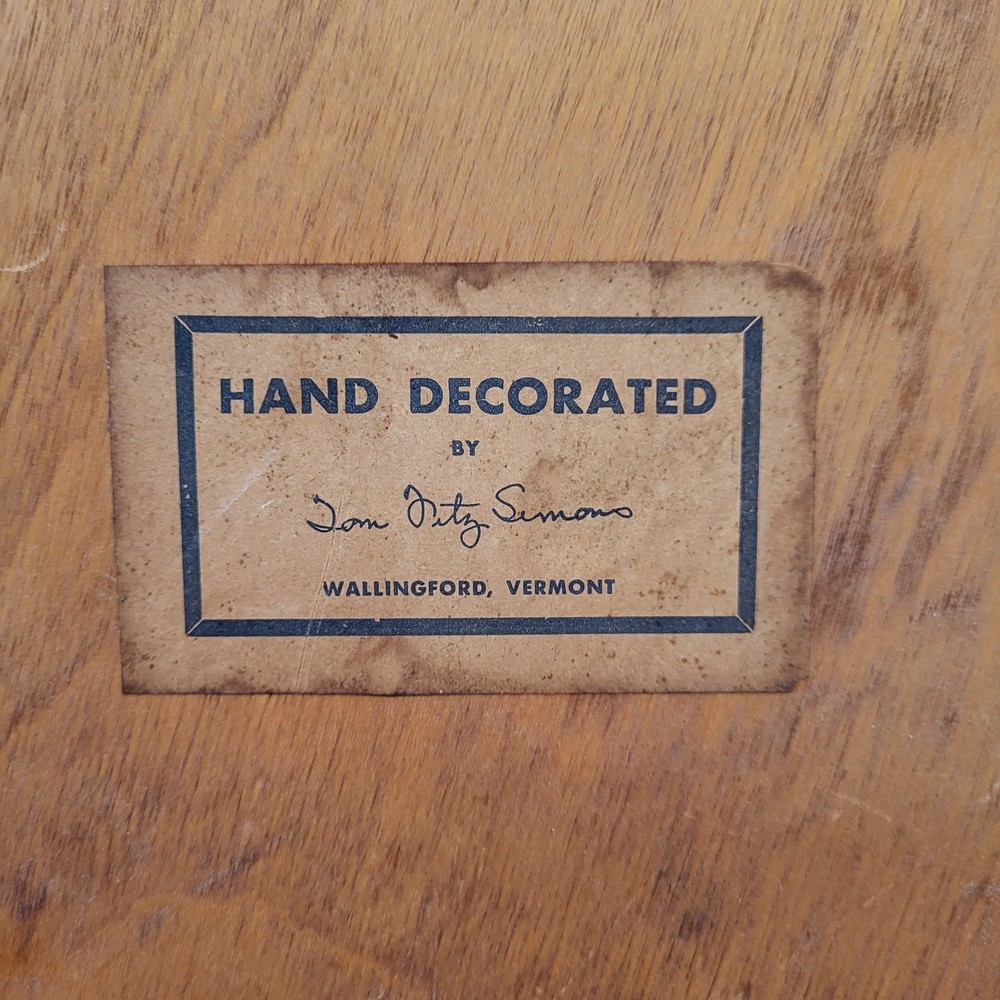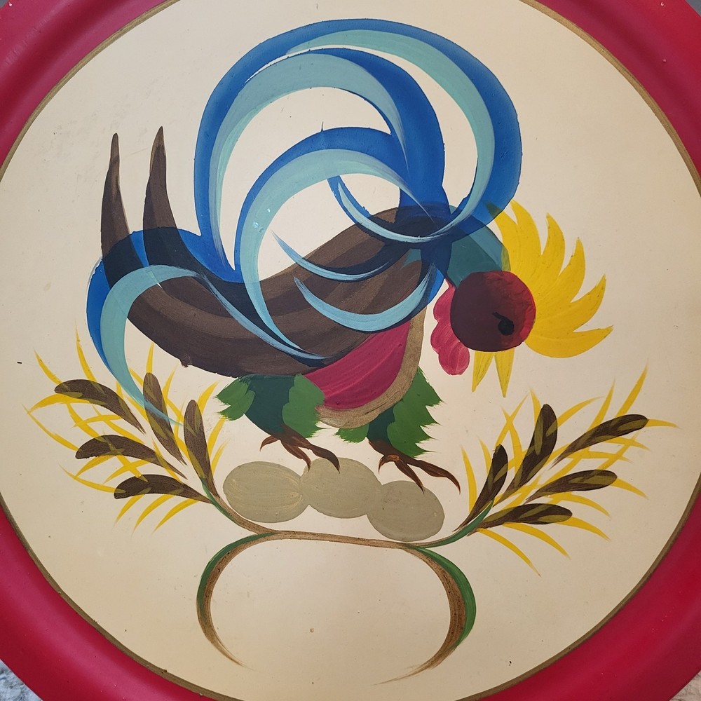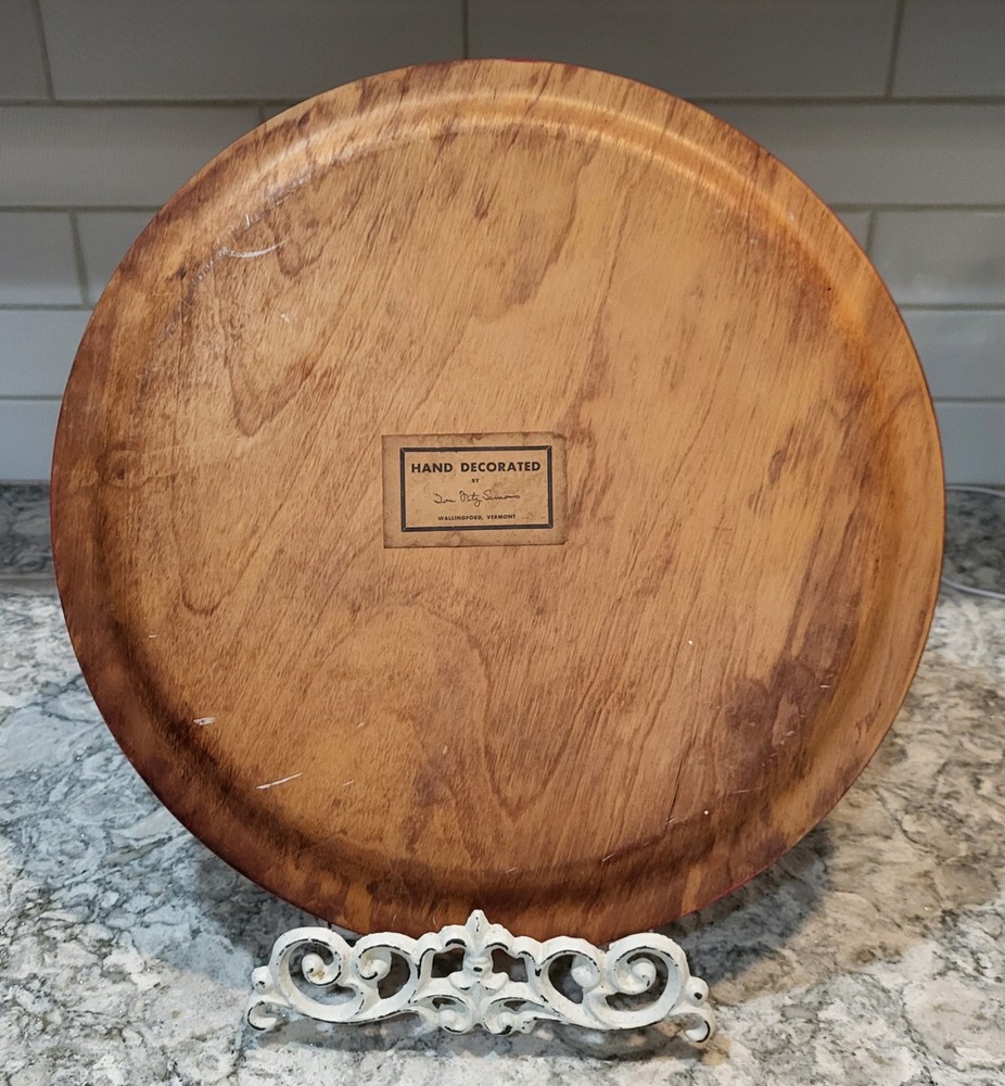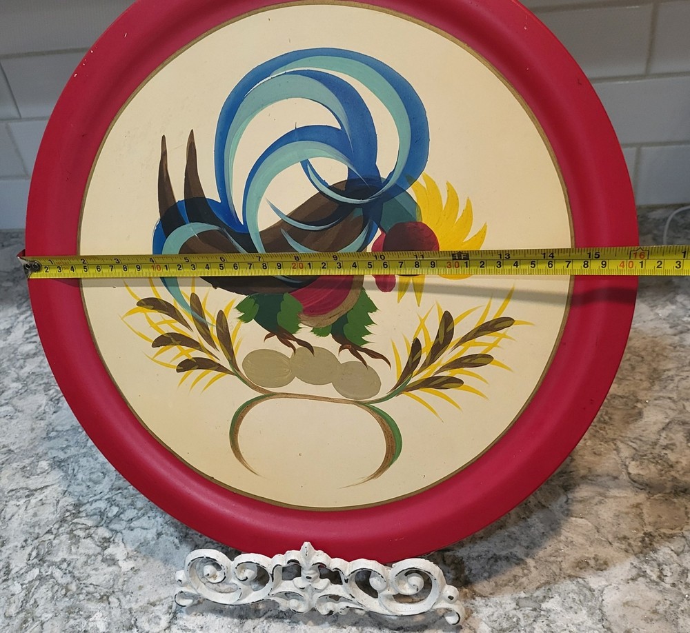 This vintage hand-painted 16" folk art wooden plate from Vermont features a colorful rooster design, perfect for adding a touch of country farmhouse charm to any space. The round plate is made of wood and showcases a multicolor bird theme, making it a unique and handmade decorative collector's item. With its folk art production style and United States origin, this plate is a stylish and eclectic addition to any home.