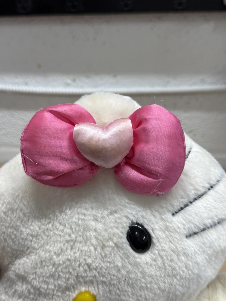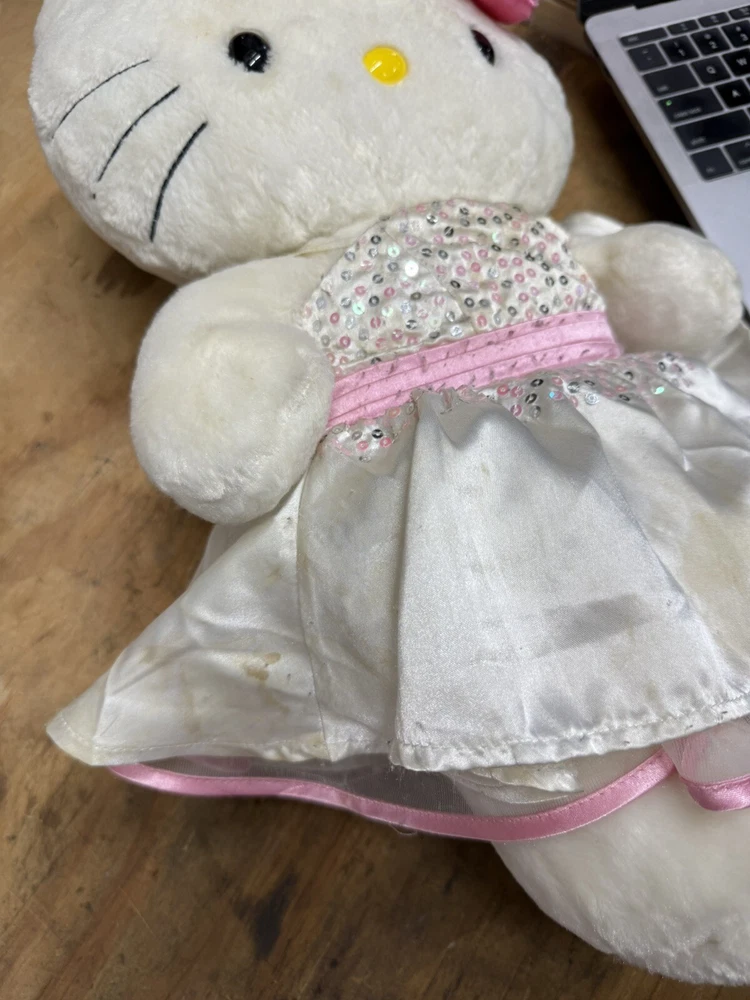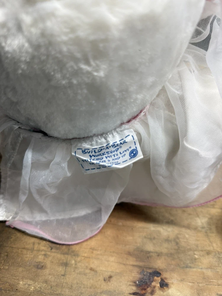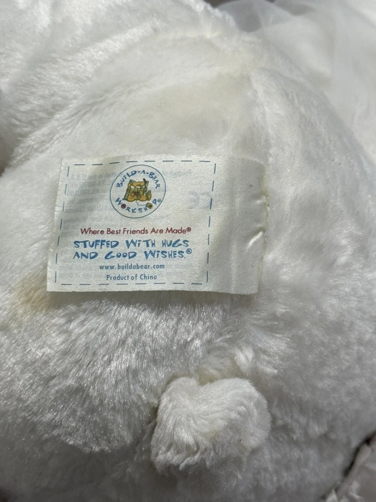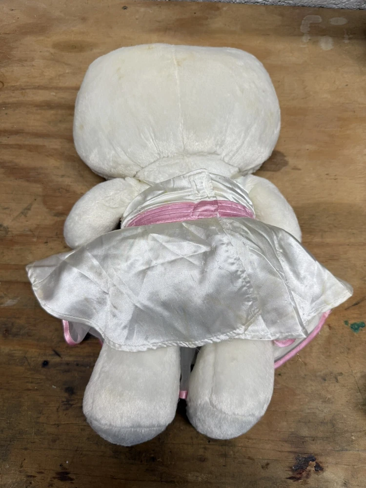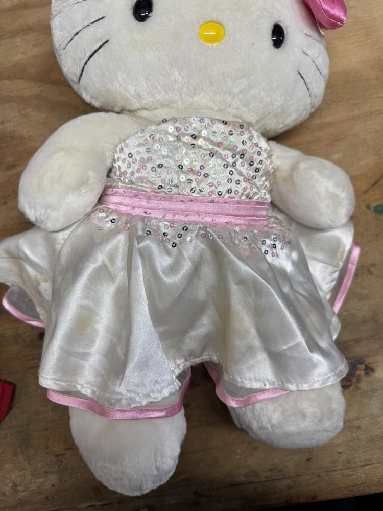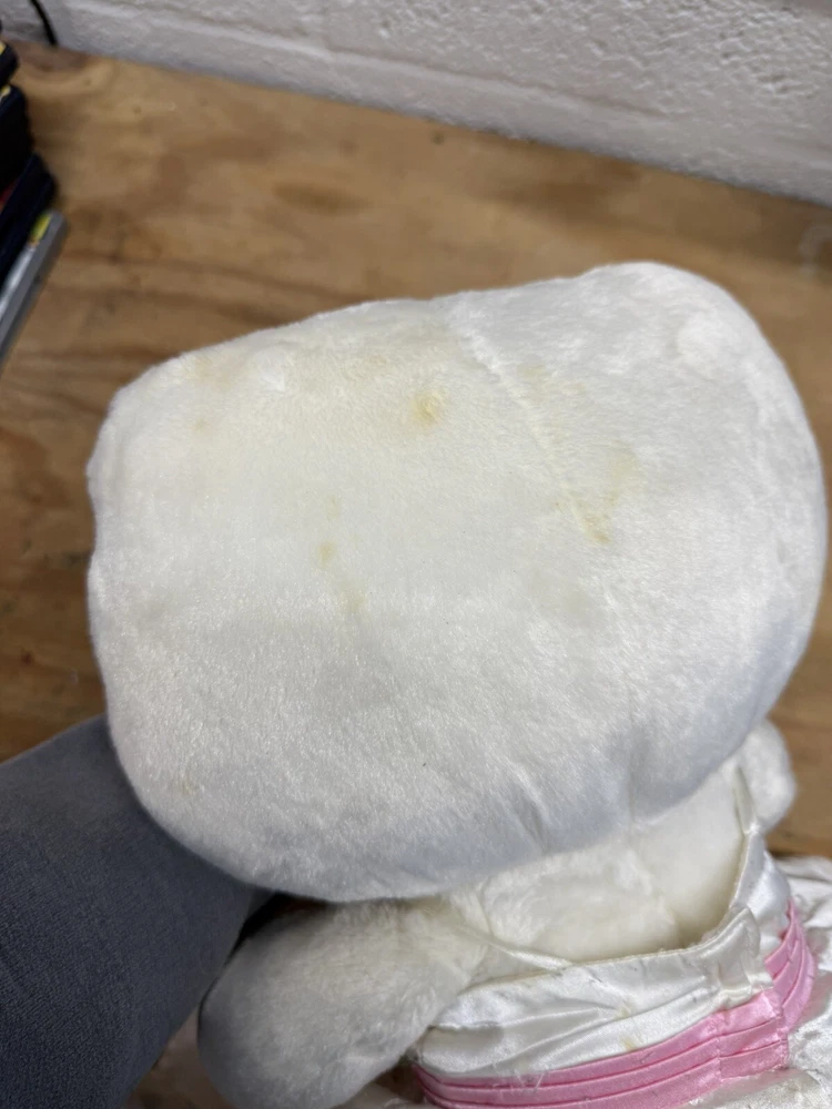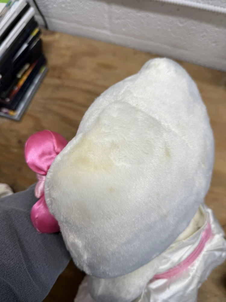 This vintage Build-A-Bear Workshop plush is a Hello Kitty character in the form of a white bear measuring 18 inches in size. It features a black eye color and comes with an original pink heart bow accessory. This retired Fluffy collection item includes the iconic Hello Kitty branding and is made of plush material. Perfect for fans of Hello Kitty or collectors of Build-A-Bear Workshop items. YELLOW MARKS ON BOW, HEAD, BACK, AND FEET, SEE PHOTOS. COMES WITH ORIGINAL BOW. INCLUDES OUTFIT THAT HAS STAINING. FAST SHIPPING.
