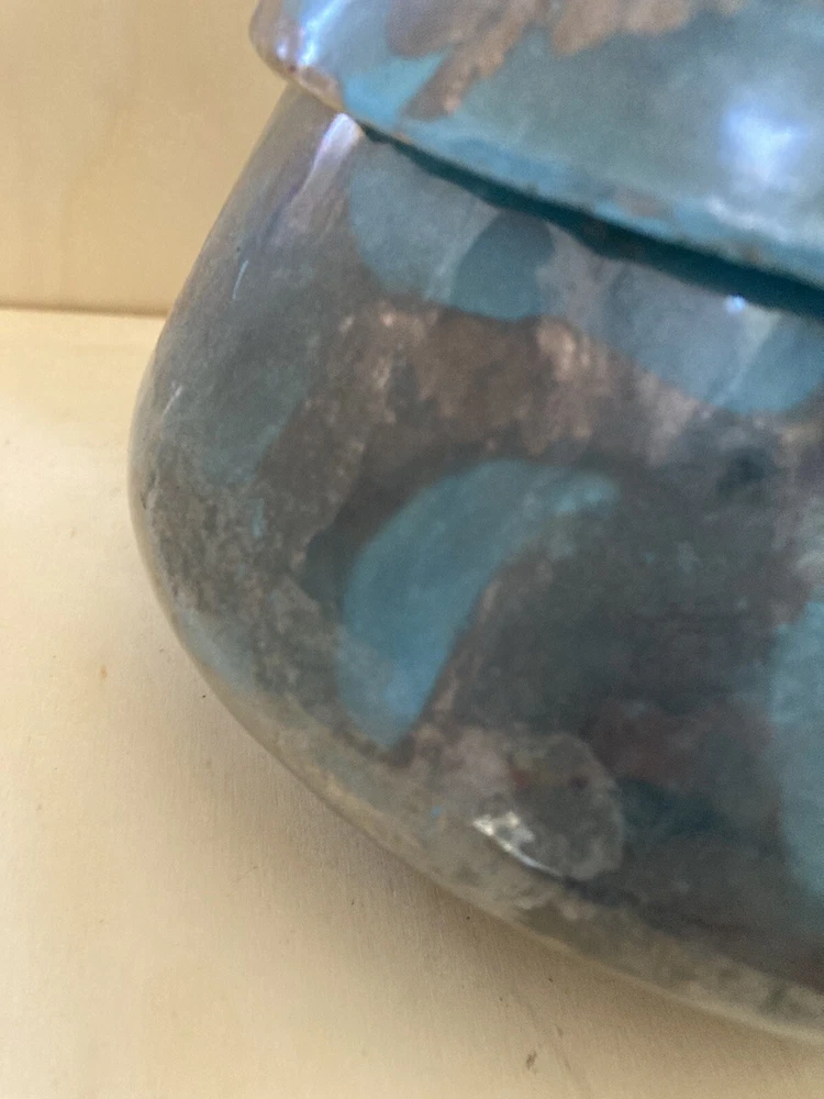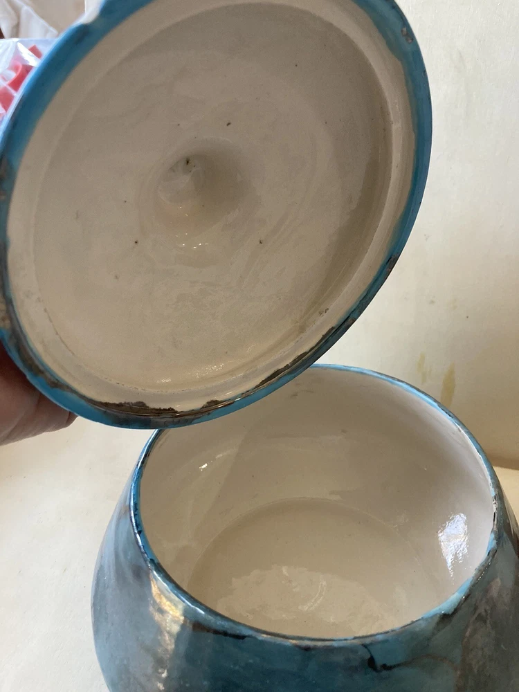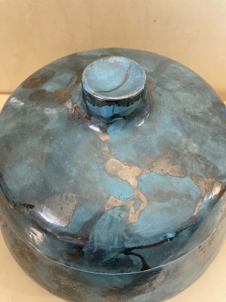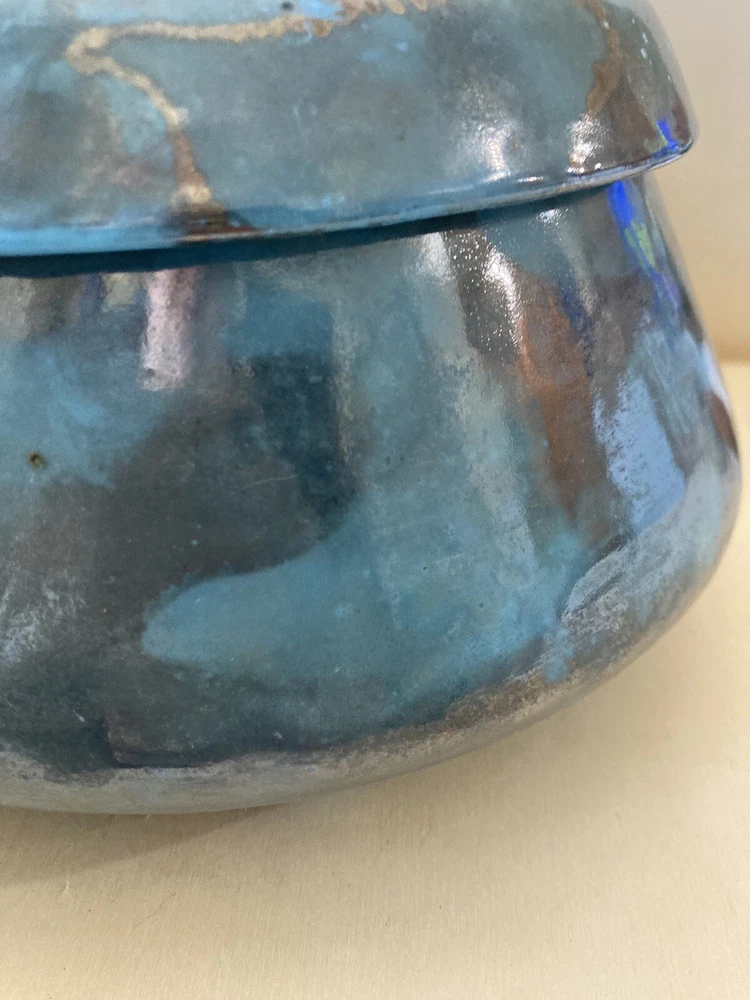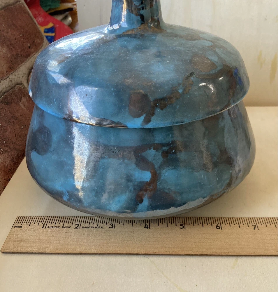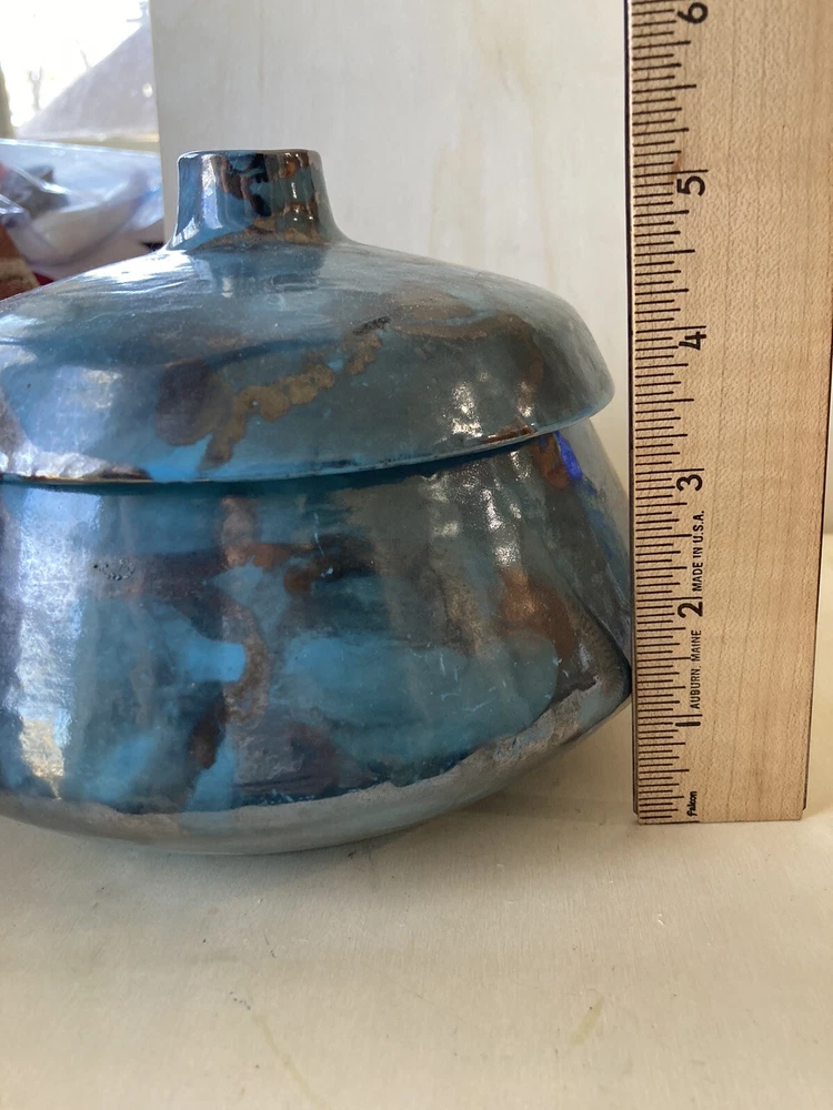 Vtg Iridescent Lustre Lusterware Pottery Lidded Dish Teal Blue Decor. Condition is Used. Shipped with USPS Ground Advantage.