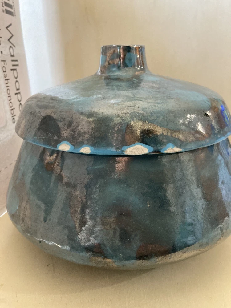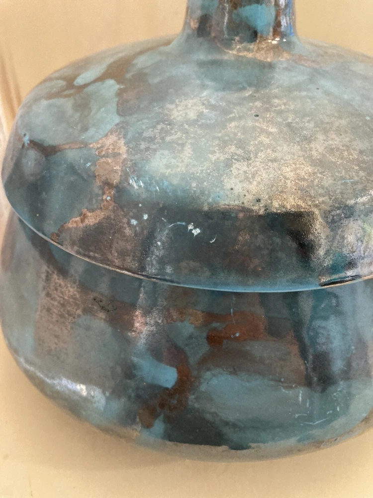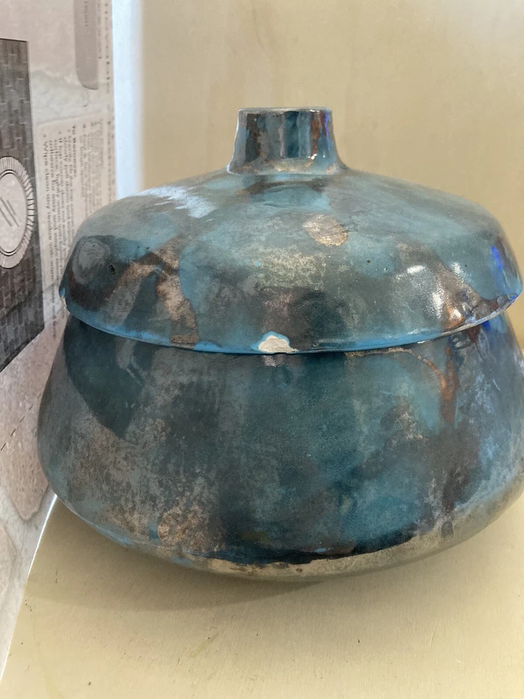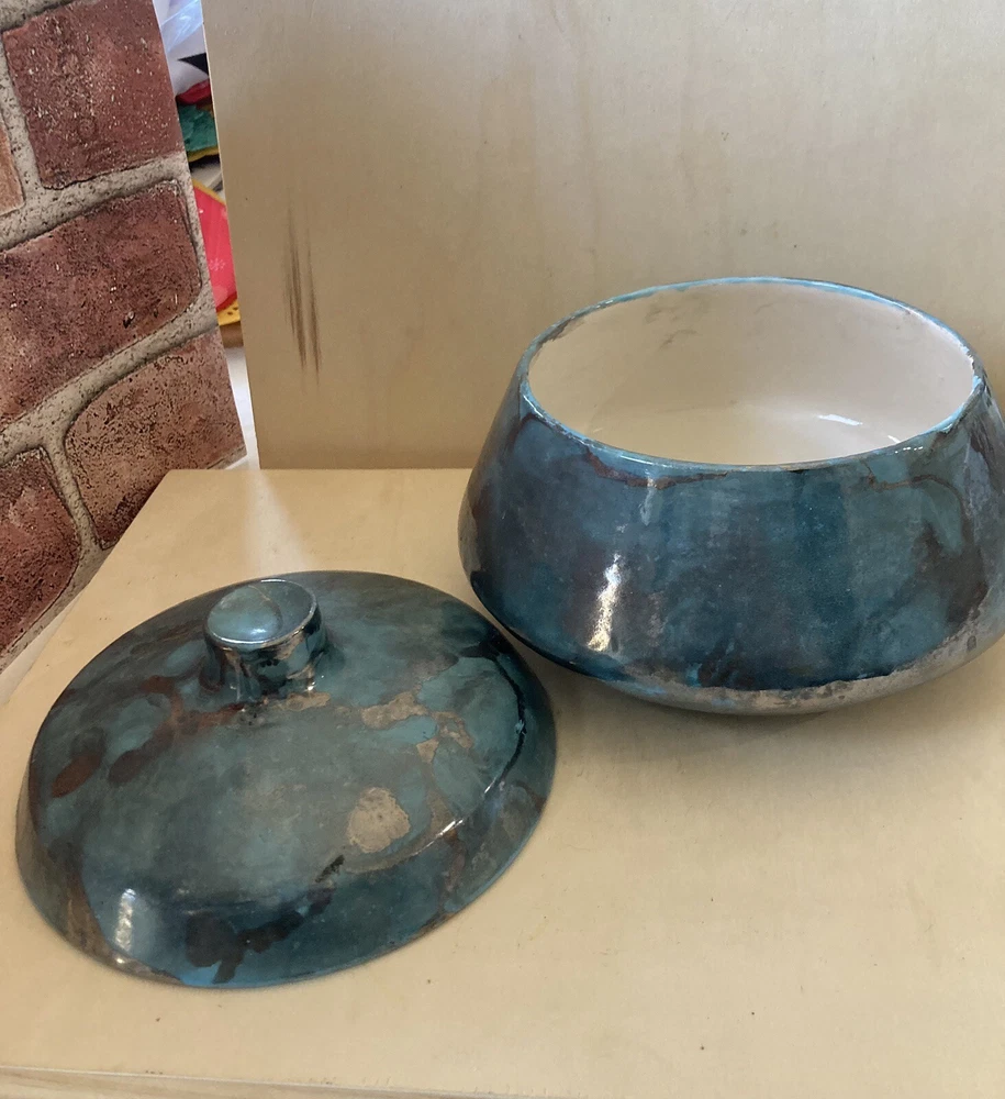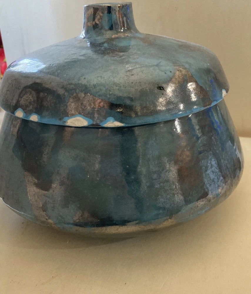Vtg Iridescent Lustre Lusterware Pottery Lidded Dish Teal Blue Decor. Condition is Used. Shipped with USPS Ground Advantage.