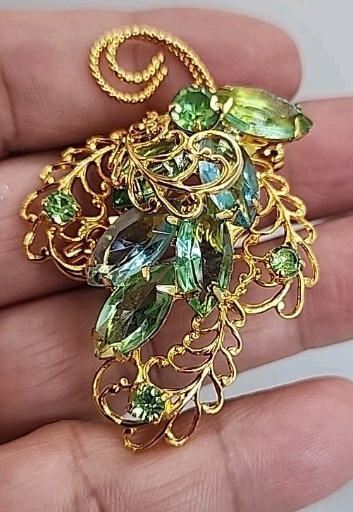 Vtg Juliana D&E Emerald Green Turquoise Rhinestone Gold Leaf Brooch 2 Inch