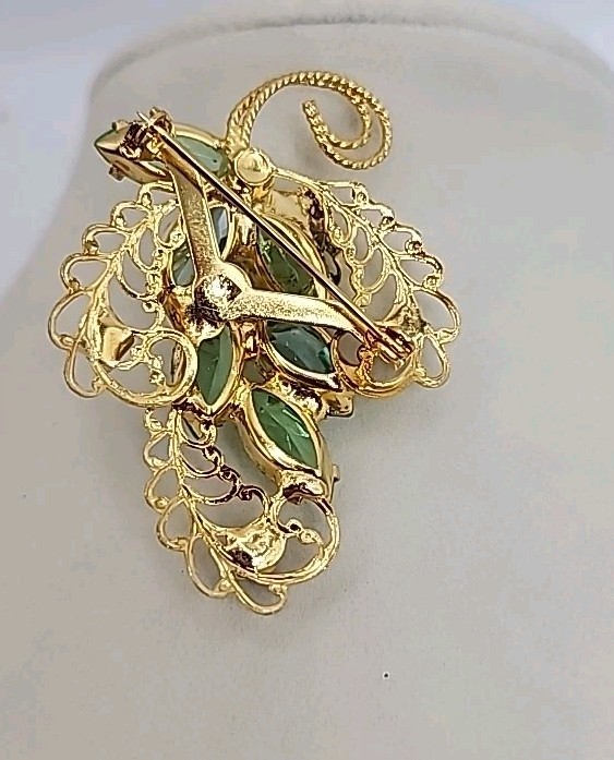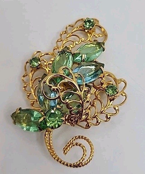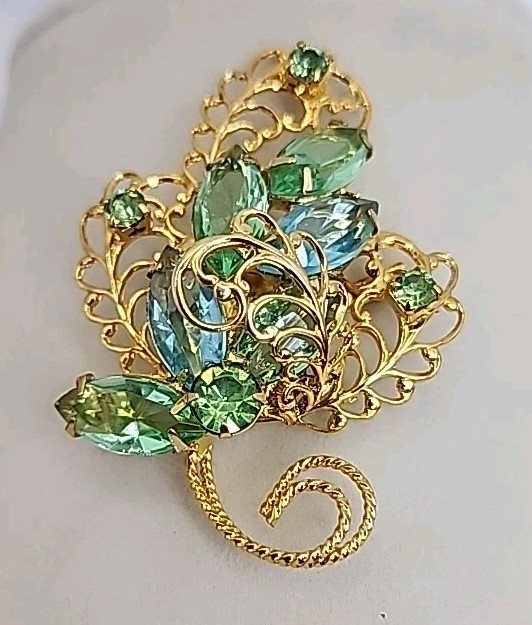 HomeVtg Juliana D&E Emerald Green Turquoise Rhinestone Gold Leaf Brooch 2 Inch