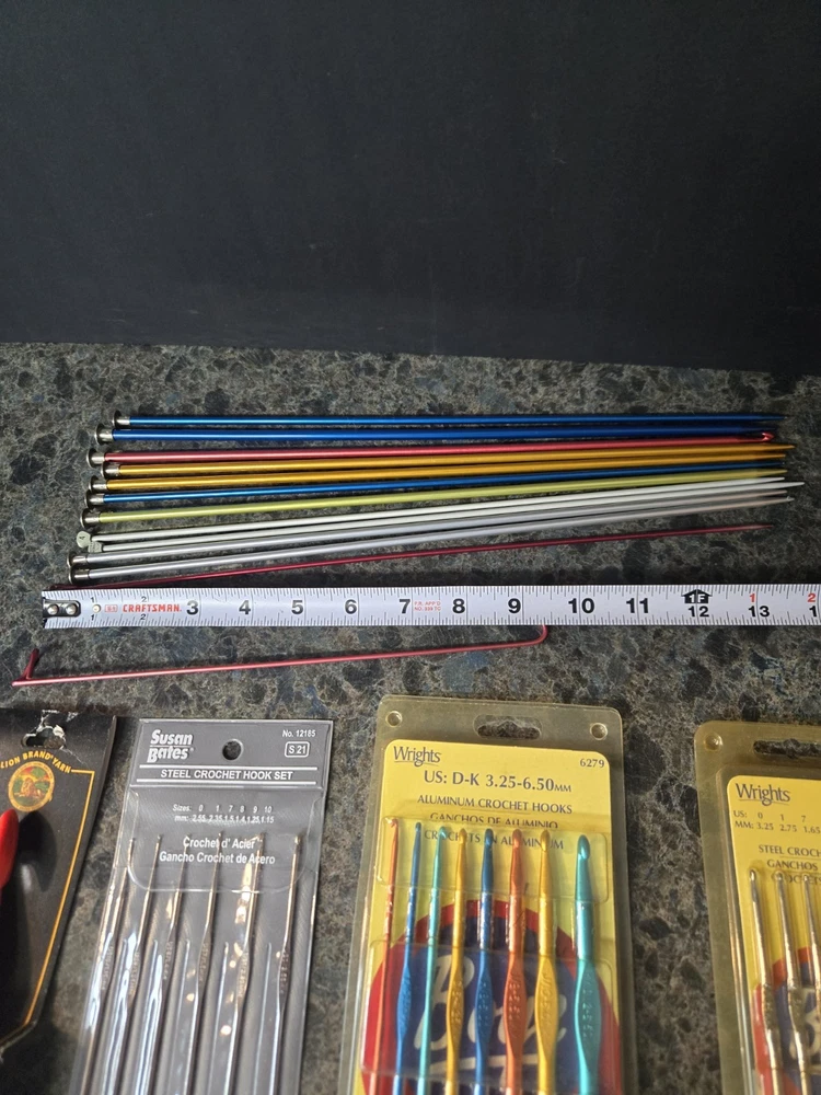 This vintage knitting needles and crochet hooks lot includes a variety of pieces from assorted manufacturers, including aluminum, wood, and plastic materials. The set includes knitting needles, with a custom bundle of various sizes and types to suit your crafting needs. Perfect for crochet and knitting projects, this assortment offers a mix of high-quality materials and unique styles for creative endeavors.
