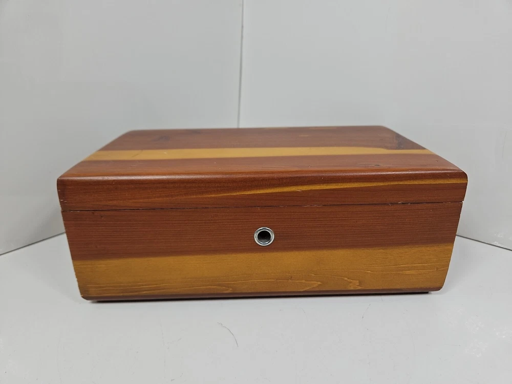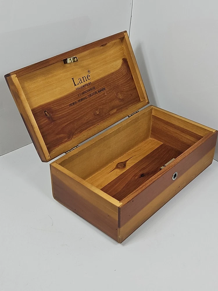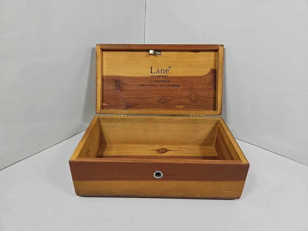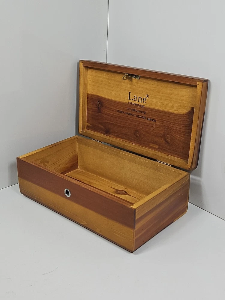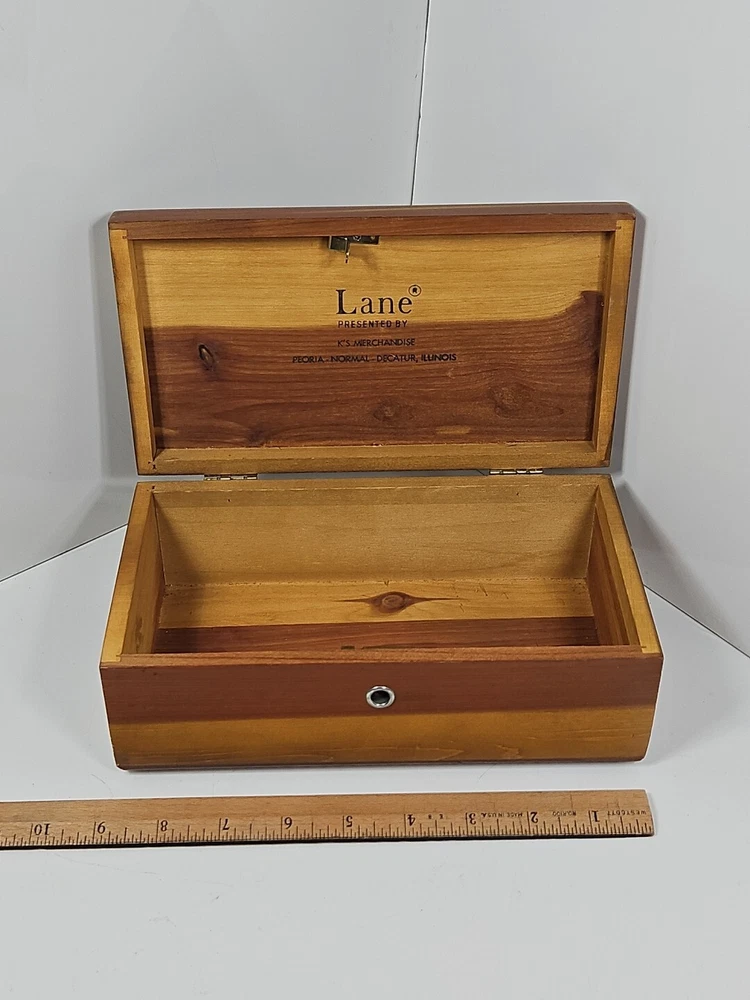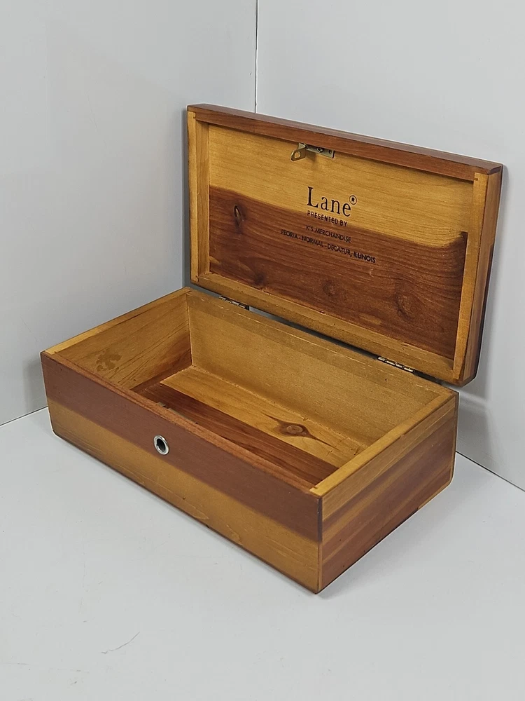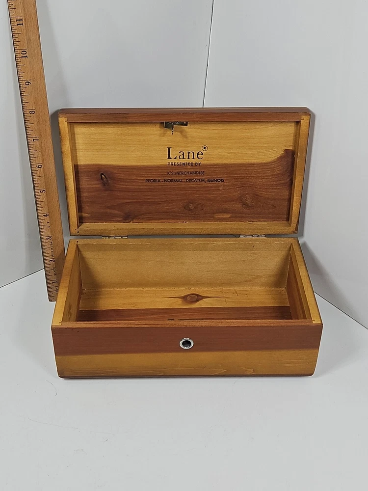 Vtg LANE Wooden Cedar Chest Jewelry Trinket Box K's MERCHANDISE Decatur IL Nokey No key. Small cedar chest trinket box. Lane presented by K's MERCHANDISE Peoria normal Decatur Illinois. See pictures. Product will be shipped timely and packaged with care. Offers are encouraged. Please feel free to reach out with questions. Please see pictures. Thank you. Good used condition. Light wear from age and use. Markings from age and use. See pictures This vintage Lane wooden cedar trinket box from K's Merchandise in Decatur, IL features a wood grain pattern in a small rectangular shape. The box is brown in color and has a key character design, suited for all occasions. It is from the mid to late 1900s and part of the Keepsake Boxes collection. The box is suitable for storing jewelry and other small items, and comes boxed. BS2