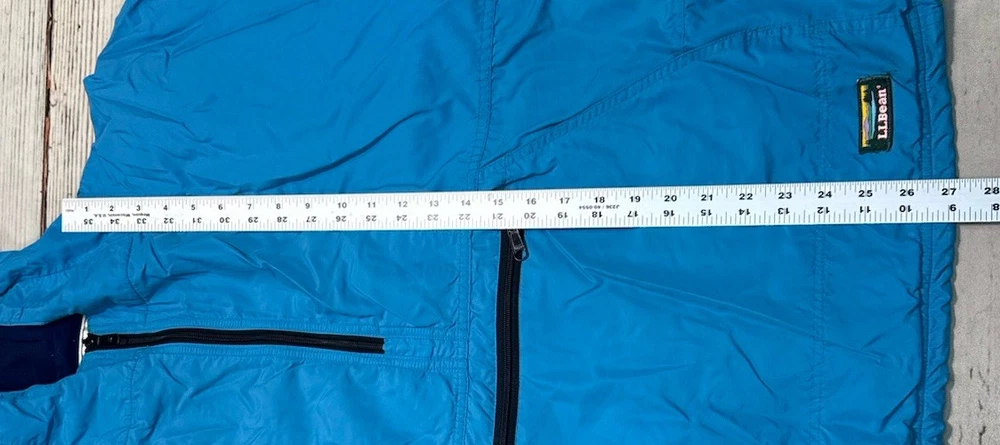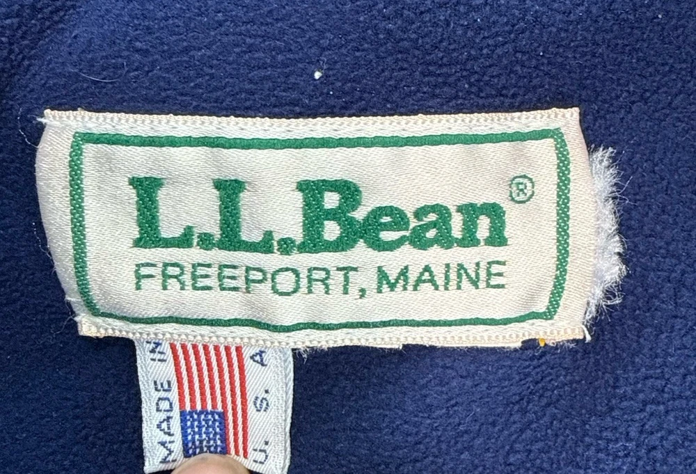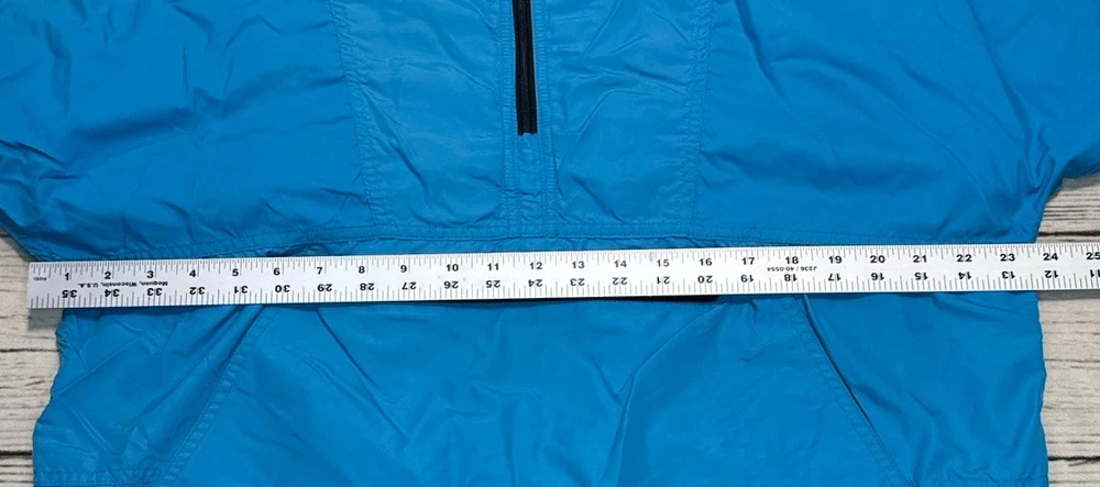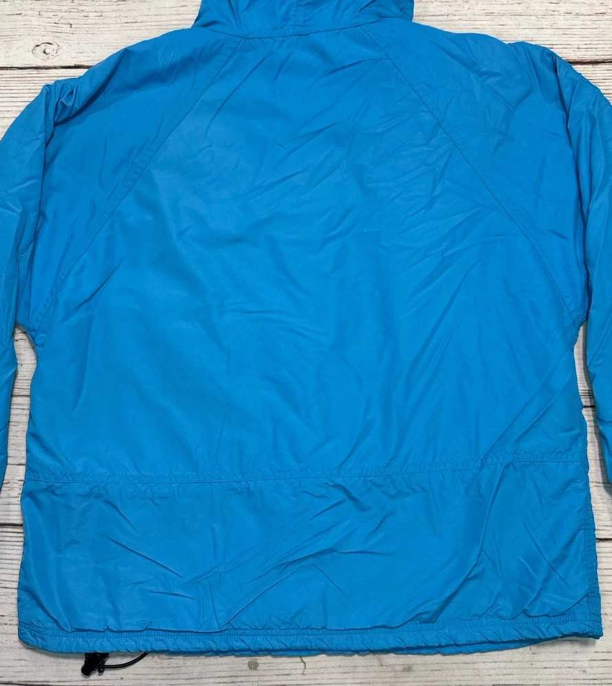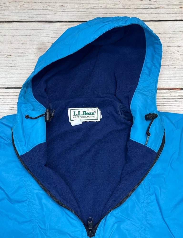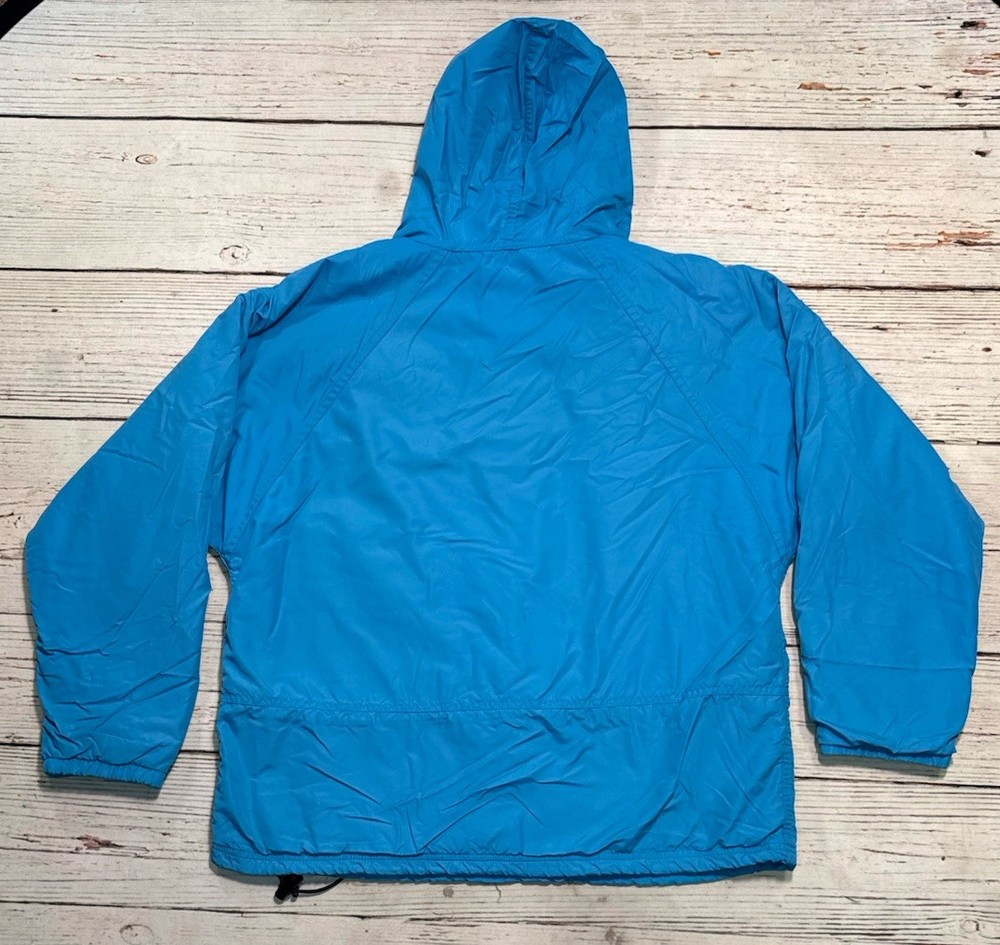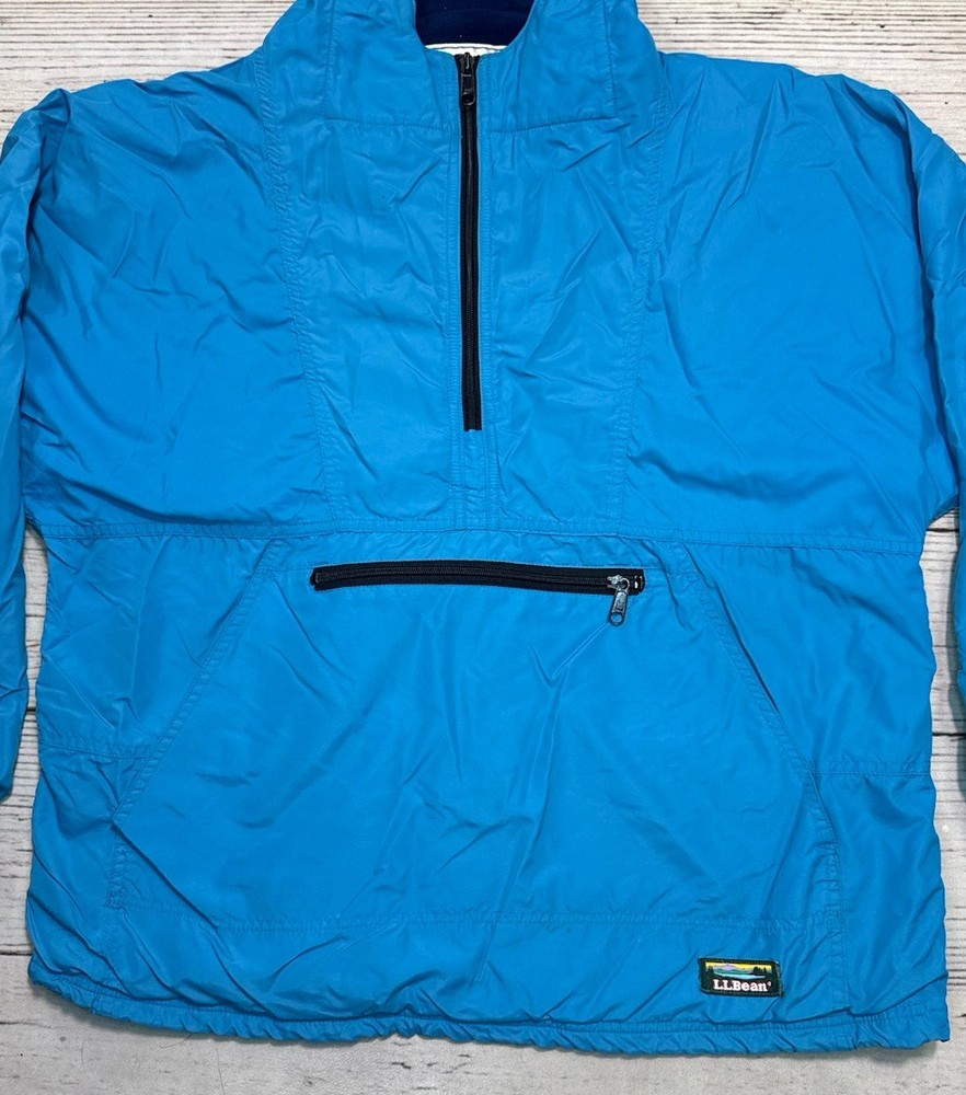 This vintage LL Bean Anorak Jacket in Men's size L is a classic piece with a hooded pullover design, perfect for casual or travel occasions. Made in the USA with nylon outer shell material and fleece fabric type, this mid-length jacket features a solid blue color and a 1/4 zip closure with zipper accents. It is machine washable and lined for added comfort. The anorak style with a USA theme and 1/4 zip, hooded, and pockets features make it a versatile addition to your wardrobe for the colder seasons. Has some stains on the front. Check pictures for condition and measurements for size.