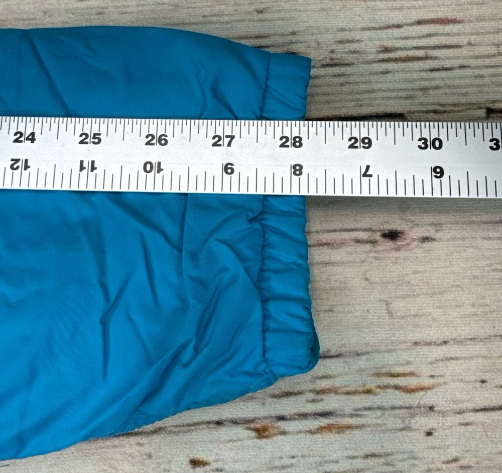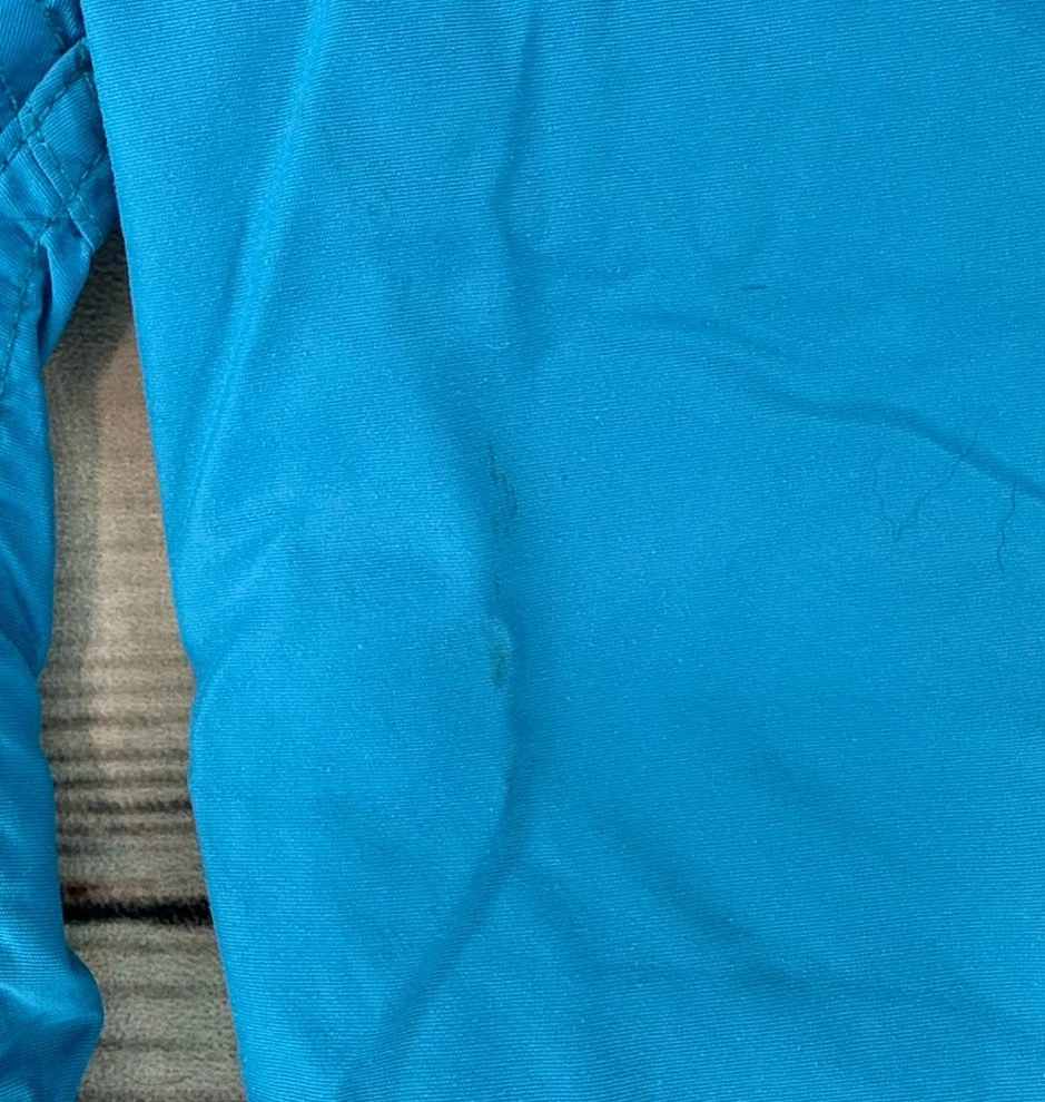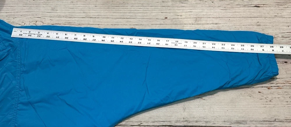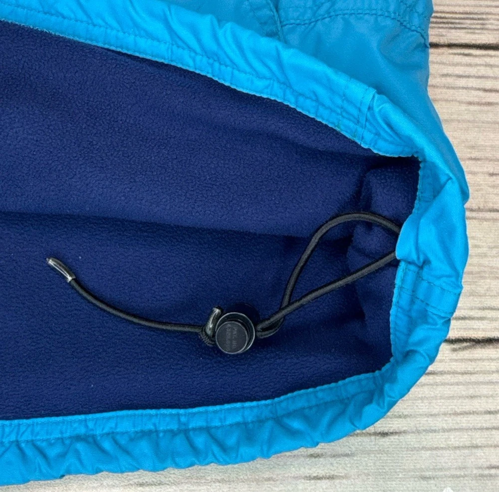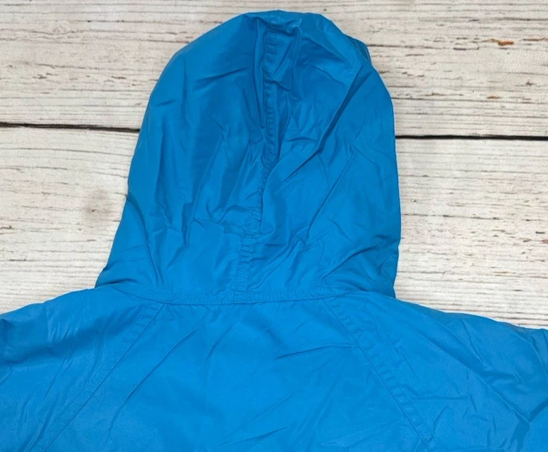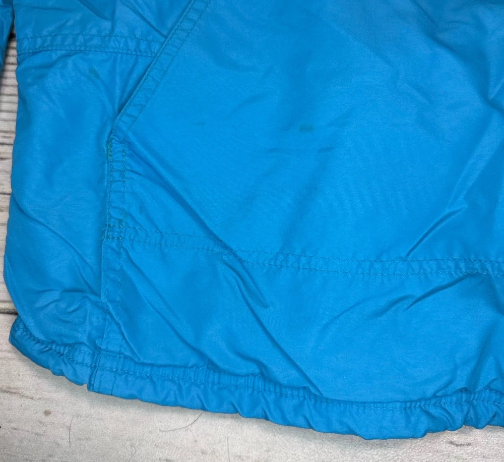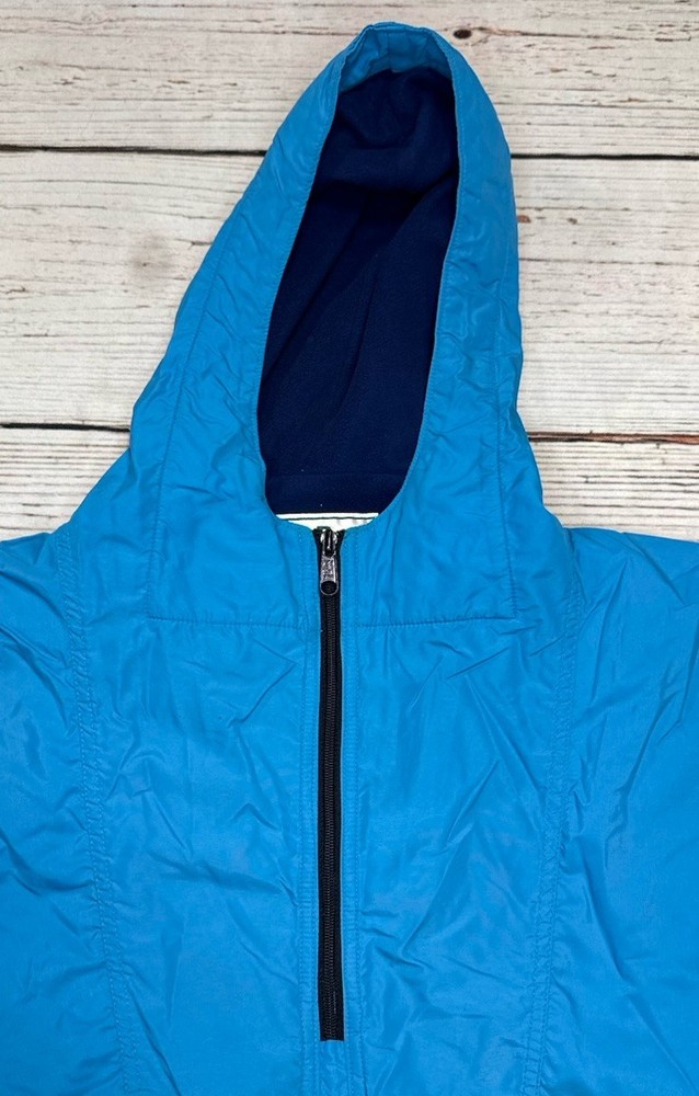 This vintage LL Bean Anorak Jacket in Men's size L is a classic piece with a hooded pullover design, perfect for casual or travel occasions. Made in the USA with nylon outer shell material and fleece fabric type, this mid-length jacket features a solid blue color and a 1/4 zip closure with zipper accents. It is machine washable and lined for added comfort. The anorak style with a USA theme and 1/4 zip, hooded, and pockets features make it a versatile addition to your wardrobe for the colder seasons. Has some stains on the front. Check pictures for condition and measurements for size.