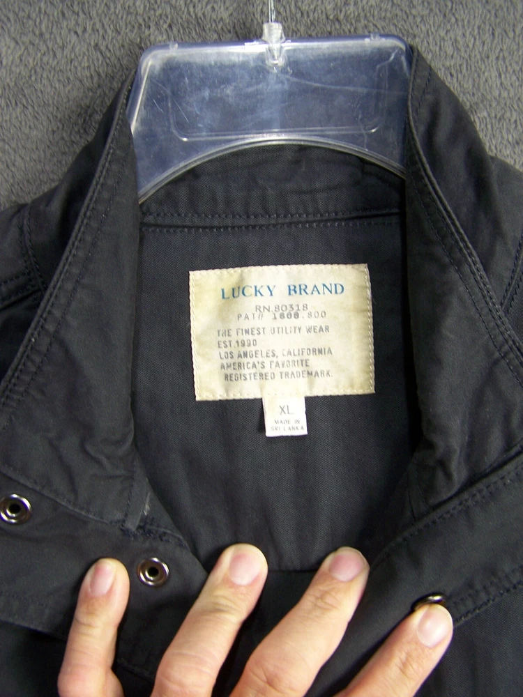 MENS CLOTHING DEPT Up for sale is a Vtg LUCKY BRAND Jacket Adult Extra Large Black Cotton Snap Front Outdoor Men's Size: Adult Size Measurements: Please see photos above for all measurements LUCKY BRAND Vintage Jacket Military Style 2 slant Pockets. We offer free returns no questions asked. Thank you I will ship this item out via USPS First Class 2-3 Day Mail with a tracking number for confirmation We can combine shipping on multiple quantity Please email us 9053 Janelle's Unlimited is family owned and has been in business for over 14 years. Customer satisfaction is our first priority. This item is made of quality material. It is guaranteed 100% genuine and authentic. Your purchase is fully protected when you order today. If you are not Satisfied with your item, contact us anytime we will get back to you Within 24 hours Monday through Friday. We have one of the best returns policies on eBay. Our shipping days are Monday through Friday in the morning. Please see our feedback page to reveal how much pride we take in our company.