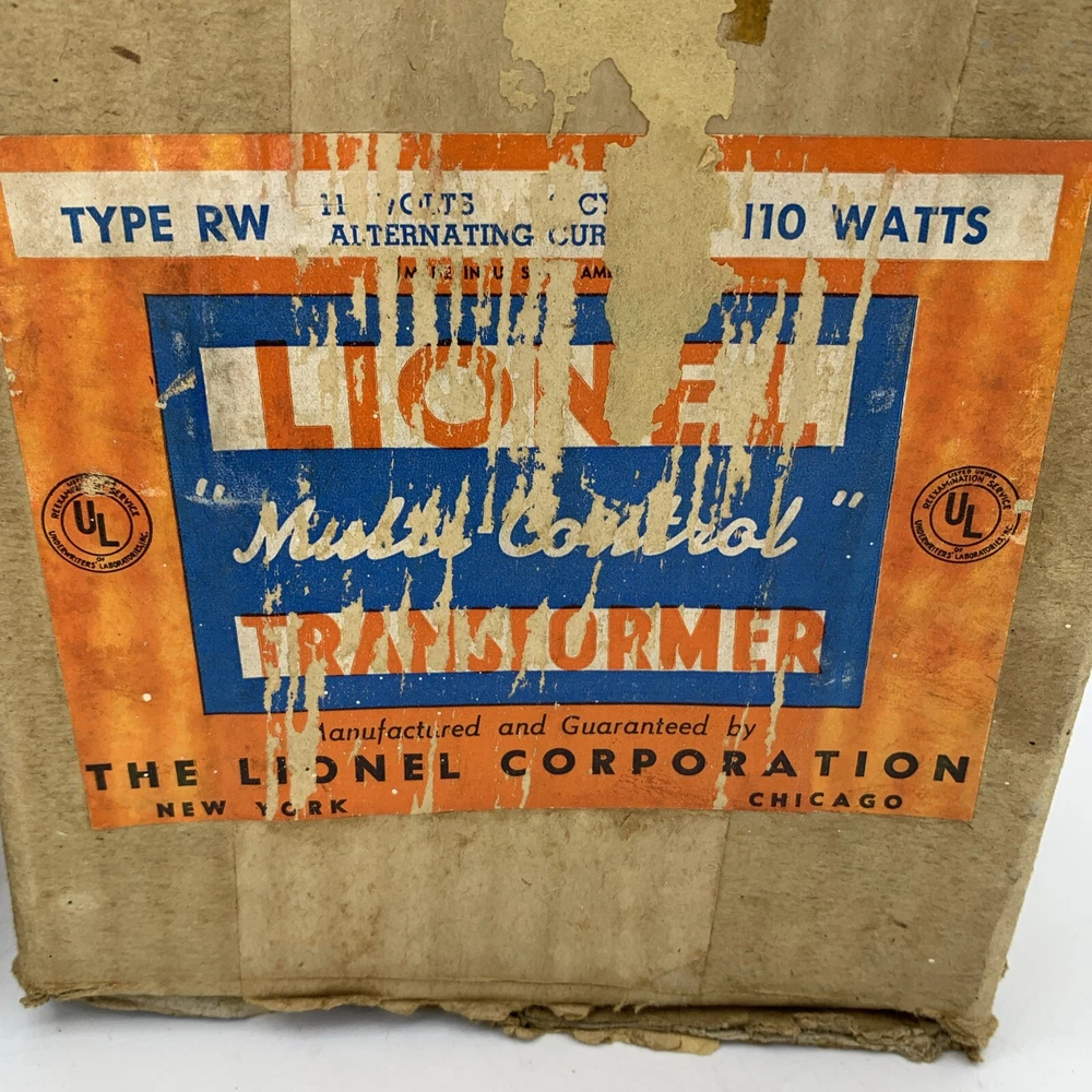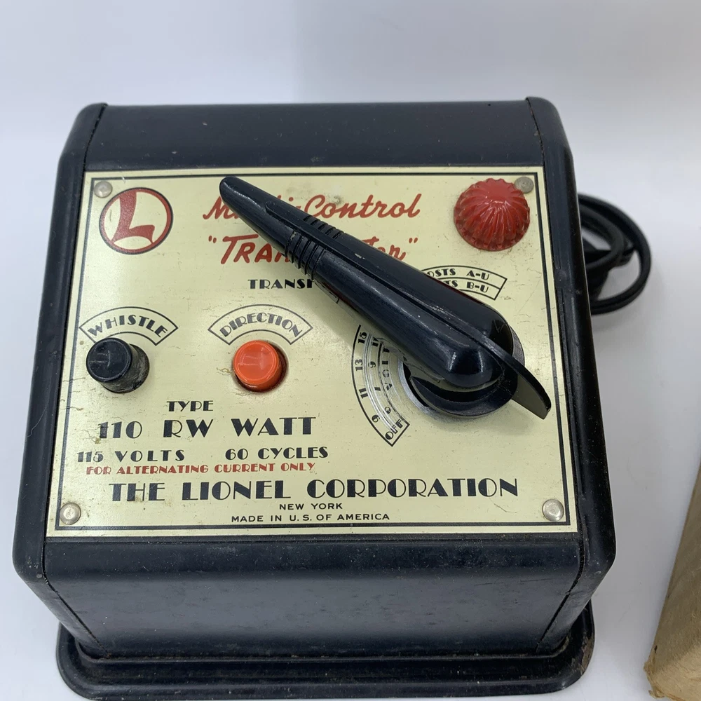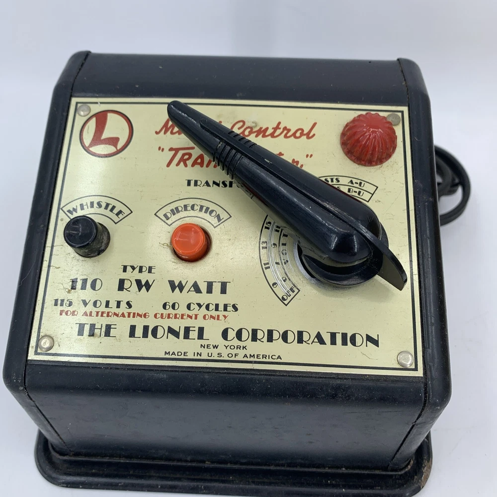 Vtg Lionel Electric Trainmaster 110 RW Multi Control Transformer & Original Box This is for everything you see pictures. Nothing else. This is has had limited testing read below and sold as seen. This comes with the original box. There is expected wear on item. The box has considerable wear. Rear terminals all work. Electrical cord works has minor stress cracks. Whistle and direction buttons not tested. Train B
