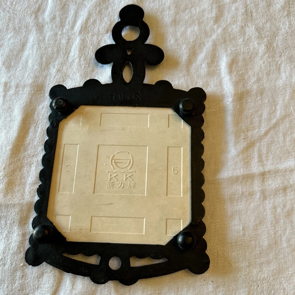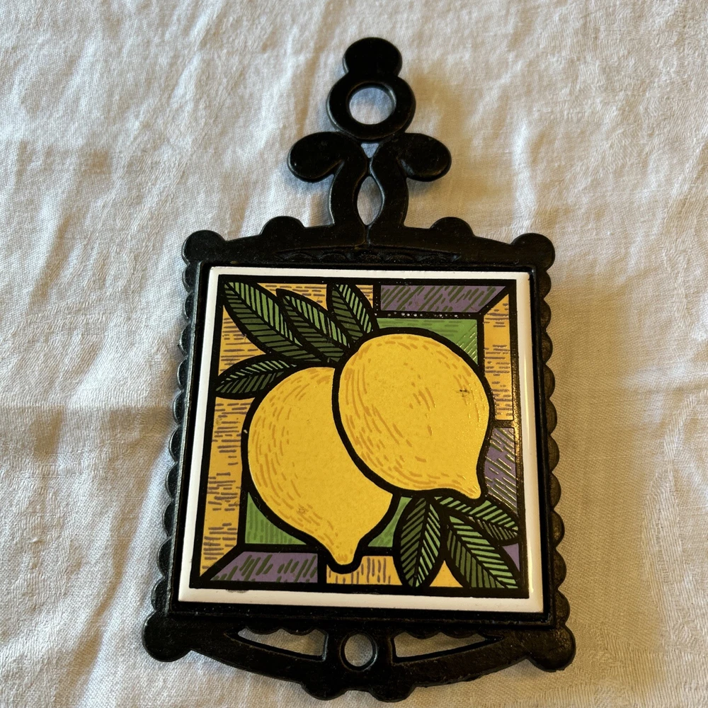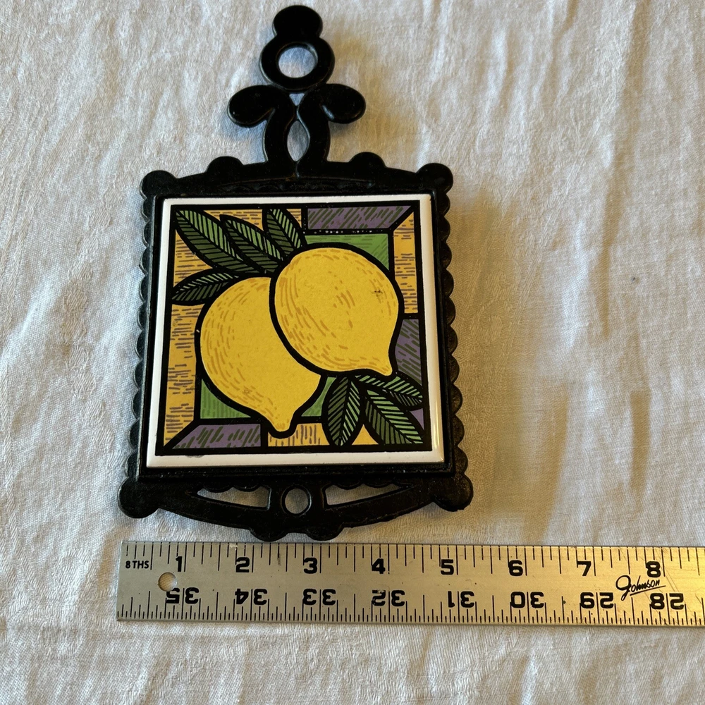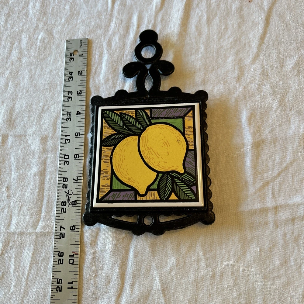 Item Width: 5 in Time Period Manufactured: 1970-1979 Original/Reproduction: Original Color: Black Brand: Unbranded Material: Cast Iron, Cast Iron / Ceramic Antique: No Item Height: 9.5 Type: Trivet Shape: Square Style: Vintage/Retro Theme: Mid Century Modern Size: Small Country/Region of Manufacture: Unknown Pattern: Lemons Featured Refinements: Tile Trivet Components Included: Handle