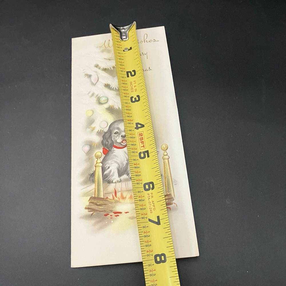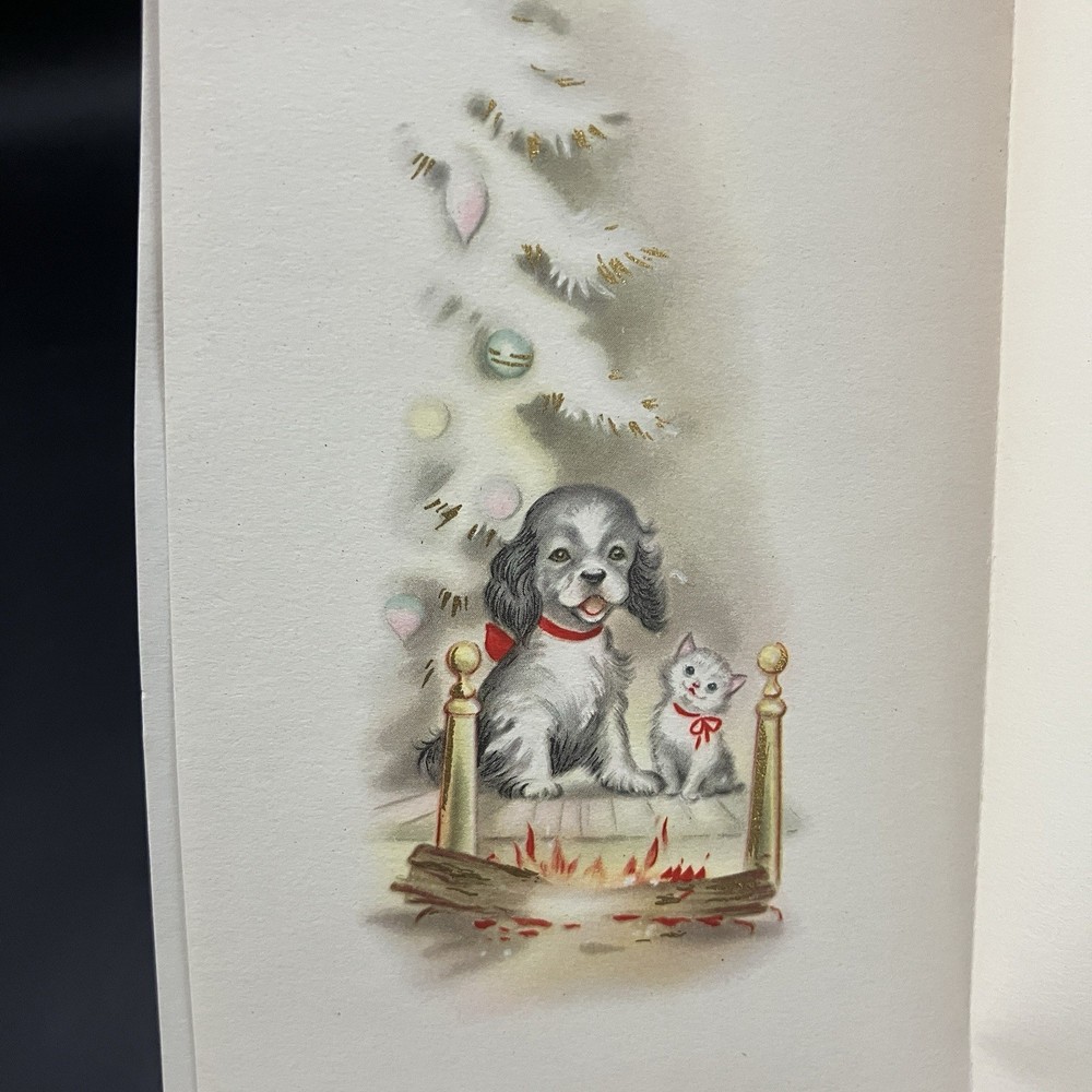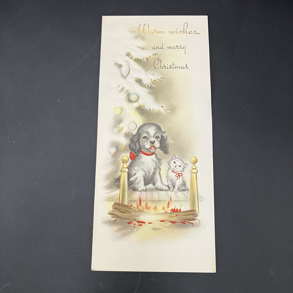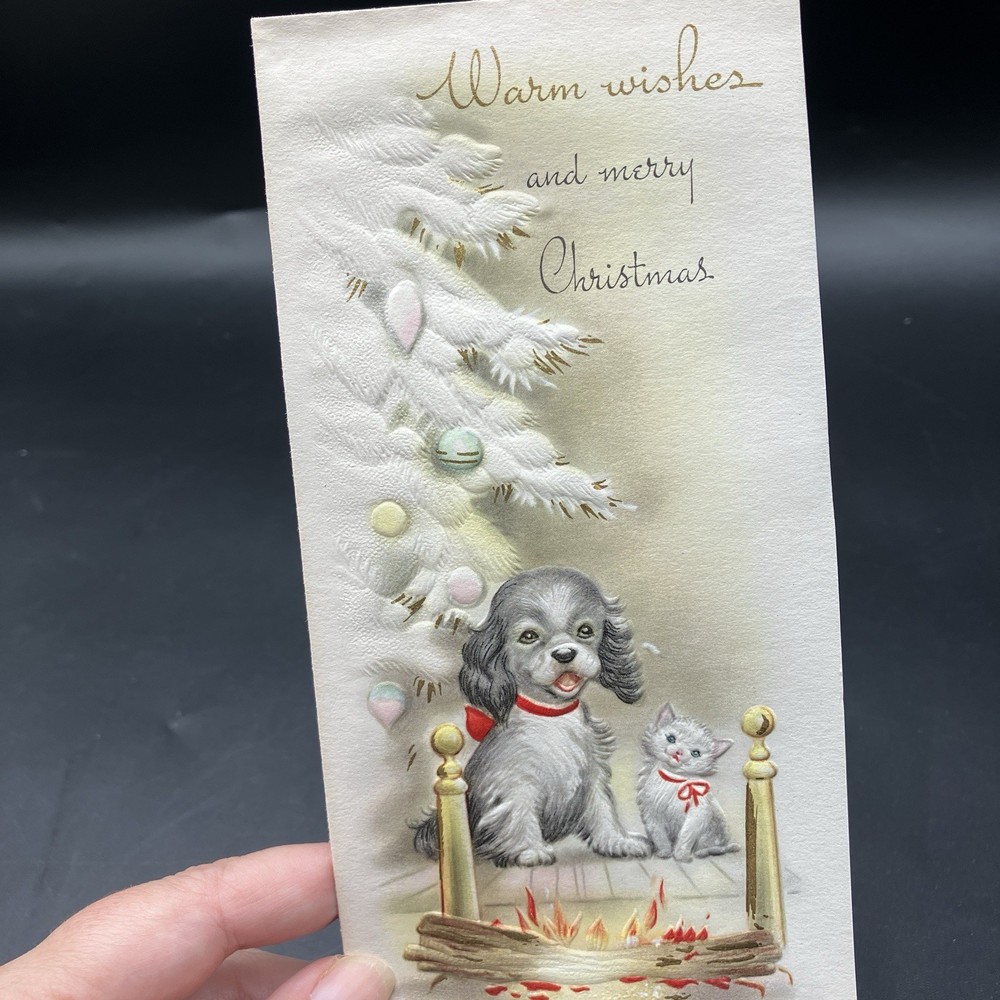 Charming vintage mid-century modern Christmas greeting card featuring a gray puppy with red bow and a fluffy kitten by the fireplace, next to a white Christmas tree decorated with pastel ornaments. Beautifully embossed with gold accents. • Size: approx. 7.5” x 3.5” • Inside: “It adds so much to Christmas Day to send a happy wish your way.” with illustration of puppy and kitten by the tree • Back: Marked “25X8910 Made in U.S.A.” • Condition: Excellent vintage condition, unused, no writing. Slight age toning consistent with age. • No envelope included. Wonderful addition to a vintage ephemera collection, or perfect for framing and display during the holidays.
