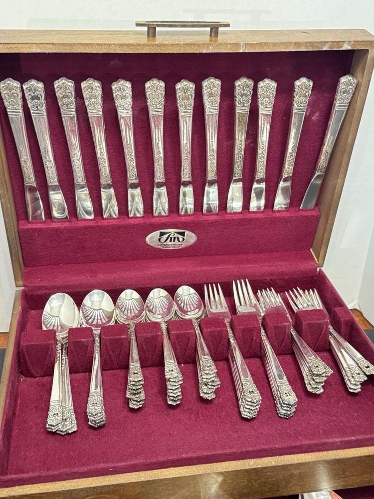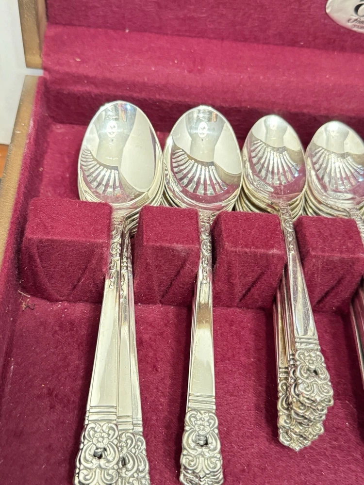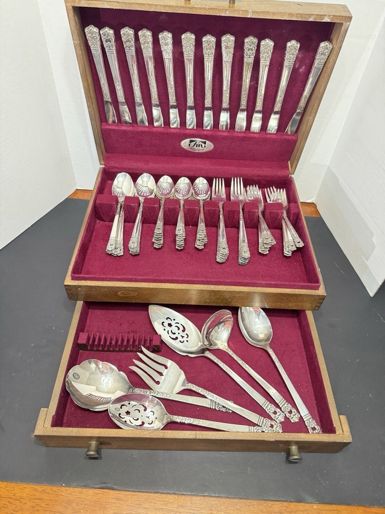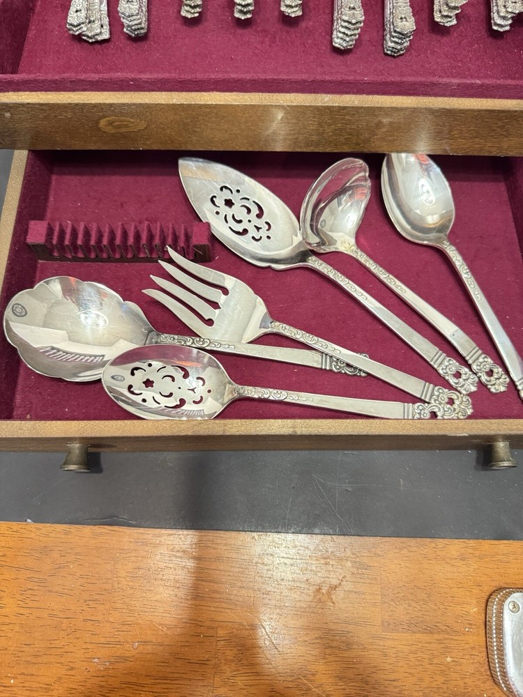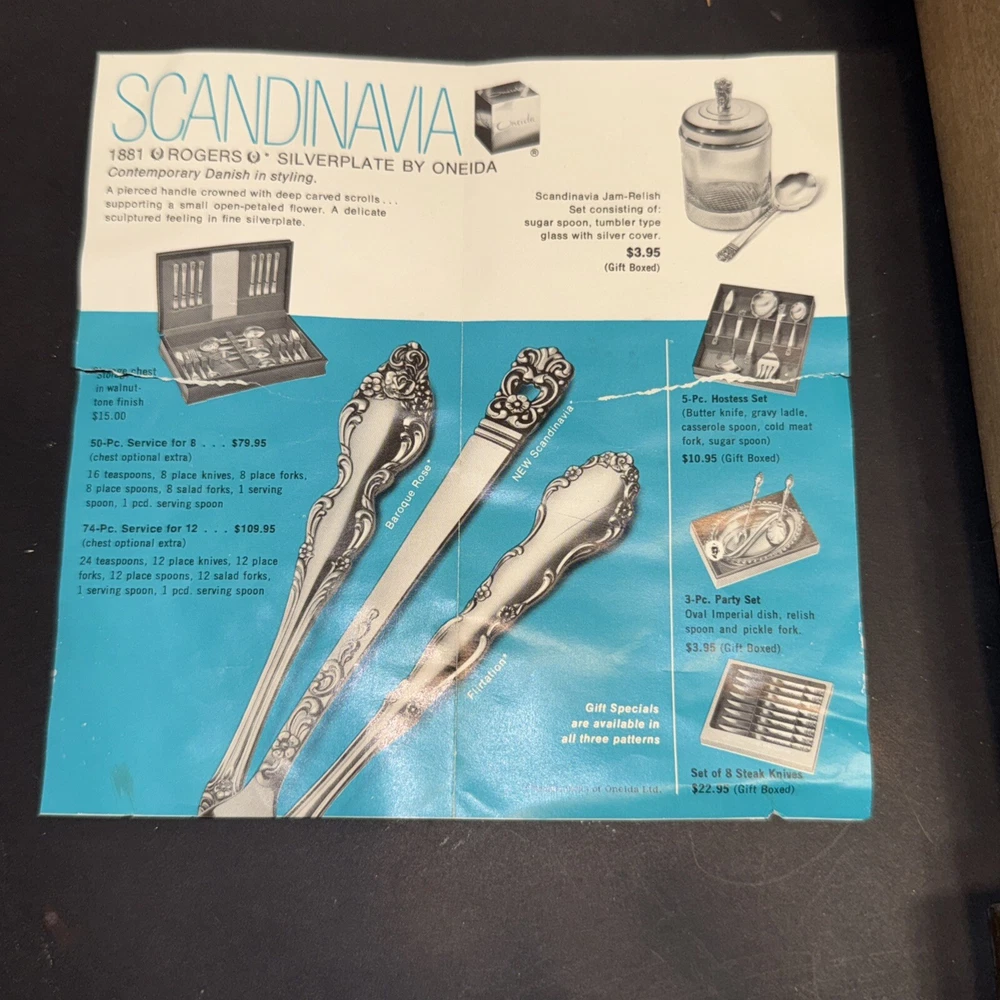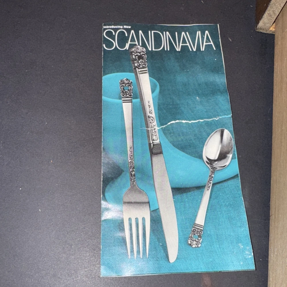 This mid century modern danish influence sweet has 77 pieces, missing 1 salad fork. The handle pattern is Scandanavia and the finish is glossy. The set comes with a walnut wood tone case with a tray for easy storage and transport. Large rare serving set. Discontinued in 1970. Includes three original pamphlet from when it was purchased, though it's not inn great shape. 12 knives 12 dinner forks 11 salad forks 24 teaspoons 12 for dinner, 12 for dessert 12 oval soup spoons 6 piece hostess/completer set Please feel free to contact me with any questions you have