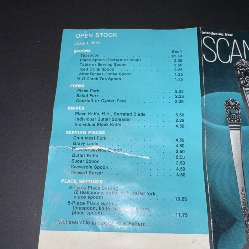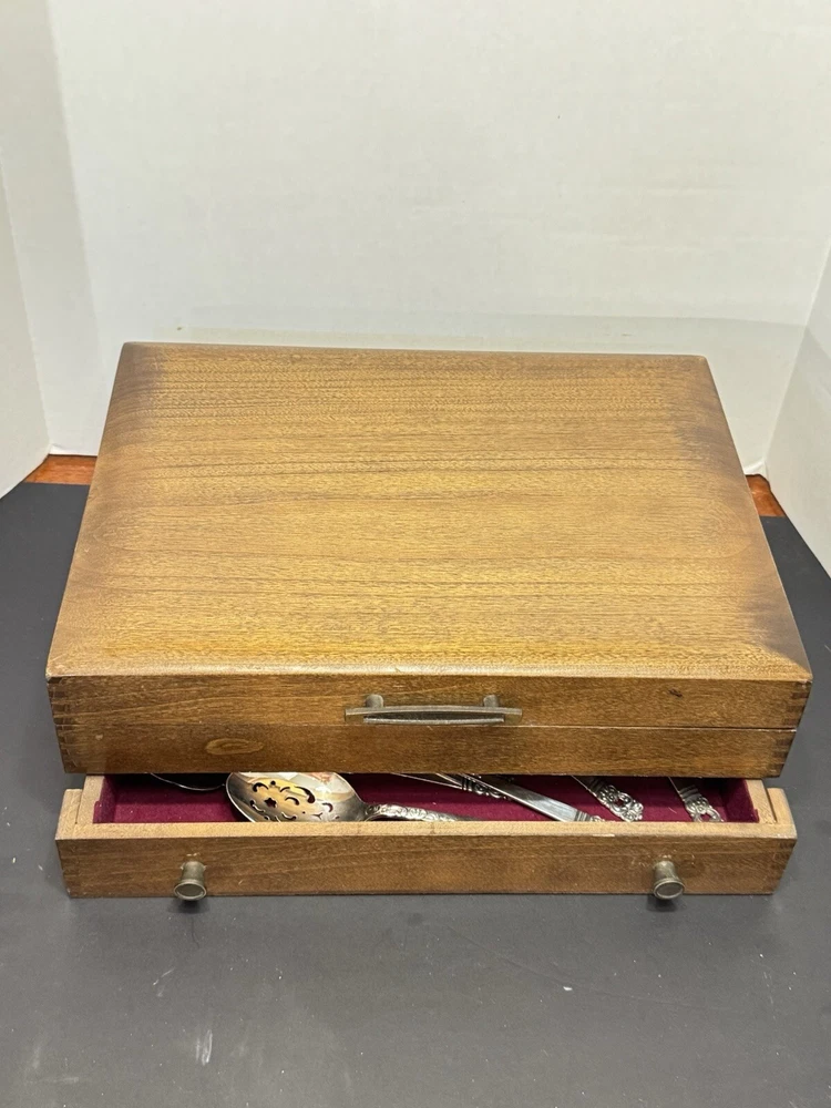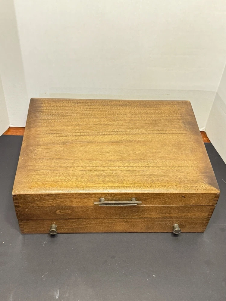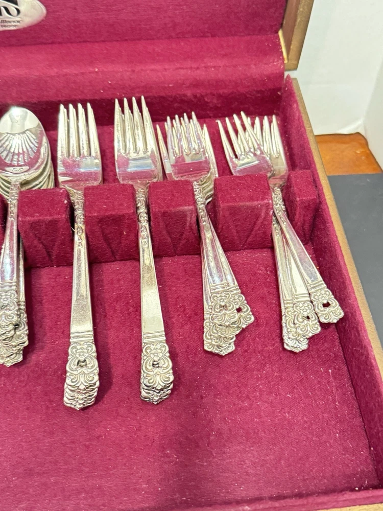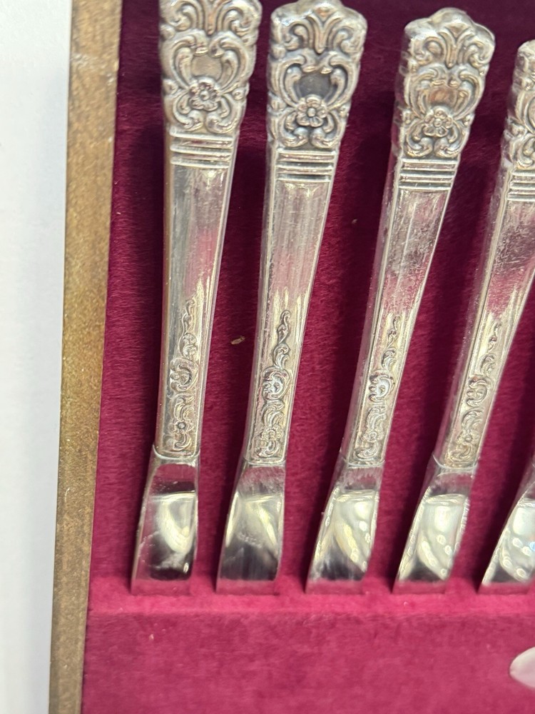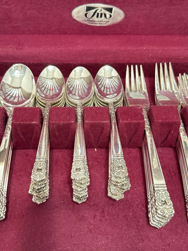 This mid century modern danish influence sweet has 77 pieces, missing 1 salad fork. The handle pattern is Scandanavia and the finish is glossy. The set comes with a walnut wood tone case with a tray for easy storage and transport. Large rare serving set. Discontinued in 1970. Includes three original pamphlet from when it was purchased, though it's not inn great shape. 12 knives 12 dinner forks 11 salad forks 24 teaspoons 12 for dinner, 12 for dessert 12 oval soup spoons 6 piece hostess/completer set Please feel free to contact me with any questions you have
