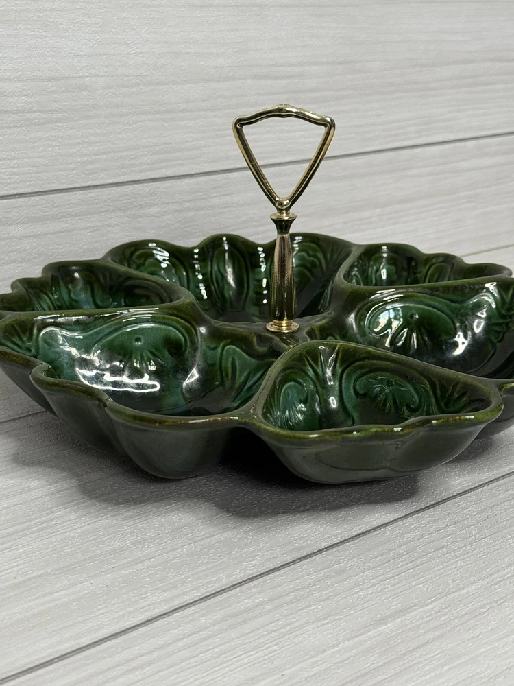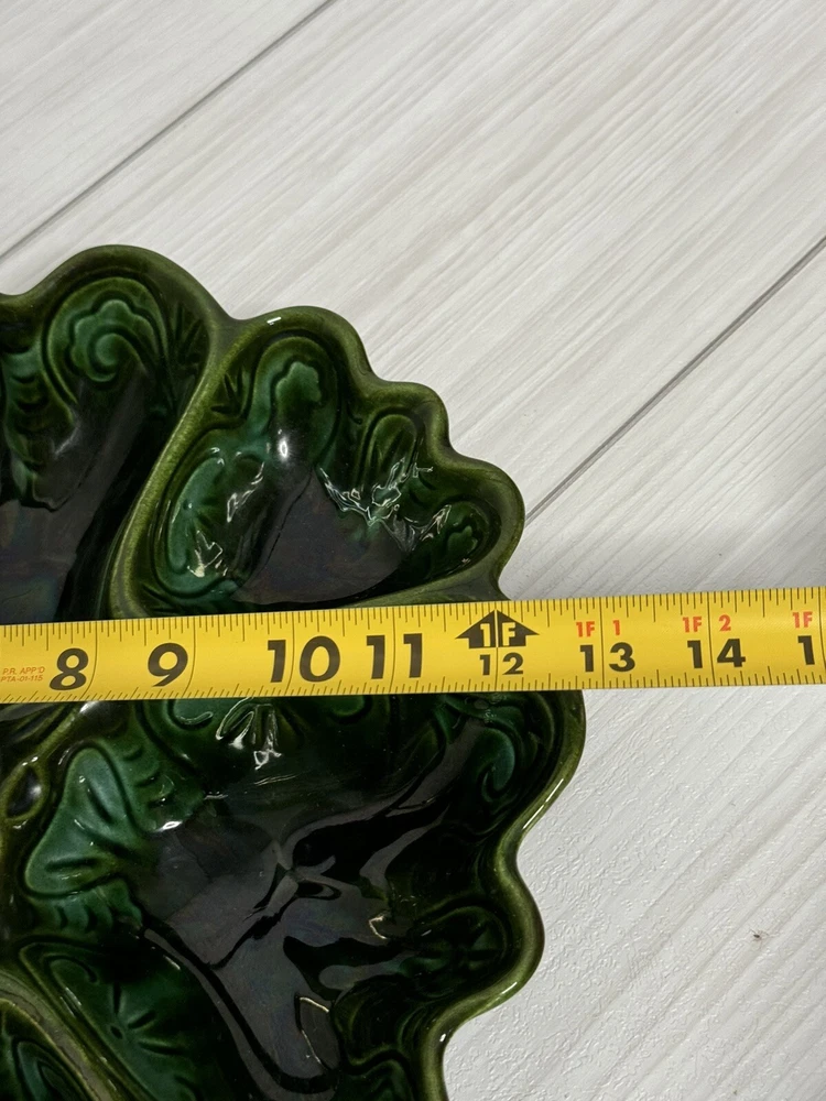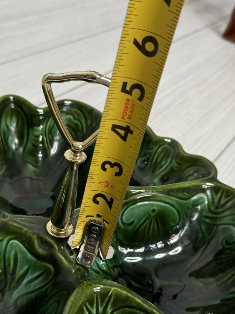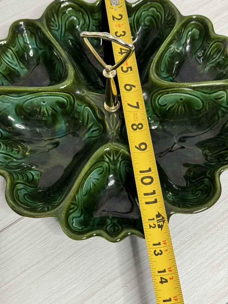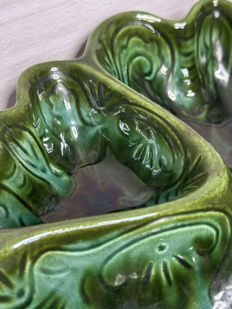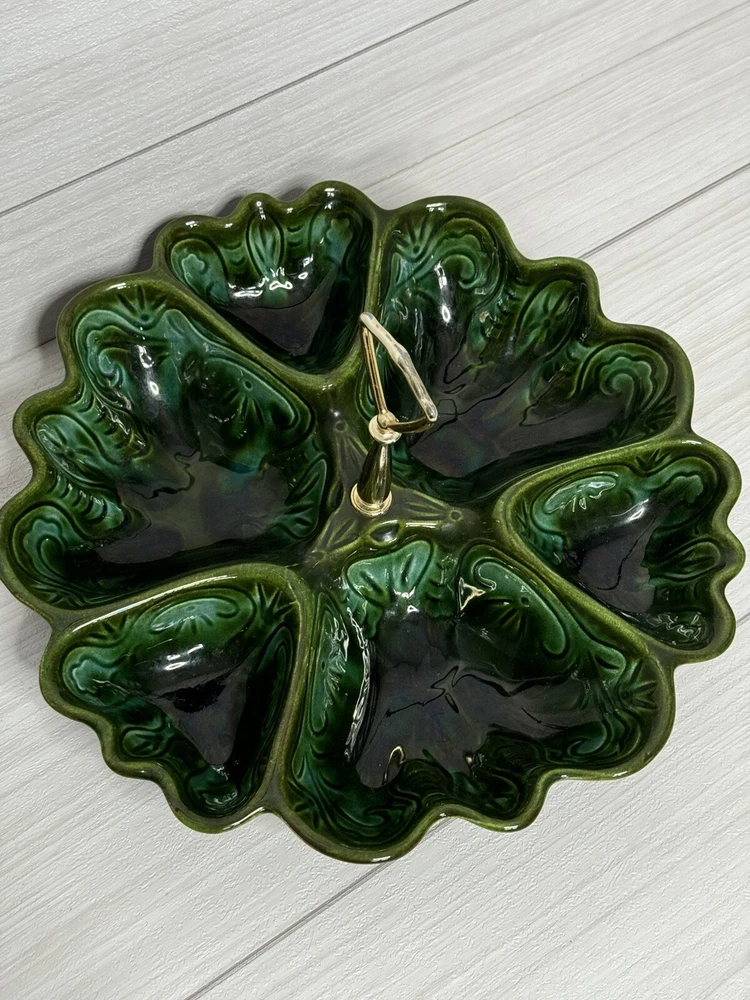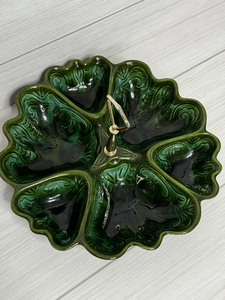 Beautiful scalloped edge serving tray for appetizers or vegetables. The top of the handle does have some wear , but that should be expected from normal wear and its age. Nice statement piece for any kitchen.