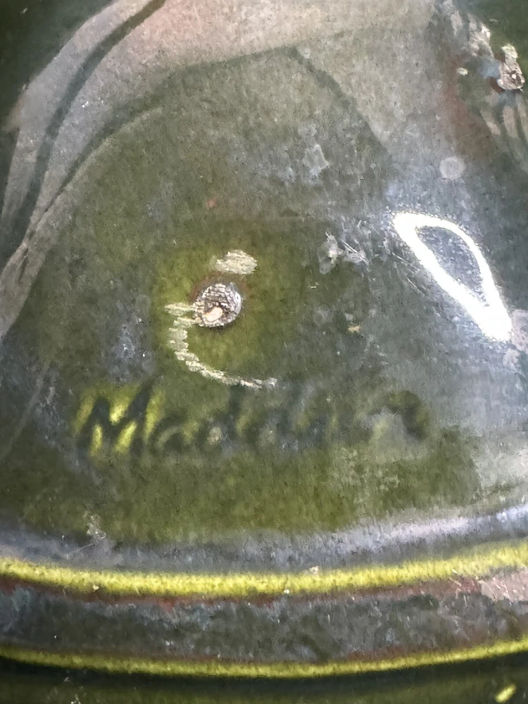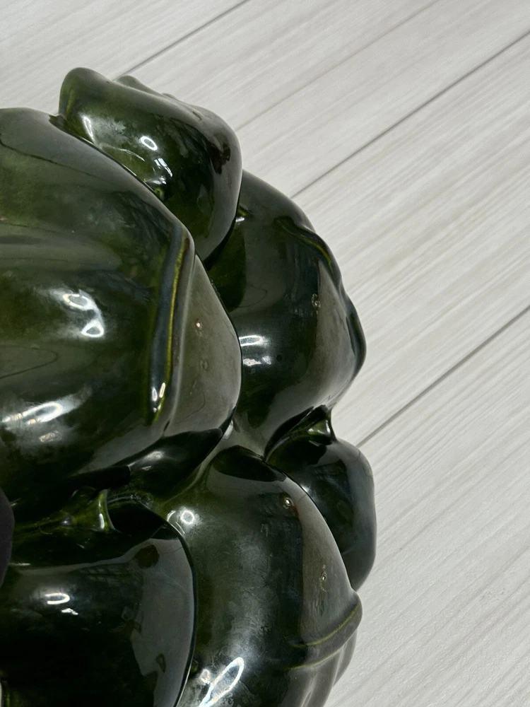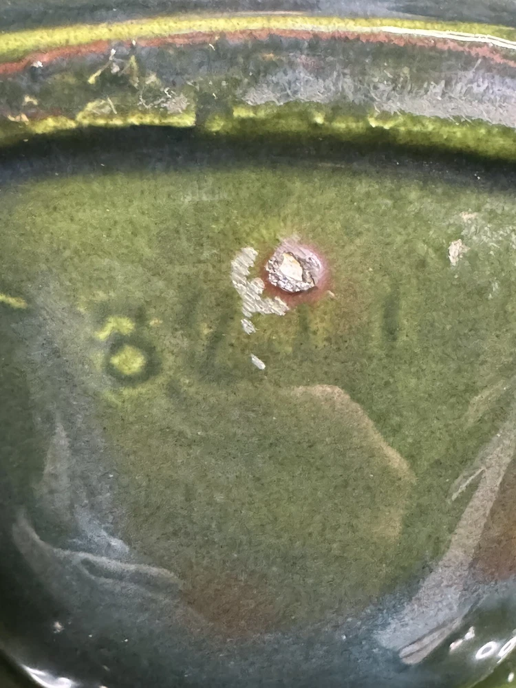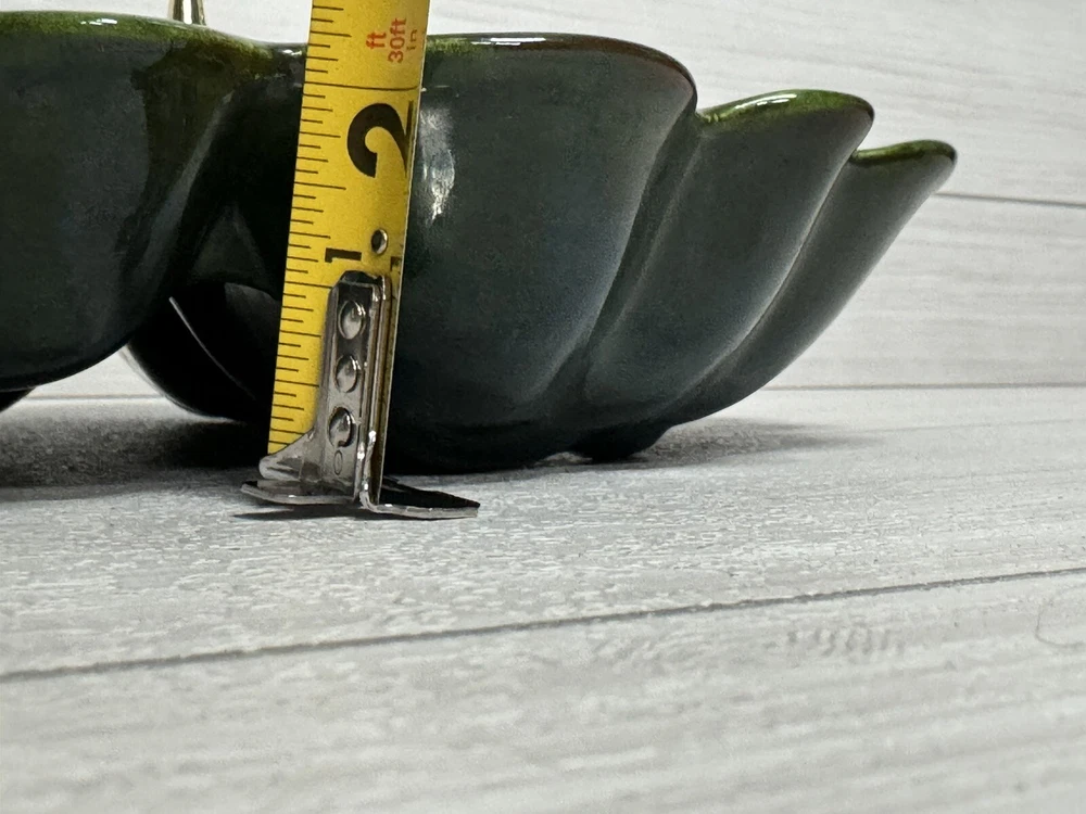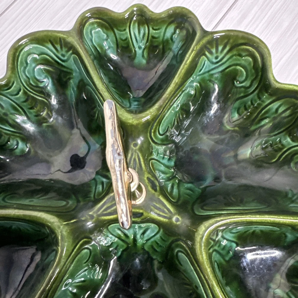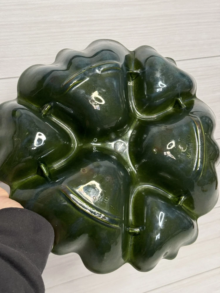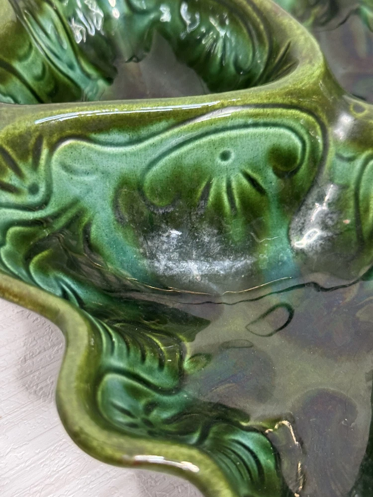 Beautiful scalloped edge serving tray for appetizers or vegetables. The top of the handle does have some wear , but that should be expected from normal wear and its age. Nice statement piece for any kitchen.