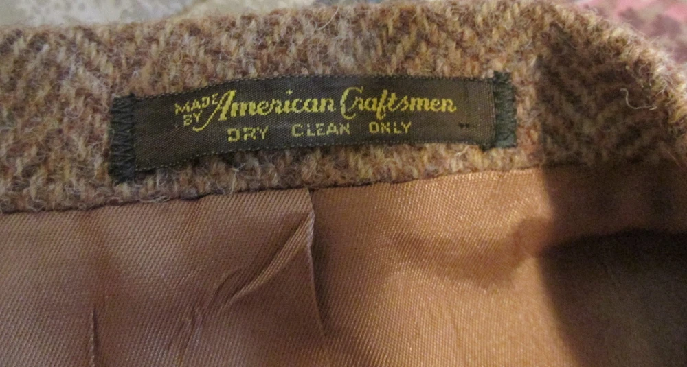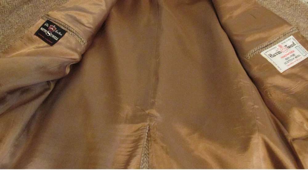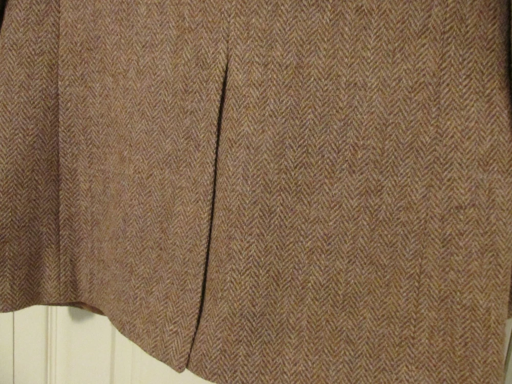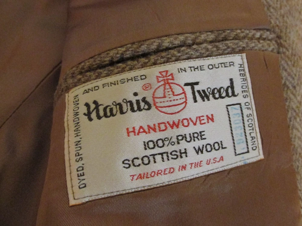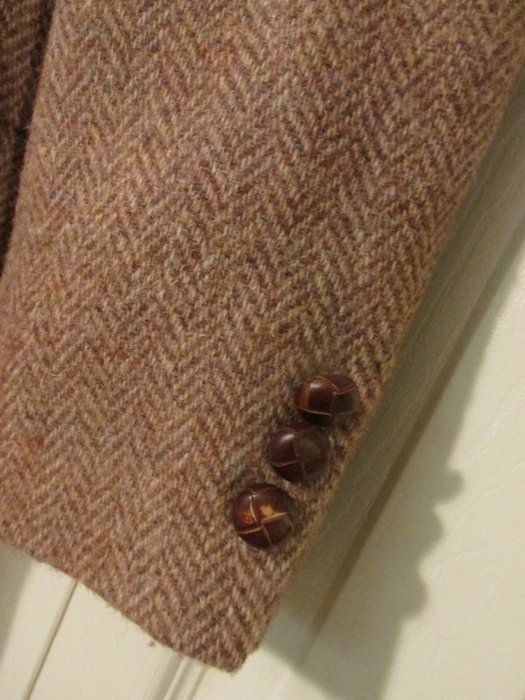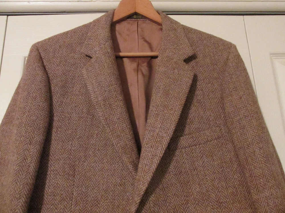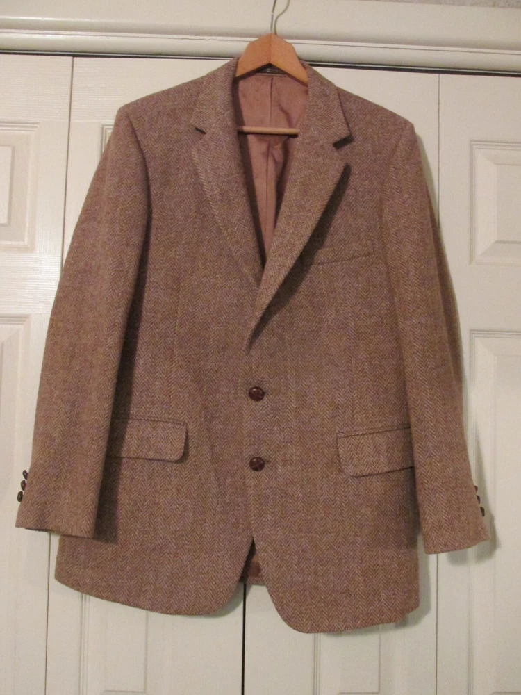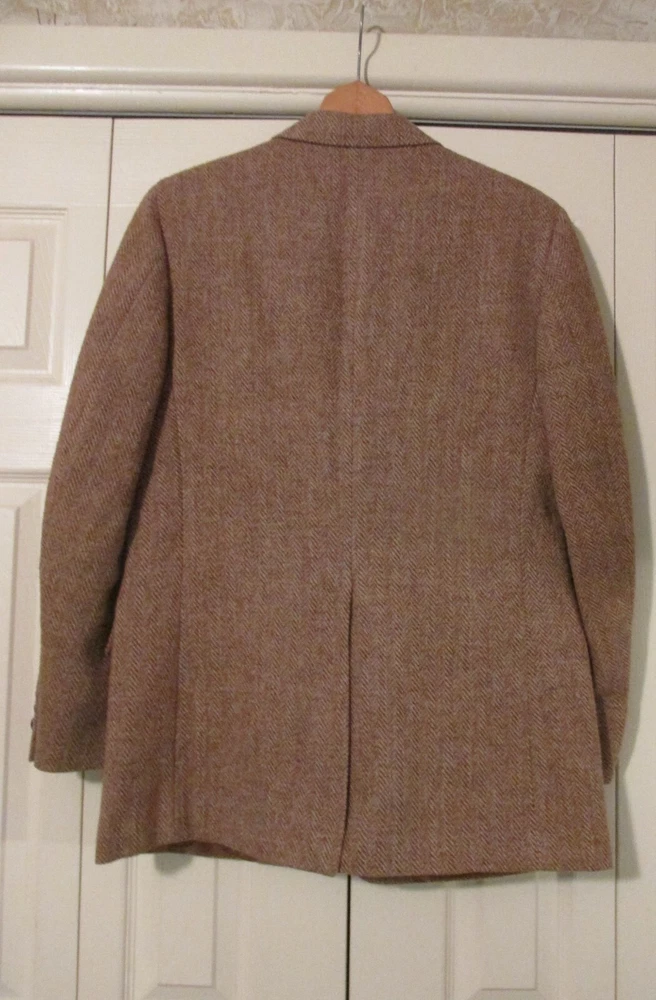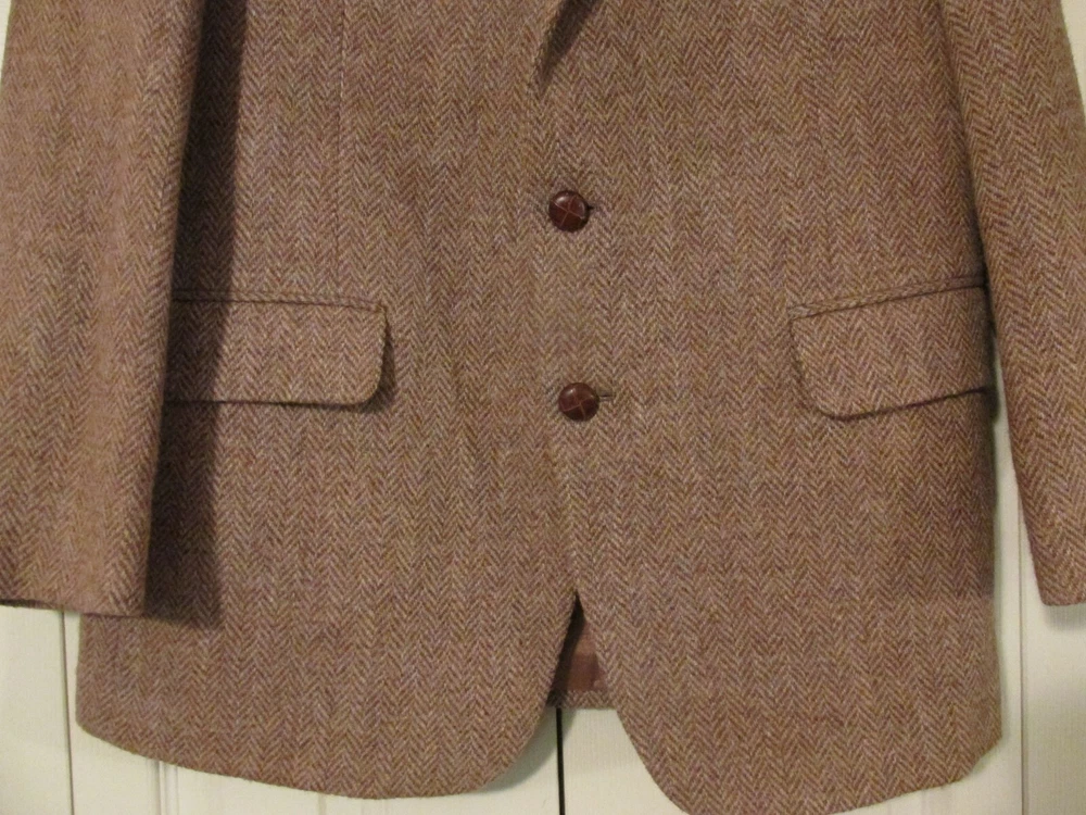 Vtg. Men's Herringbone Harris Wool Tweed Sport Jacket Made in USA Handwoven Scottish Wool. Leather covered buttons. Measurements: Chest - armpit to armpit 20 in. Mid-19 in. Shoulder - 17 in. Length - 32 in. Sleeve - 24 in. Check measurements carefully. No size tag. Probably a size 38.