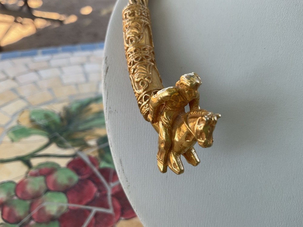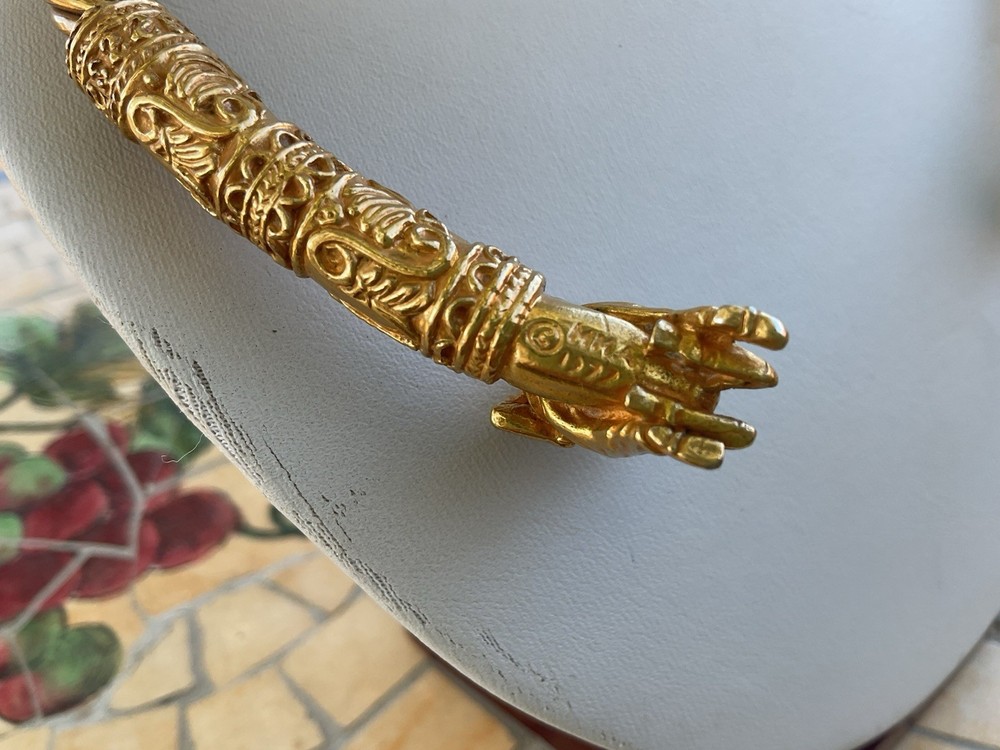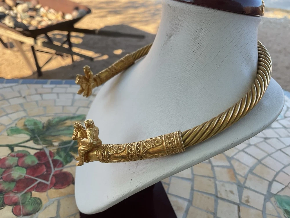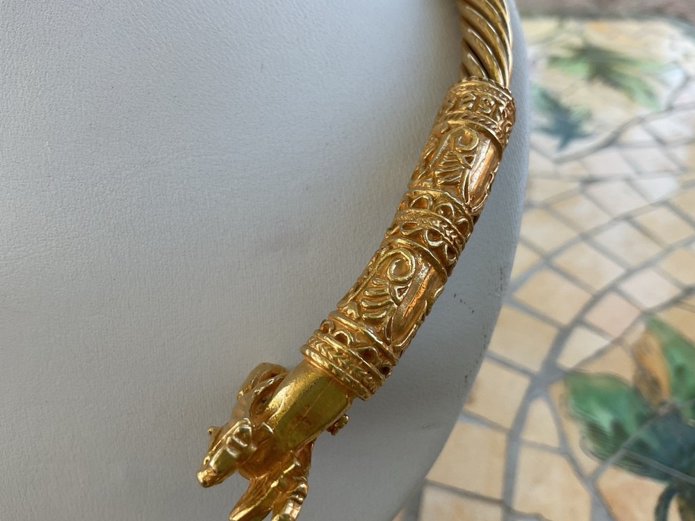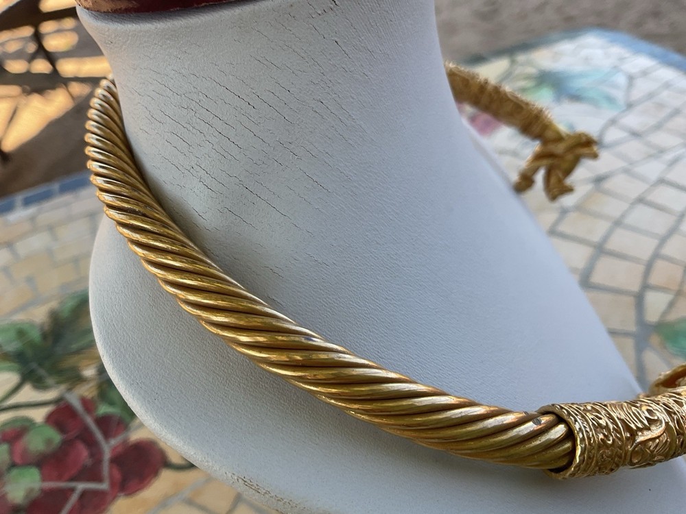 The product is a vintage necklace from the Metropolitan Museum of Art, specifically the 1977 Scythian Horsemen Torque GP Necklace. This choker style necklace features a yellow gold plated metal design without any main stone. The sleek and classic design of this piece makes it a timeless accessory for any jewelry lover.