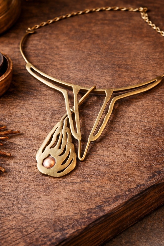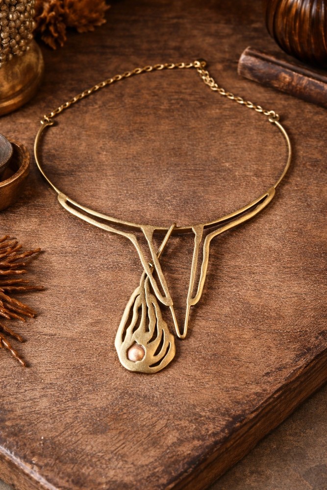 Exceptional vintage Mid Century Modern studio necklace, handcrafted in solid brass with a warm copper inset accent. This sculptural piece features an organically formed openwork pendant suspended from a hand-worked wire collar, reflecting classic Arts & Crafts and MCM design influences. The brass has developed a beautiful natural patina, highlighting the fluid, flame- or leaf-like lines of the pendant. The copper detail is flush-set, adding contrast and depth typical of 1950s–1970s artisan metalwork. Unmarked, but clearly studio made—not mass produced. A striking statement necklace for collectors of mid-century modern, studio jewelry, or sculptural metal design. Details: Era: c. 1955–1975 Materials: Solid brass & copper Style: Mid Century Modern / Arts & Crafts Construction: Hand-formed wire collar with hook closure and safety chain Markings: None (artisan studio piece) Condition: Very good vintage condition with age-appropriate patina Perfect for collectors, designers, or anyone who appreciates bold, architectural vintage jewelry.