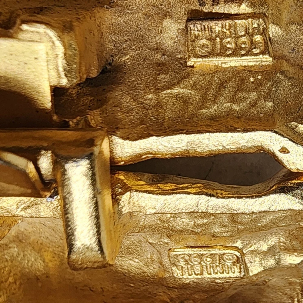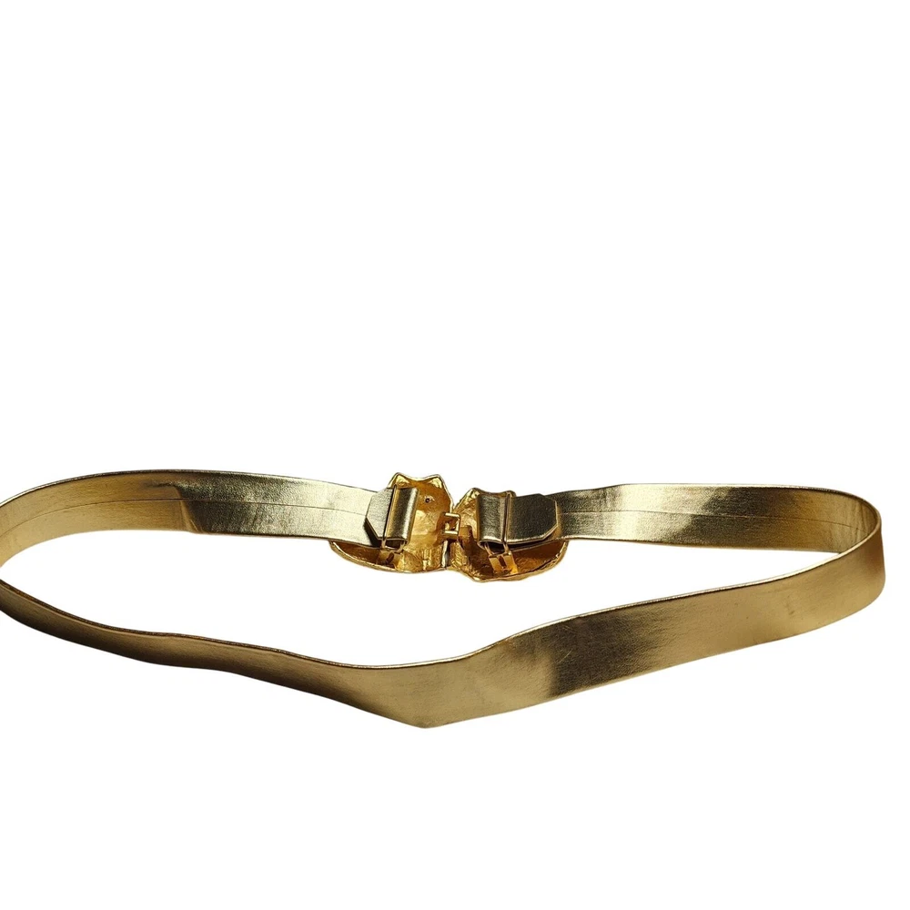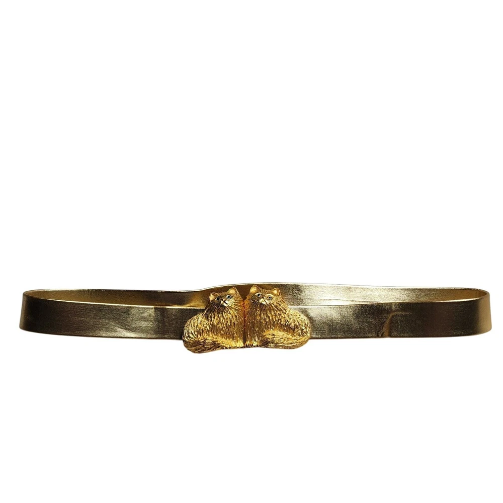 Vtg Mimi Di N Gold Cat Double Buckle Novelty Belt 1993 Stamp Cat Lover Unique 33" strap length adjustable, no notable flaws. Tags: Vintage, Cat Lover, 90s, Eclectic, Funky, Bold