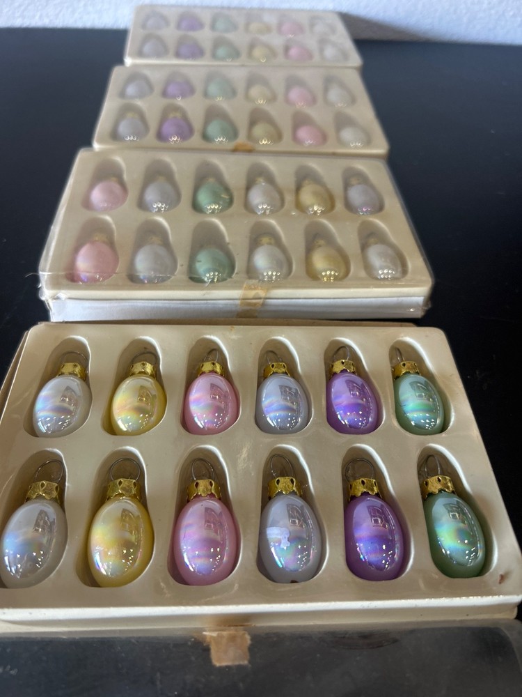 Vintage box of mini Easter egg ornaments - blown glass -iridescent pastel shades. 12 assorted colors per box Free shipping