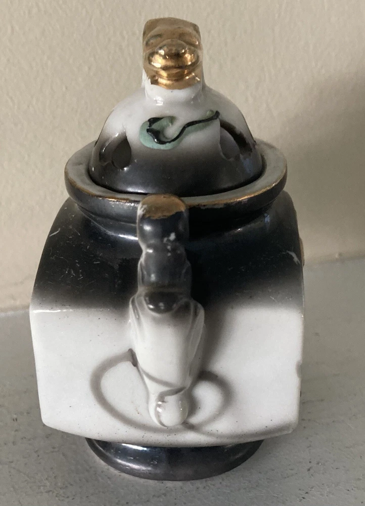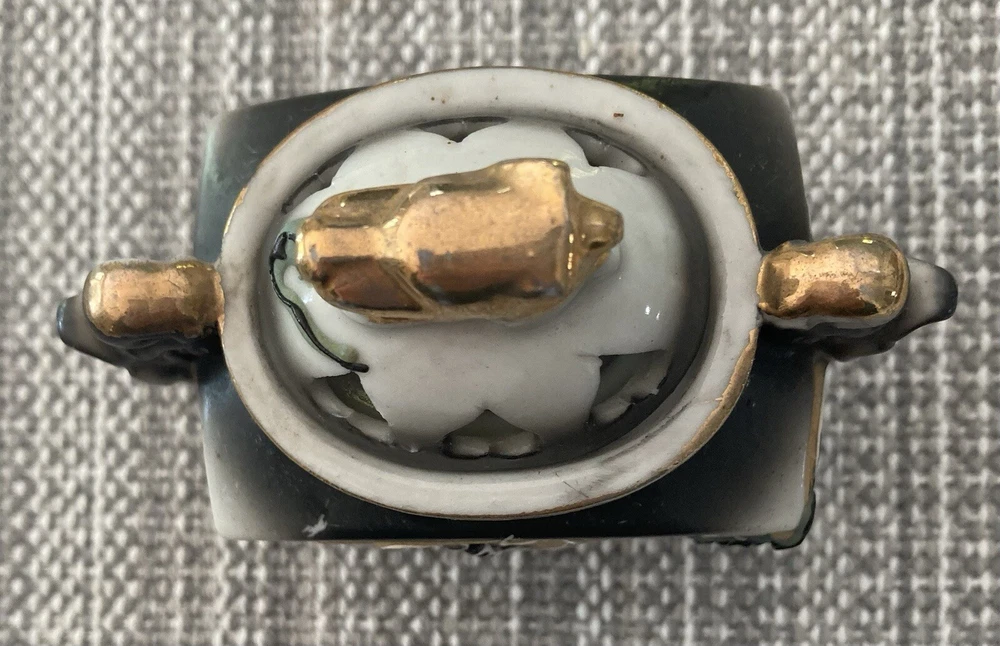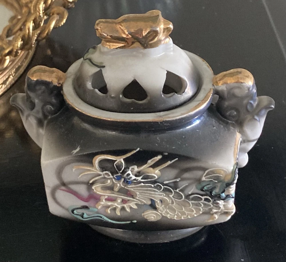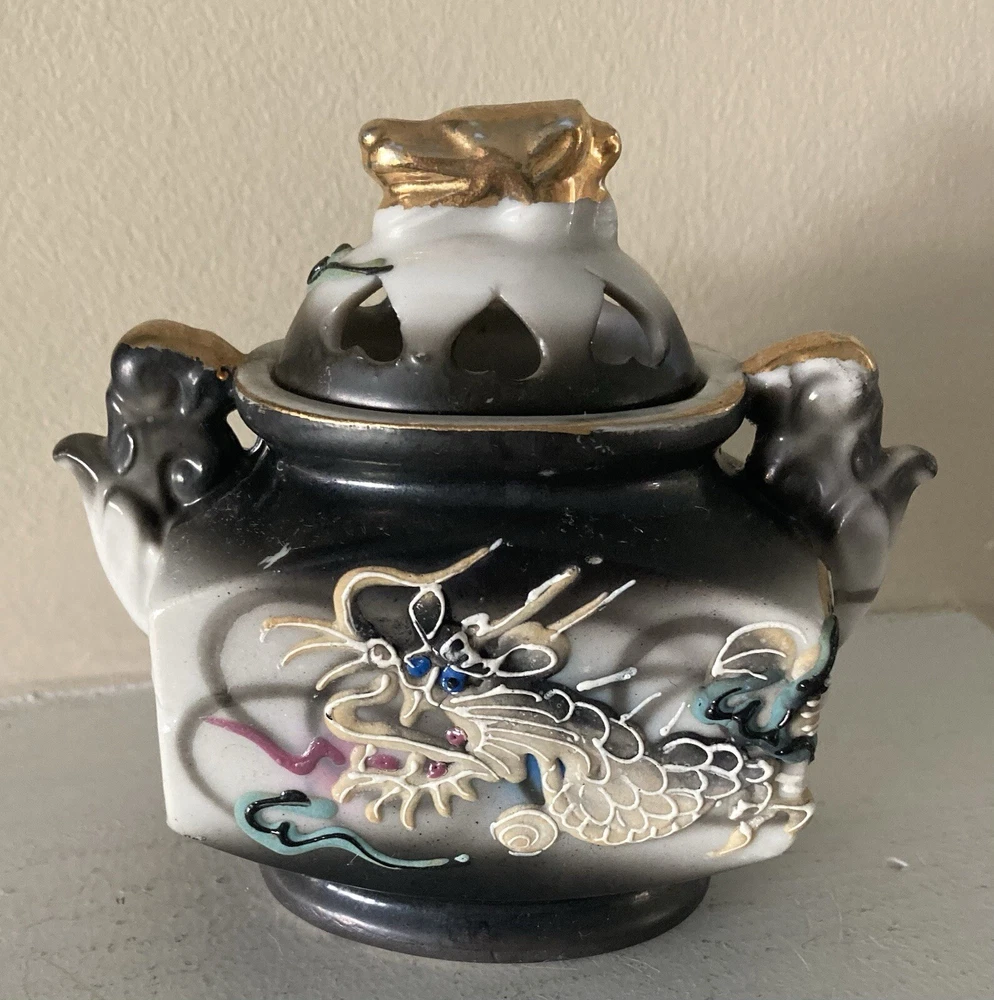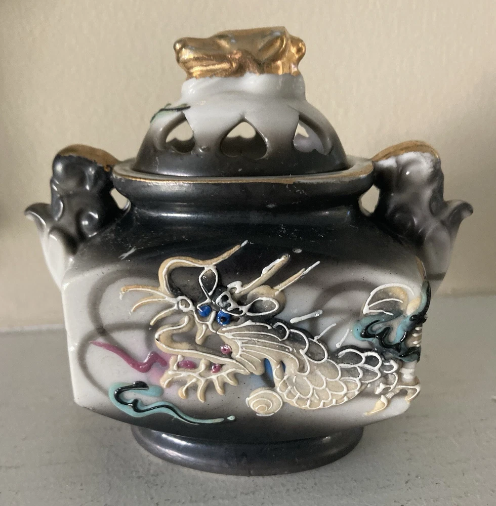 This vintage Moriage Dragonware lidded incense burner is a beautiful addition to any collection. Made in Japan by Enesco, it features a stunning blue-eyed dragon and has gold accents that adds a touch of elegance to any room. The intricate dragon design on the burner is a nod to Japanese culture, making it a great piece for anyone who loves to collect items that showcase different cultures and ethnicities. Whether you're a collector or just looking for a unique decorative item, this incense burner is sure to impress. 4”x 4”x 2 1/8” Preowned/please use zoom to see detail and condition. Vintage piece with normal age related wear. Great little incense burner. Shipping in Continental US only. Shipping USPS Ground Advantage.