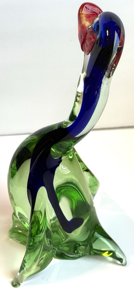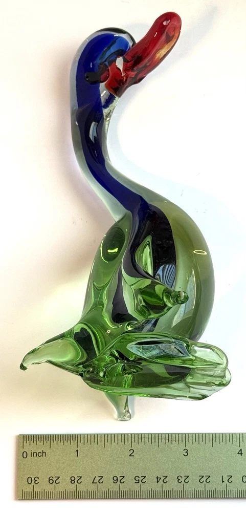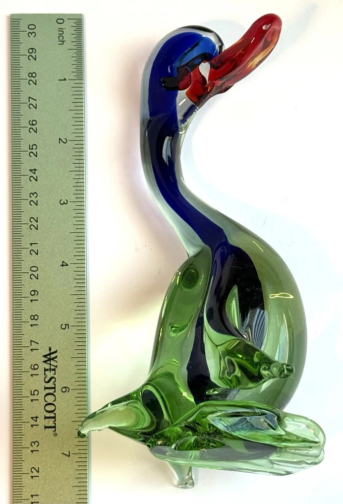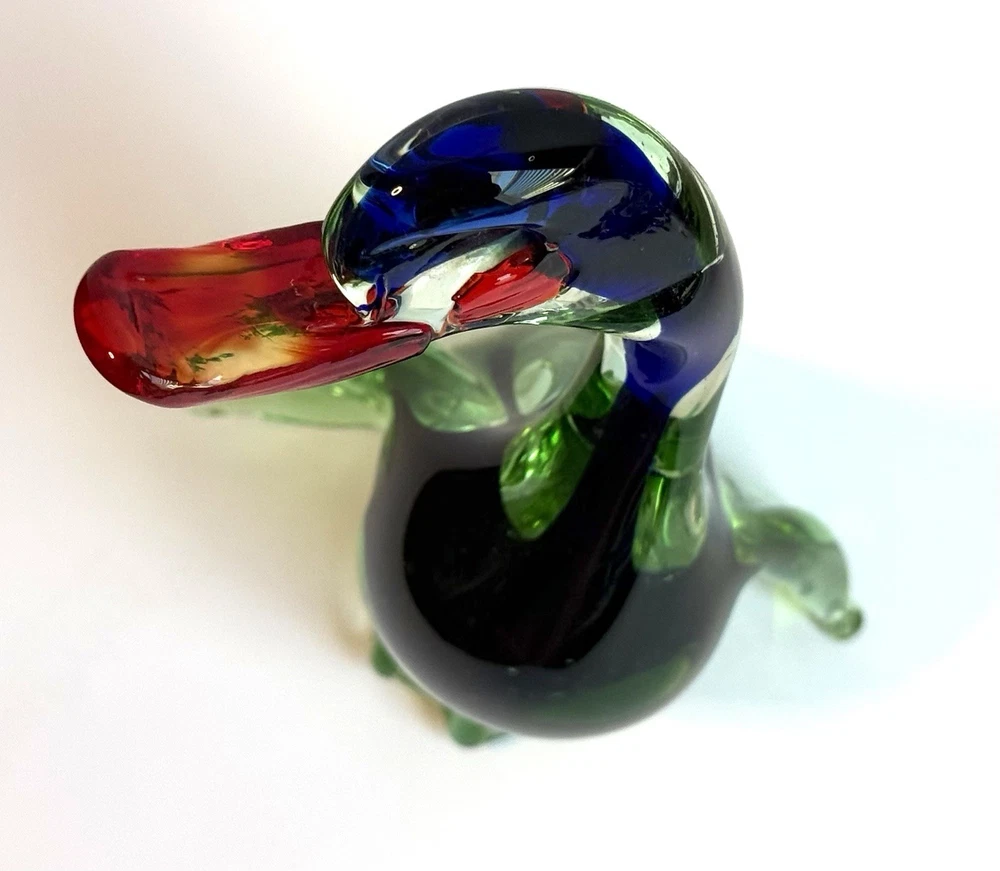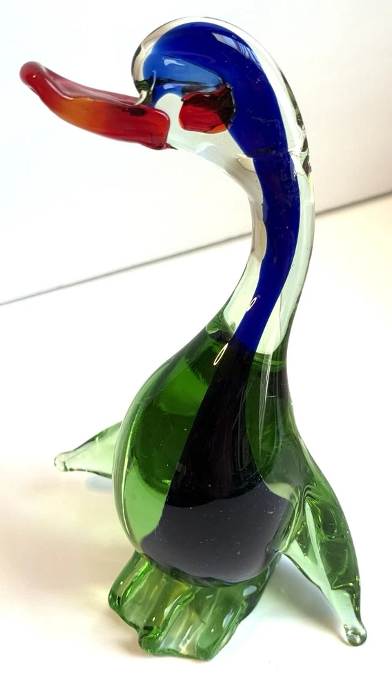 This vintage Murano glass duck figurine showcases the intricate craftsmanship of hand-blown glassmaking in Italy. Standing at 7.5 inches tall, this unique piece features a stunning blend of green, blue, and red colors known as sommerso technique. The duck figurine captures the essence of mid-century design with its delicate details and vibrant hues, making it a beautiful decorative piece for any space. Made in the renowned glassmaking city of Murano, this figurine is a timeless treasure that reflects the artistry and tradition of Venetian glassmaking.