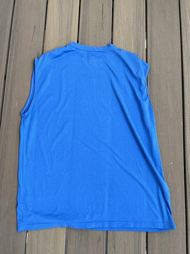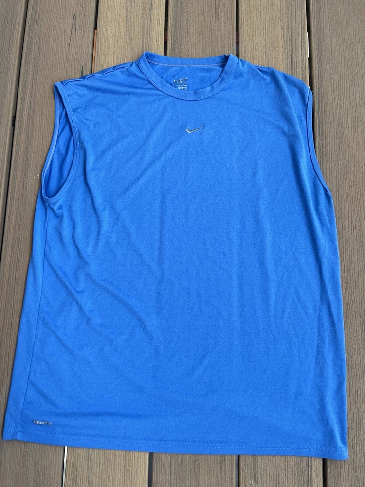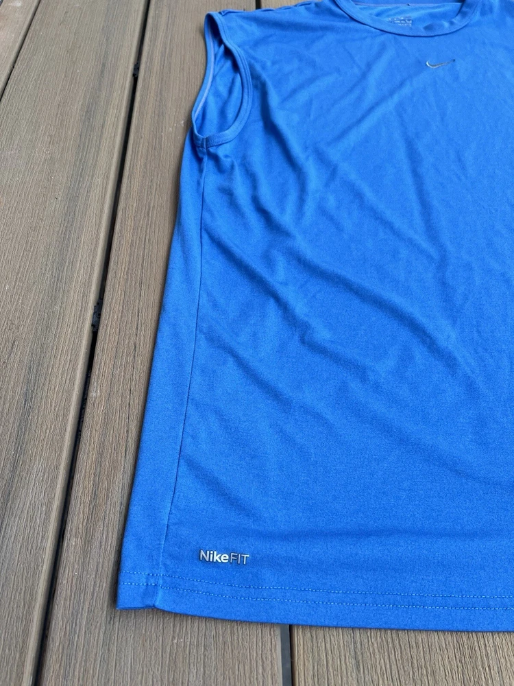 Elevate your workout wardrobe with this vintage Nike Fit Dry Tank Top. Designed for men in a size L, this blue tank top features a classic crew neck and is sleeveless, making it perfect for a wide range of activities including running, gym training, and basketball. The breathable and lightweight fabric ensures you stay comfortable during intense workouts, while the mesh fabric type offers added ventilation. This Nike Dri-FIT tank top is perfect for all seasons, and its solid blue color complements any sporty look. The top is collarless, and its pullover closure ensures easy wear. Ideal for travel, activewear, and casual wear, this tank top is a great addition to any Nike collection.