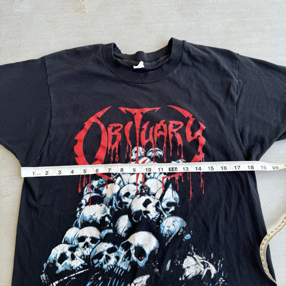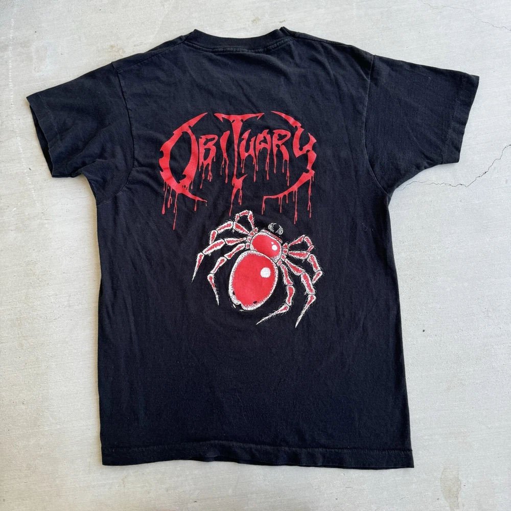 This vintage t-shirt featured the band obituary with a skull graphic on front and spider on back. The shirt is made of a cotton-polyester blend and has a black color. It is a size medium and has a regular fit. The shirt is perfect for fans of death metal. The t-shirt is from a tour and has a double-face design. It is practical for all seasons and is available in regular size type. This t-shirt is a rare find for any metal fan and is a must-have for any collection.