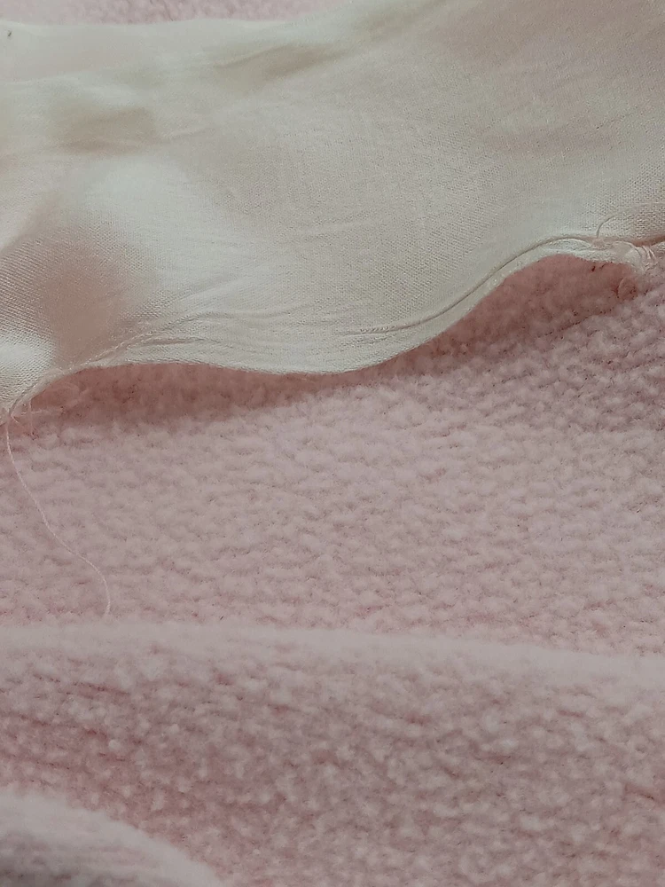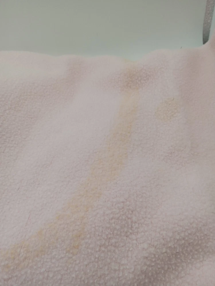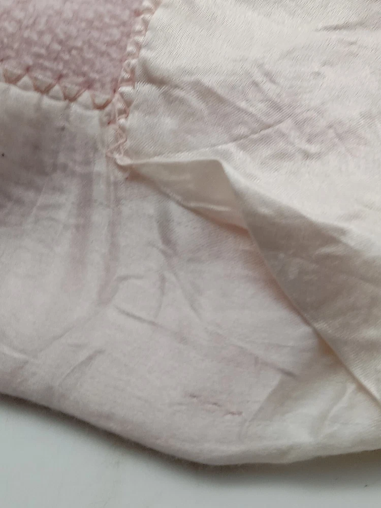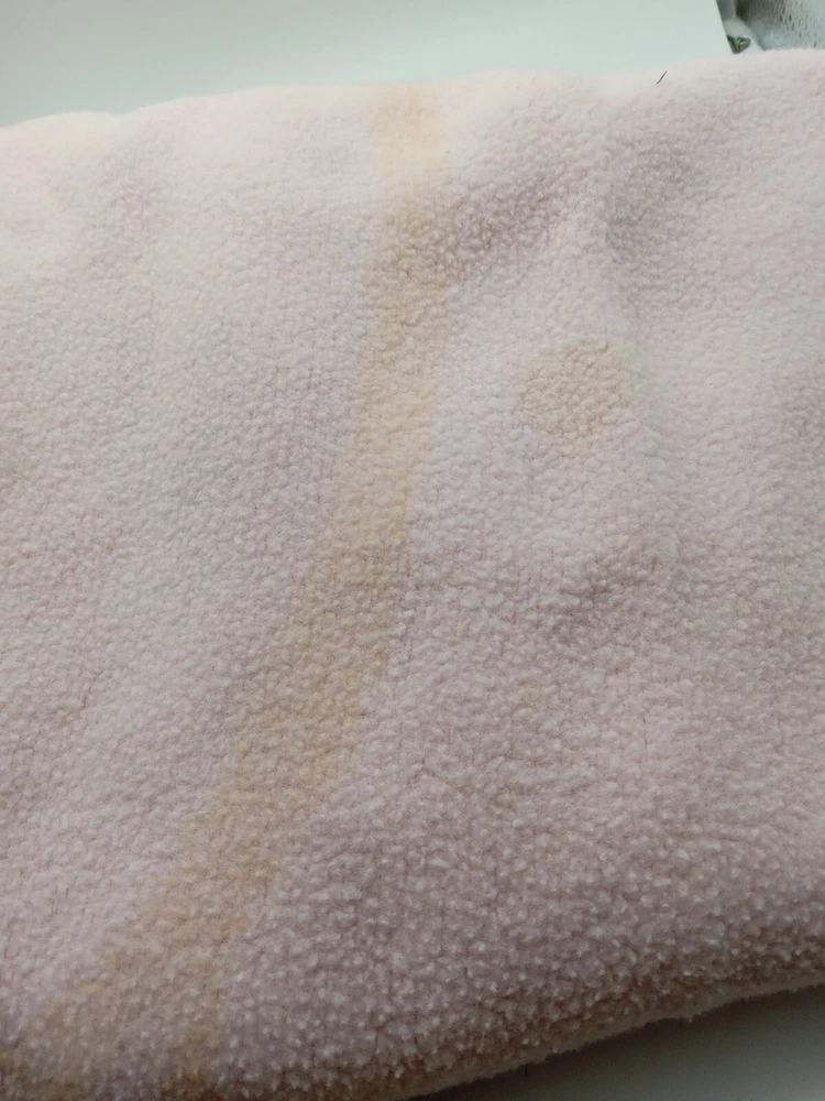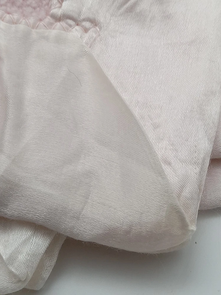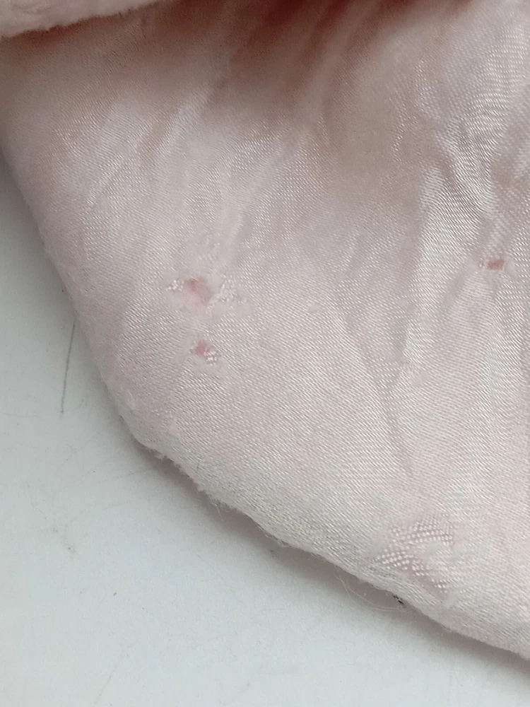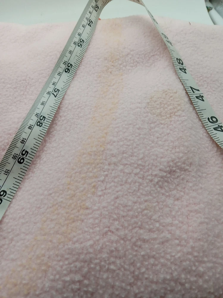 Vintage pink fleece baby blanket with a satin binding. Measuring 36 x 44 inches, this multi-purpose blanket is perfect for cuddling, swaddling, and even as a crib cover. Stain is outlined with tape measure. It's very light and hard to see. Please look at pictures closely for condition.