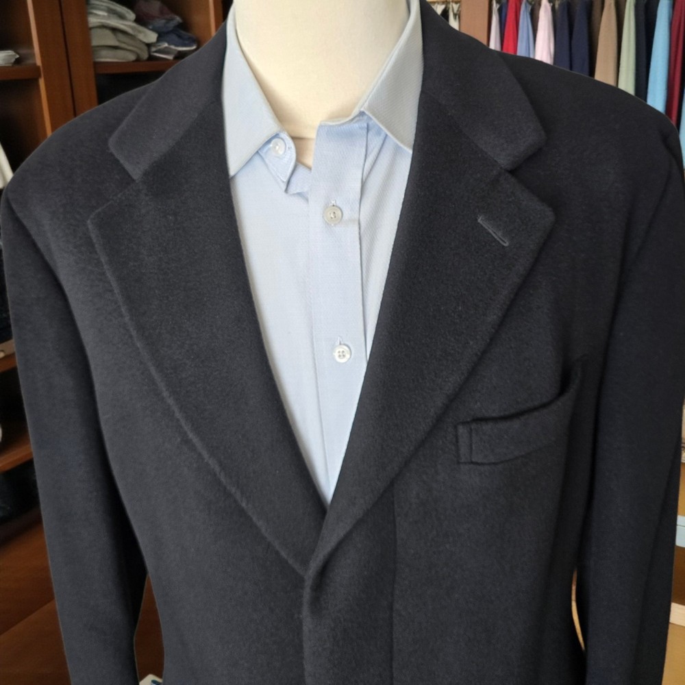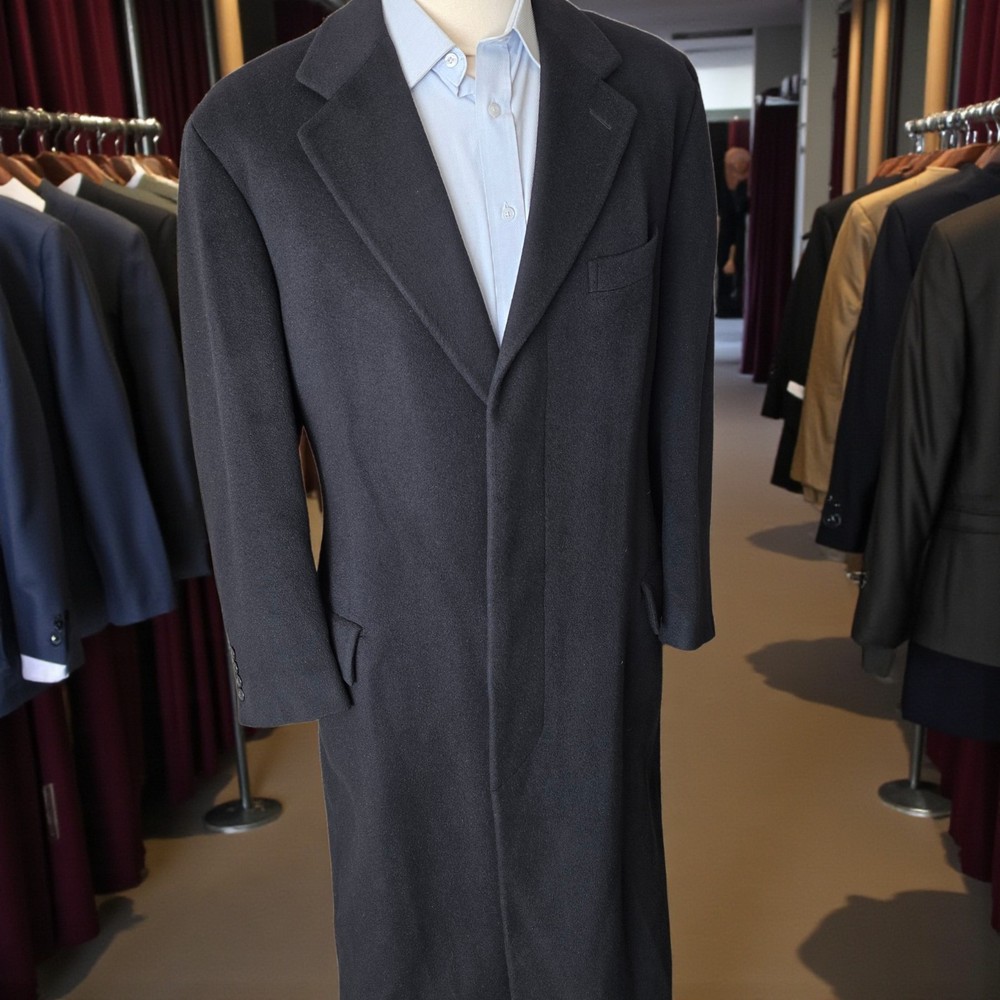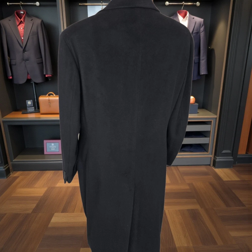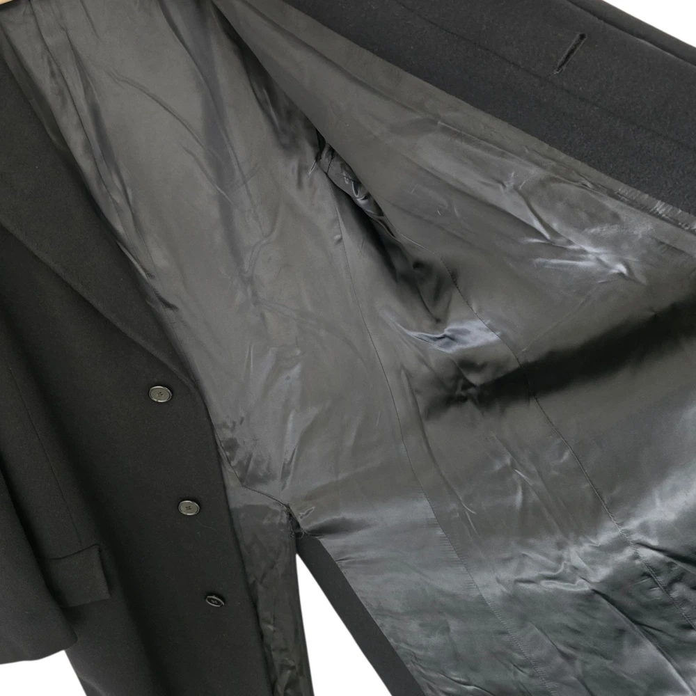 Size: 44L USA with*** 25 inch arm length***and a jacket length of 48 inches. For complete measurements, see photo #2 To see exactly how we measured, see the last series of photos. Color: black Condition: excellent vintage condition. No real signs of use. No flaws. No holes. No stains. No smells. No snags. Midweight cashmere, light structure, light shoulder pads, full length, hidden buttons Return policy: We offer free shipping and no returns. We can not afford to offer both in the highest return category on eBay. It becomes very expensive to mail out items for free for people to try on if they are not confident in checking the measurements in picture #2. If you prefer to have the ability to return the item and pay $12.95 shipping, please send us a message, and we can change the listing format to offer returns. The $12.95 shipping cost would break us out even in the case you needed to return the item. We ship the next business day after the payment is made.