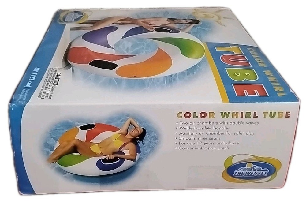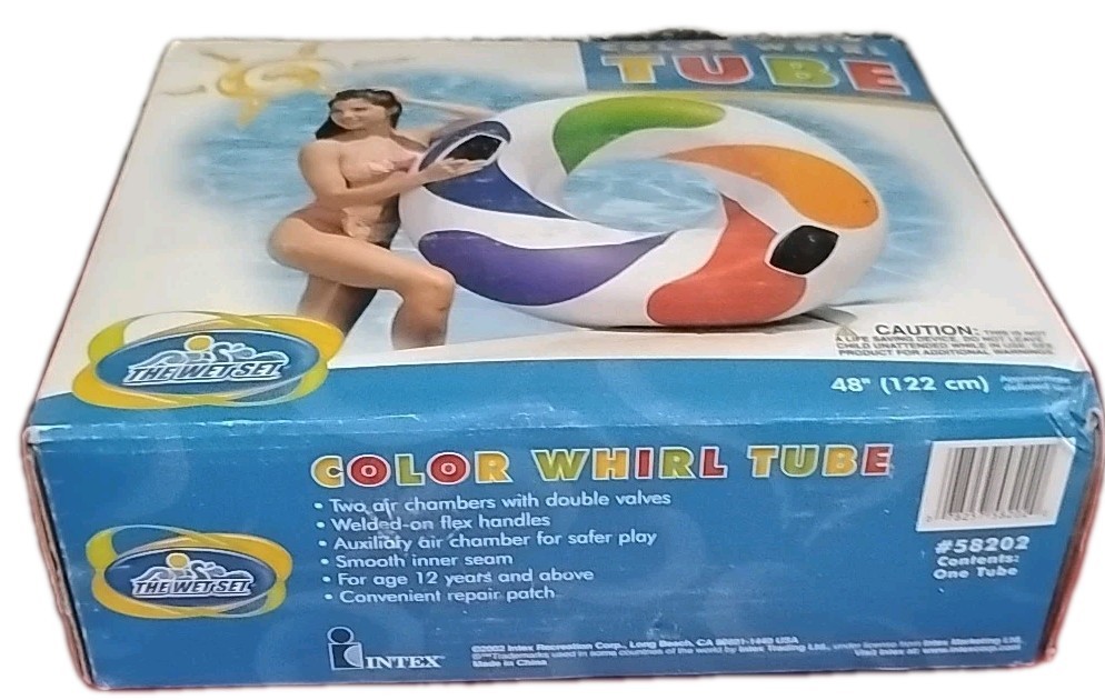 Brand new never opened. The Vtg Pool Float Intex Wet Set Color Whirl Tube is a round inflatable pool float designed for all ages. With a colorful multicolor design and a diameter of 48 inches, this vintage float from 2002 is perfect for beach days and pool parties. Made by the reputable brand Intex in China, this float is suitable for children aged 3 and above, making it a fun and safe option for family gatherings by the water.