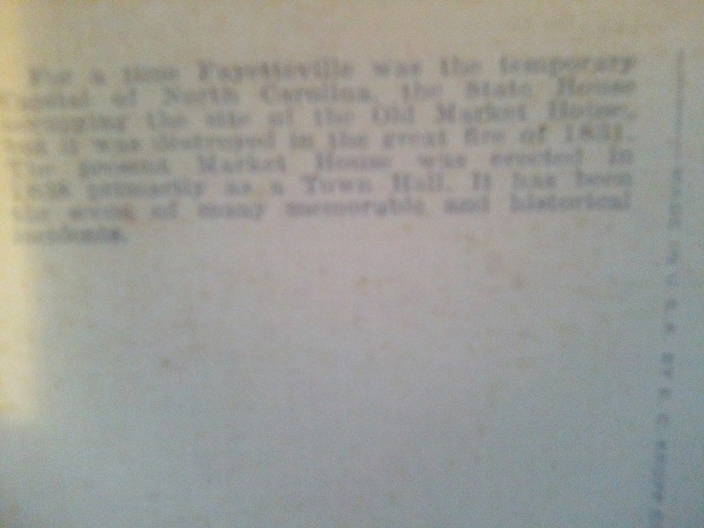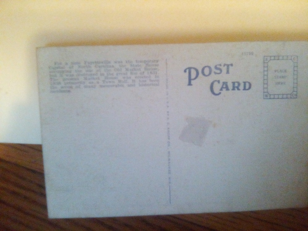 The product is a vintage postcard featuring the Old Market House in Fayetteville, North Carolina. Built in 1838, this historic structure is depicted in the postcard, which is an original printed lithograph from the era of linen postcards (1930-1945). The postcard measures a standard size of 5.5 x 3.5 inches and was made of paper. It does not feature any signatures and was never posted. This collectible item provides a glimpse into the city's past and is a unique addition to any postcard collection focusing on North Carolina's history.
