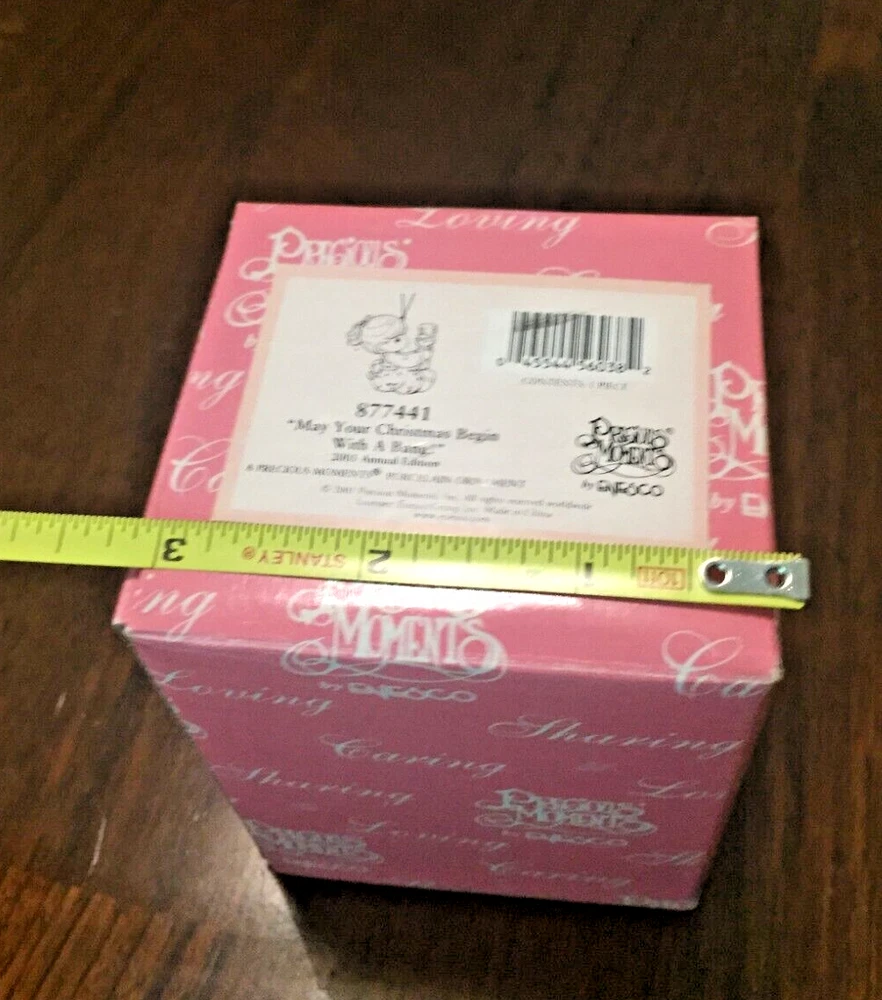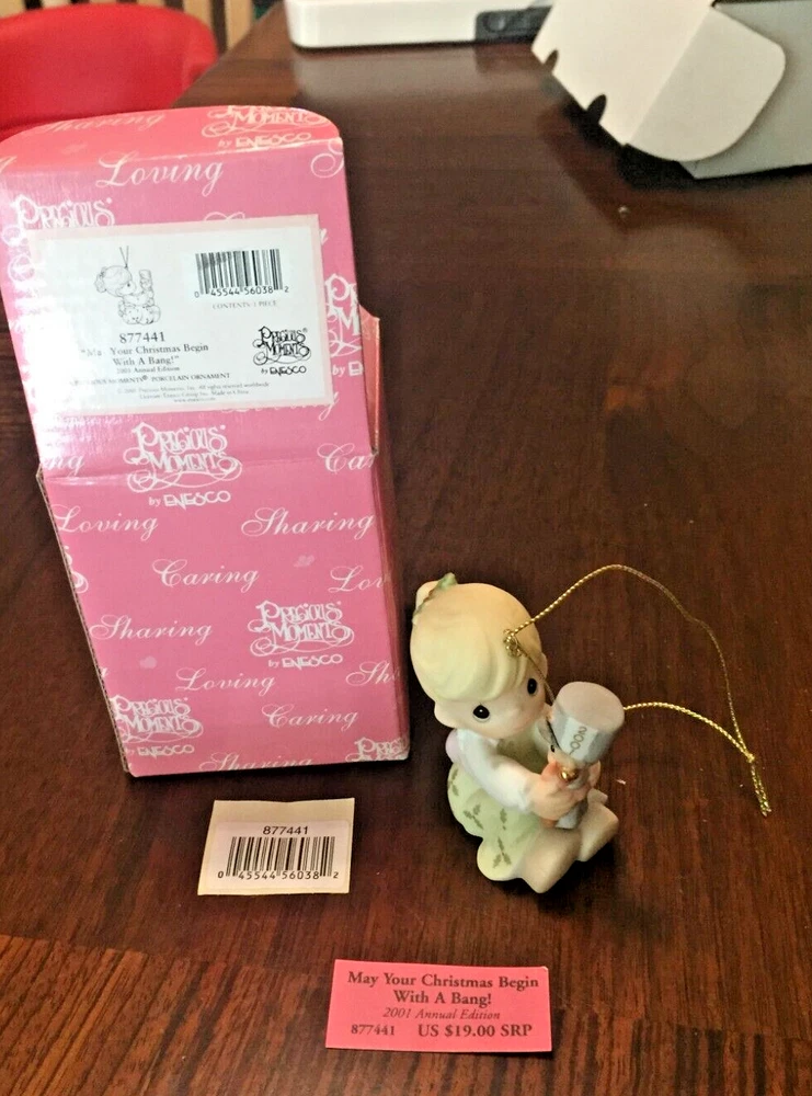 Vintage Precious Moments Hanging Ornament 2001 "May Your Christmas Begin With A Bang" 877441 Retired w Box May Your Christmas Begin With A Bang by PRECIOUS MOMENTS Style#: 877441 Description: A Girl is holding a Toy Soldier Pattern: Enesco Measurement: Around 2.75 ”*2”*3” See pictures for all details. Comes from a smoke free home. Any questions please ask. I can combine shipping. Thanks so much for looking and please browse my other items. Item's will be packed well and shipped quickly.