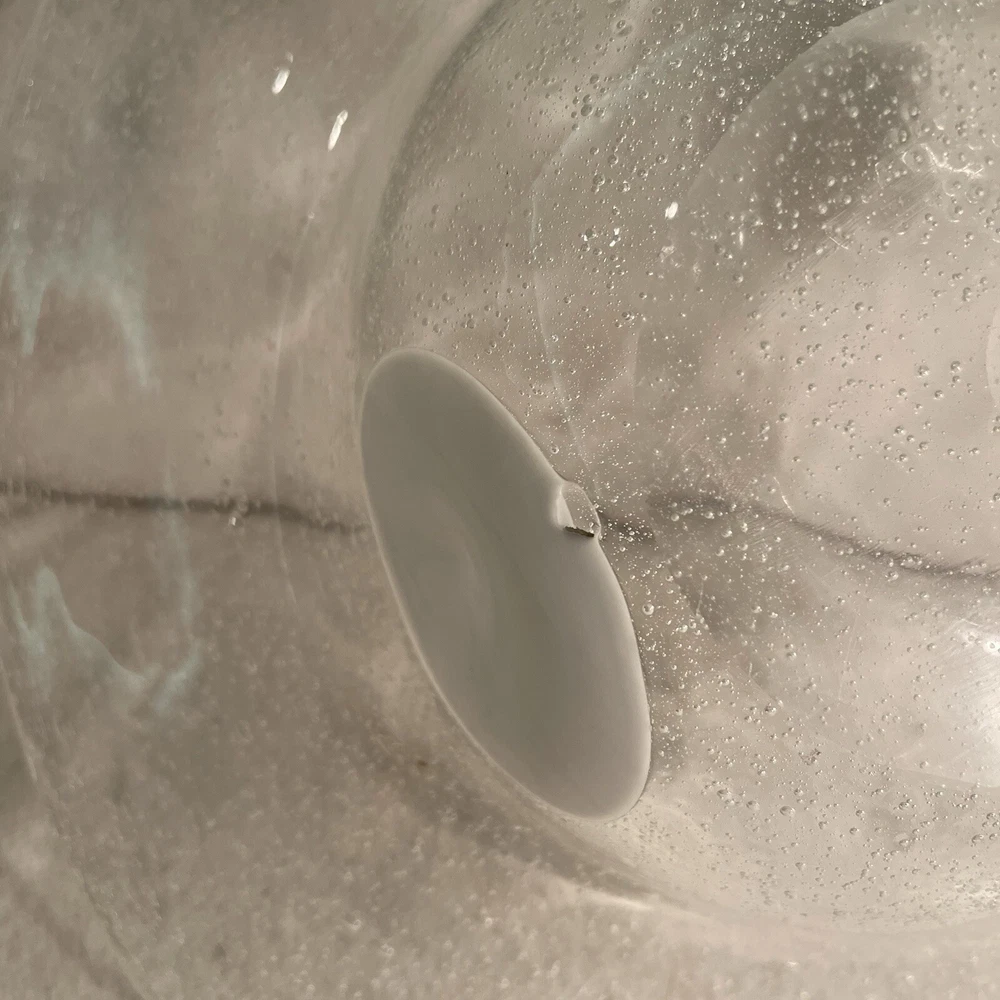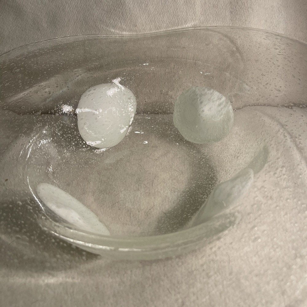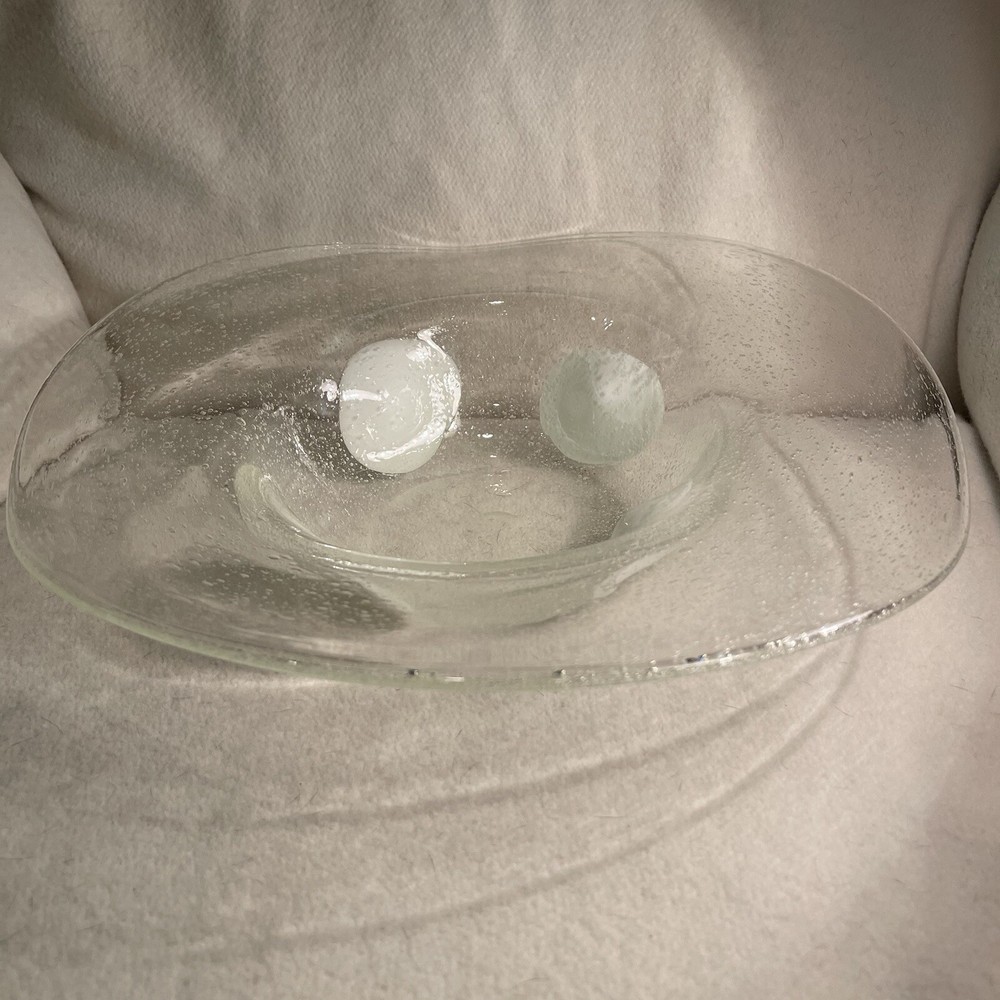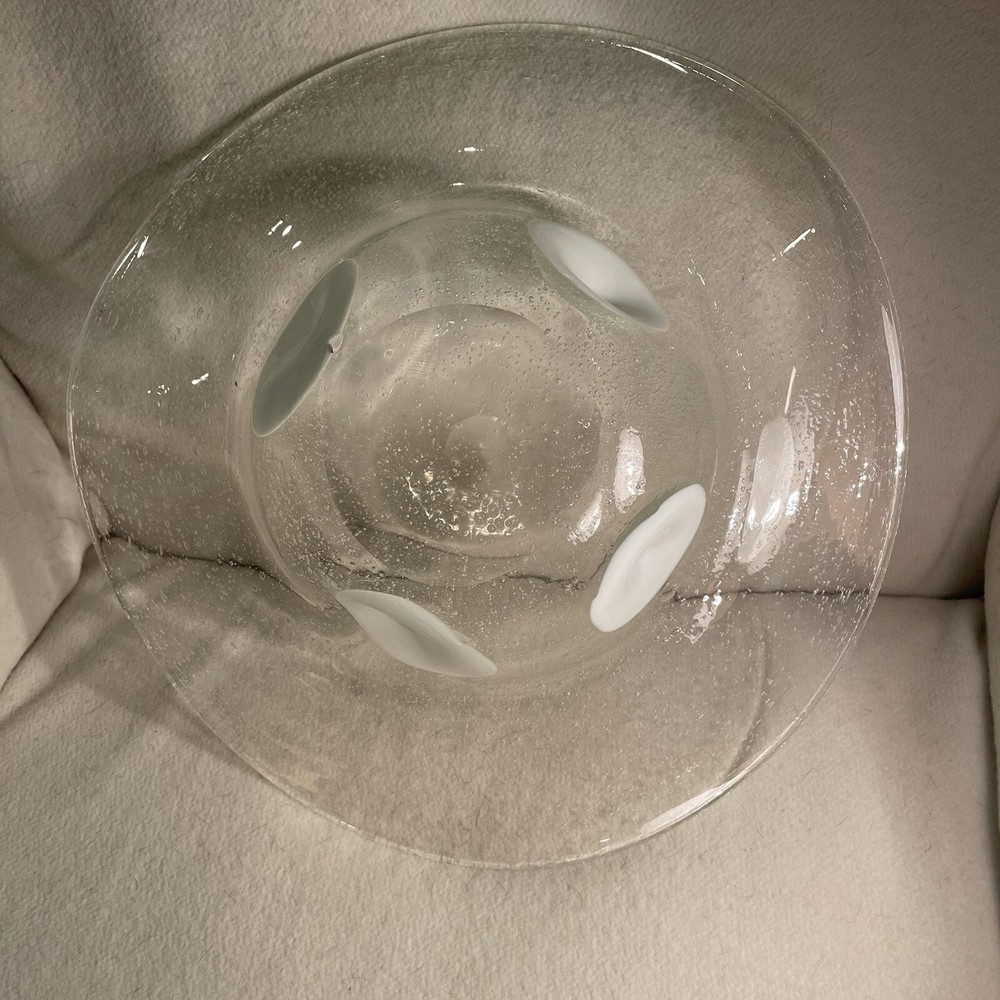 This vintage handmade art bowl is a unique piece of blown glass from Italy, featuring a wavy round shape with white fused patches. The clear white color and contemporary style make it suitable for all occasions, adding a decorative touch to any setting. With a diameter of 14 inches and a height of 3.25 inches, this bowl weighs 3.10 lbs and showcases the artistry of fused glass production techniques from the 1980s. Perfect for collectors or those looking to add a touch of elegance to their home decor. Excellent condition. No chips or cracks. It does have a defect on one of the white patches which must have occurred during the manufacturing process. See photos.