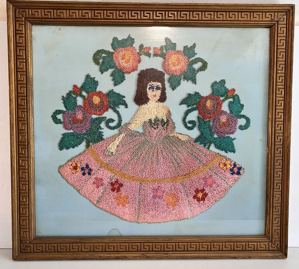 Vintage Punch Needle Art on Satin Greek Key Wood Frame with Glass Woman/Floral Needlework depicts a woman in a ball gown surrounded by floral designs. This measures with frame 21.5" x 24" This weighs 8 lbs. This is a pre-owned item and show signs of wear and age. The satin material on which the needlework is done has some signs of being slightly soiled. Please look at photos. The wood frame has a couple of snags which could be sanded smooth. Sold as is. I would be willing to remove the glass for shipping to decrease cost of shipping and minimize risk of breakage. If you are interested in this option please let me know and I'll provide a way to calculate shipping without glass. As is the listed will calculate shipping with glass. Please look closely at photos for details. My goal is to provide a smooth and seamless shopping experience which will result in you receiving something you will enjoy! If you have any questions or concerns about the item or the transaction, please first message me so that I have an opportunity to correct the issue to the best of my ability which I am more than willing to do. Thank you for shopping with Collectible Kitsch, hope to see you again!