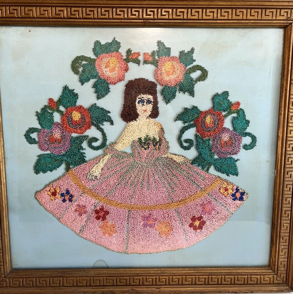 Vtg Punch Needle Art on Satin Greek Key Wood Frame with Glass Woman/Floral 21x24