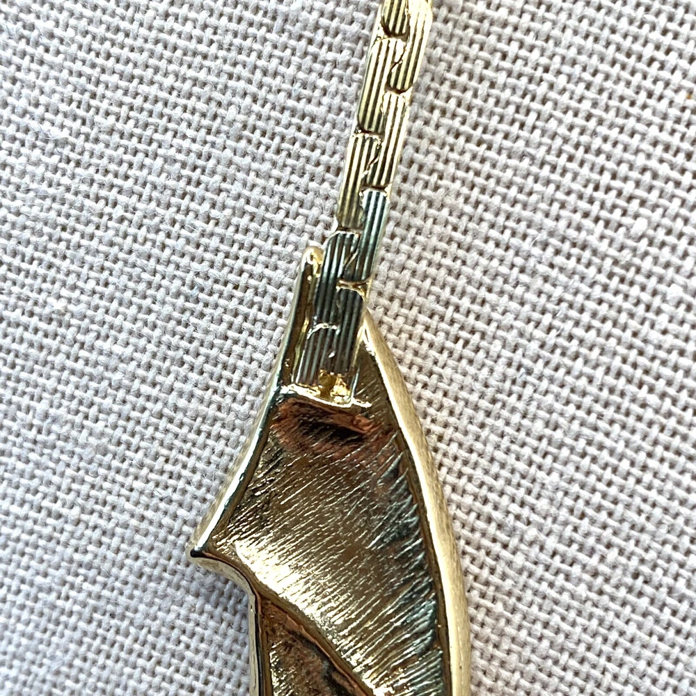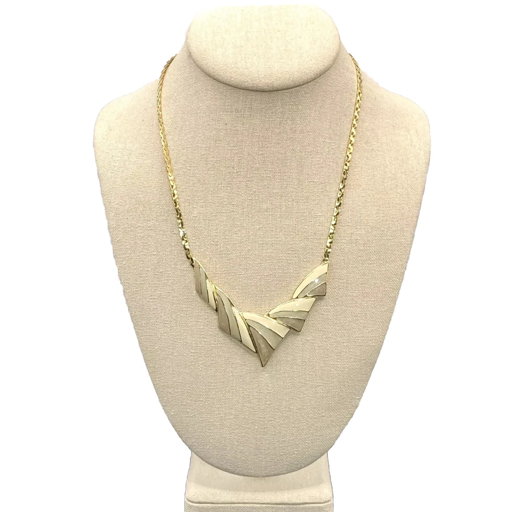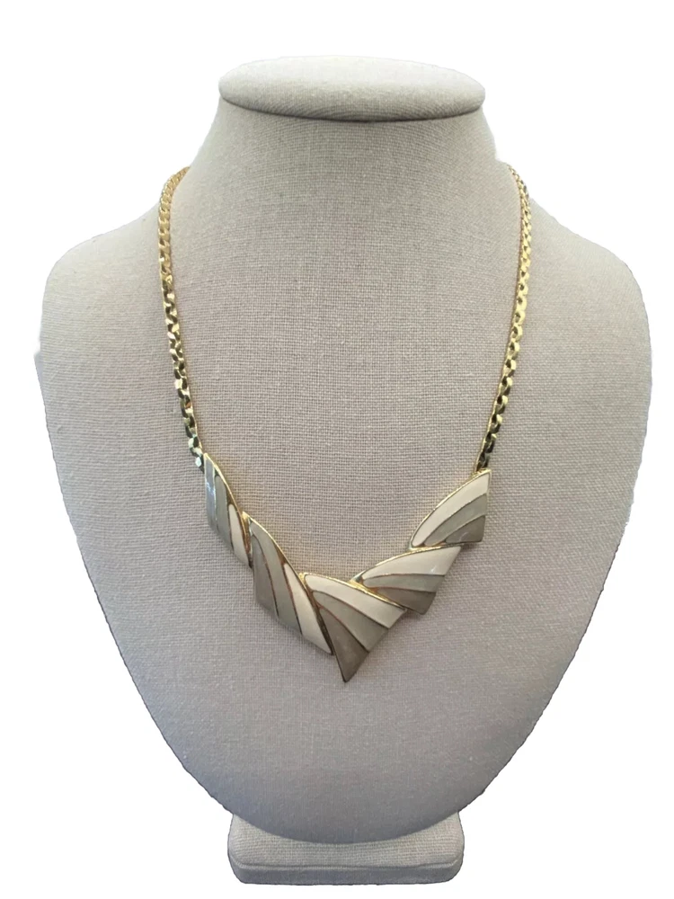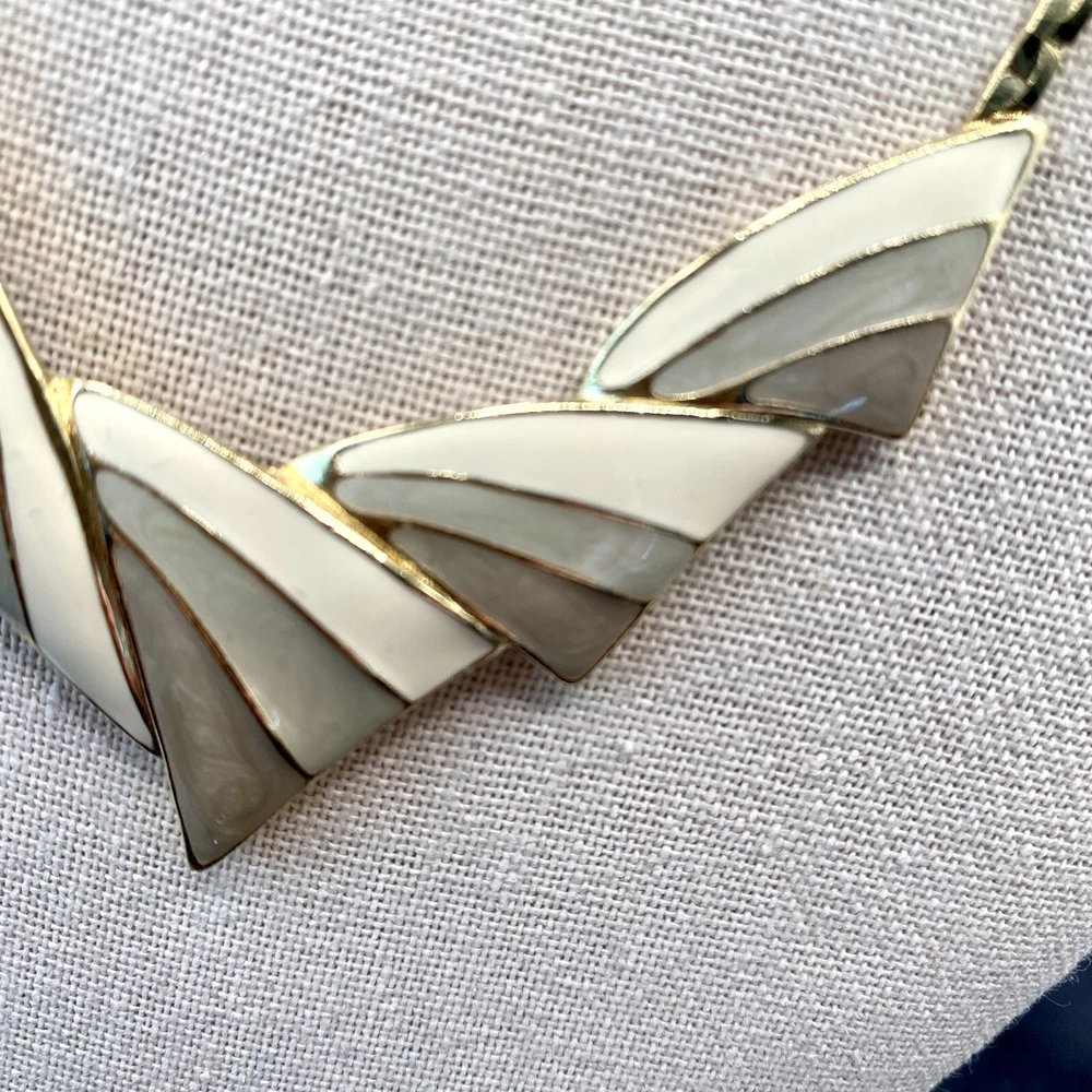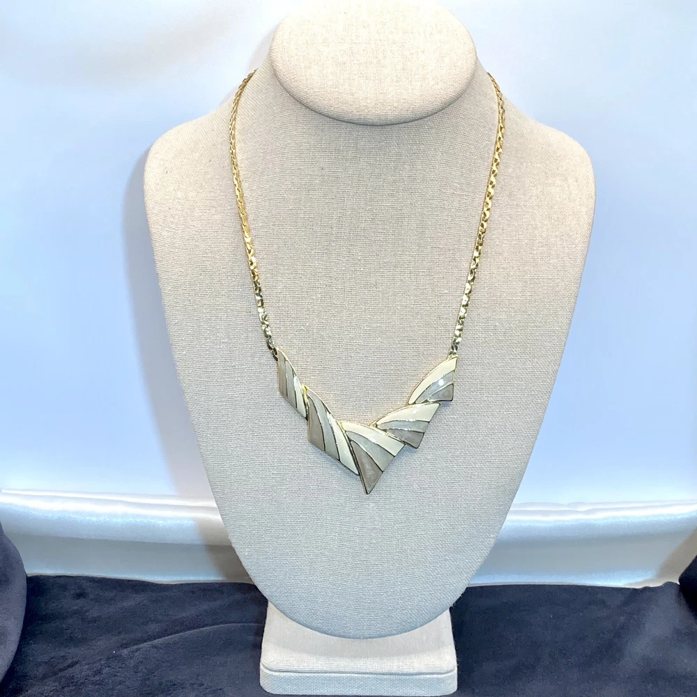 Add a touch of vintage beauty to your outfit with this rare Trifari necklace. The gold-tone metal necklace features a unique triangle-shaped pendant with a stunning eye-clean gemstone clarity grade. The pendant is spring-ring closed and hangs on an 18-inch chain with a spring-ring closure. The necklace is perfect for any occasion, including engagement, wedding, anniversary, graduation, birthdays, Father's Day, Mother's Day, Christmas, and Valentine's Day. The necklace is also customizable, making it a great gift for your loved ones. This one-of-a-kind necklace is signed by the renowned Trifari brand. The necklace is a perfect addition to any fashion jewelry collection. The pendant is made of metal and has a beautiful gold cream, gray, and green color. The necklace is an original piece, and it is not customized. The necklace is perfect for anyone who loves beauty, art, family and friends, and travel and places. Vintage Trifari GoldTone Enamel Necklace Choker Bib Tri Color Estate Statement Z This is a pre-owned piece. It may require cleaning. There may be scratching, fading, chips, normal wear, missing stones, etc… See Photos. If you have any questions, please feel free to contact me via eBay messaging. Thank you for stopping by. Make sure to check out other items in my store. Your satisfaction is my priority. Have a wonderful blessed day!