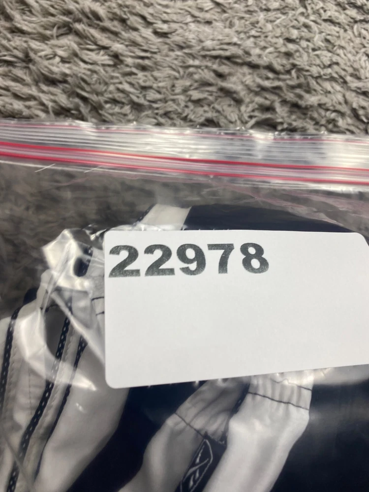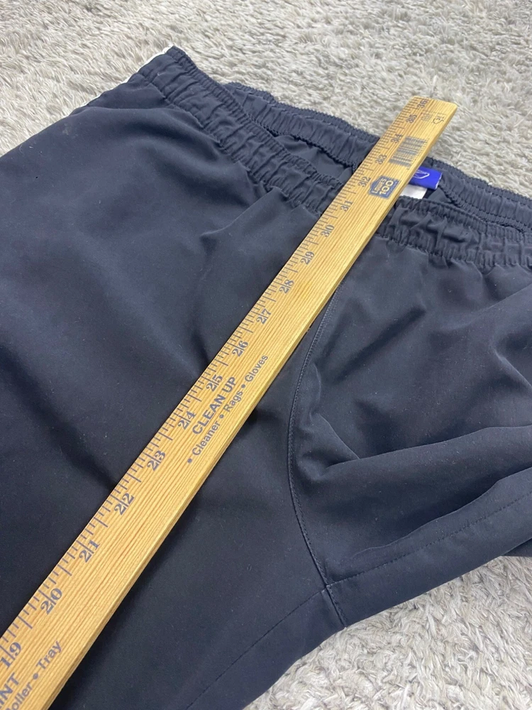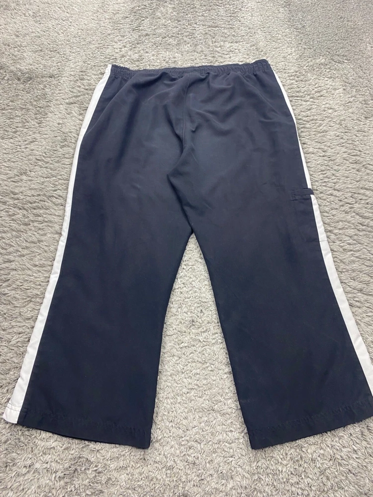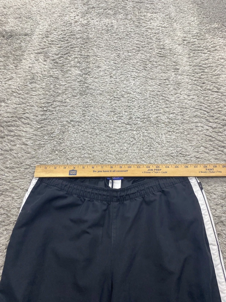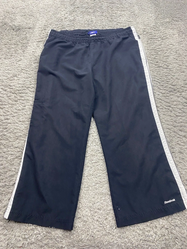 Theme: 90s, Sports Vintage: Yes Closure: Drawstring Size Type: Regular Leg Style: Wide-Leg Type: Pants Size: L Brand: Reebok Product Line: Reebok CrossFit Occasion: Activewear Garment Care: Machine Washable Style: Track Pants Department: Men Pattern: Striped Fabric Type: Blended Fabric Color: Black Material: Polyester Features: Elastic Waist, Lined, Pockets Fit: Relaxed