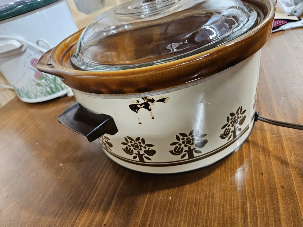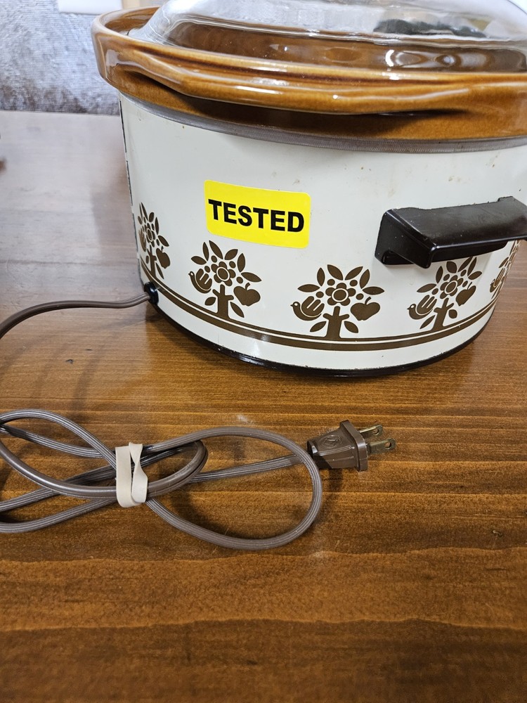 Just needs slight cleaning, some spots on outside need wiping/scrubbed off. Has been tested. The Vtg Rival Crock-Pot Slow Cooker is a charming addition to any retro kitchen, with its brown color and floral bird design. This 4 Quart slow cooker is made of durable stoneware and features a glossy finish. It has a power source of 160W and operates with three settings/programs. This electric slow cooker is portable and easy to clean, making it a convenient and stylish appliance for your home cooking needs.