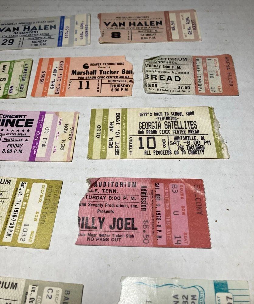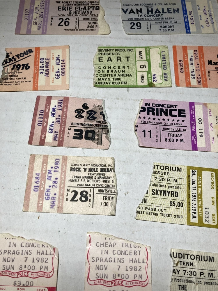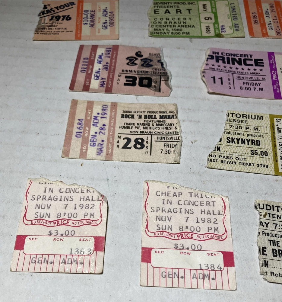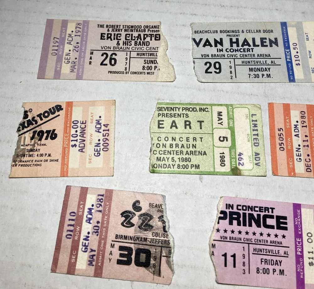 This vintage collection of concert ticket stubs takes you back to the glory days of rock music in the 70s and 80s. Featuring performances by legendary acts such as Van Halen, Prince, Cheap Trick, Heart, and ZZ Top and more! This is a must-have item for any music memorabilia collector. Each ticket stub is an original piece, making this collection a true gem for fans of classic rock. The lot will ship out safely and securely the same or next business day.